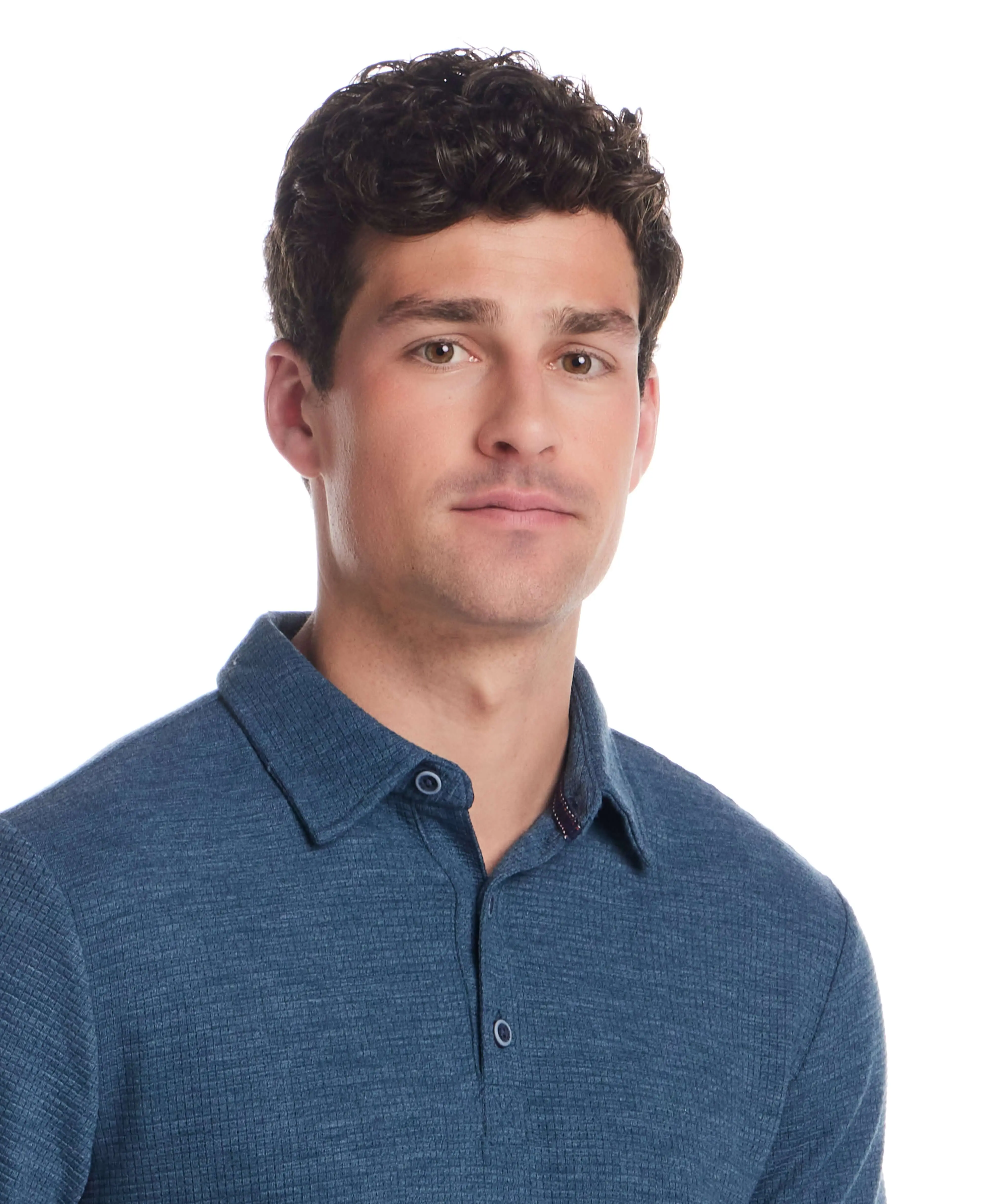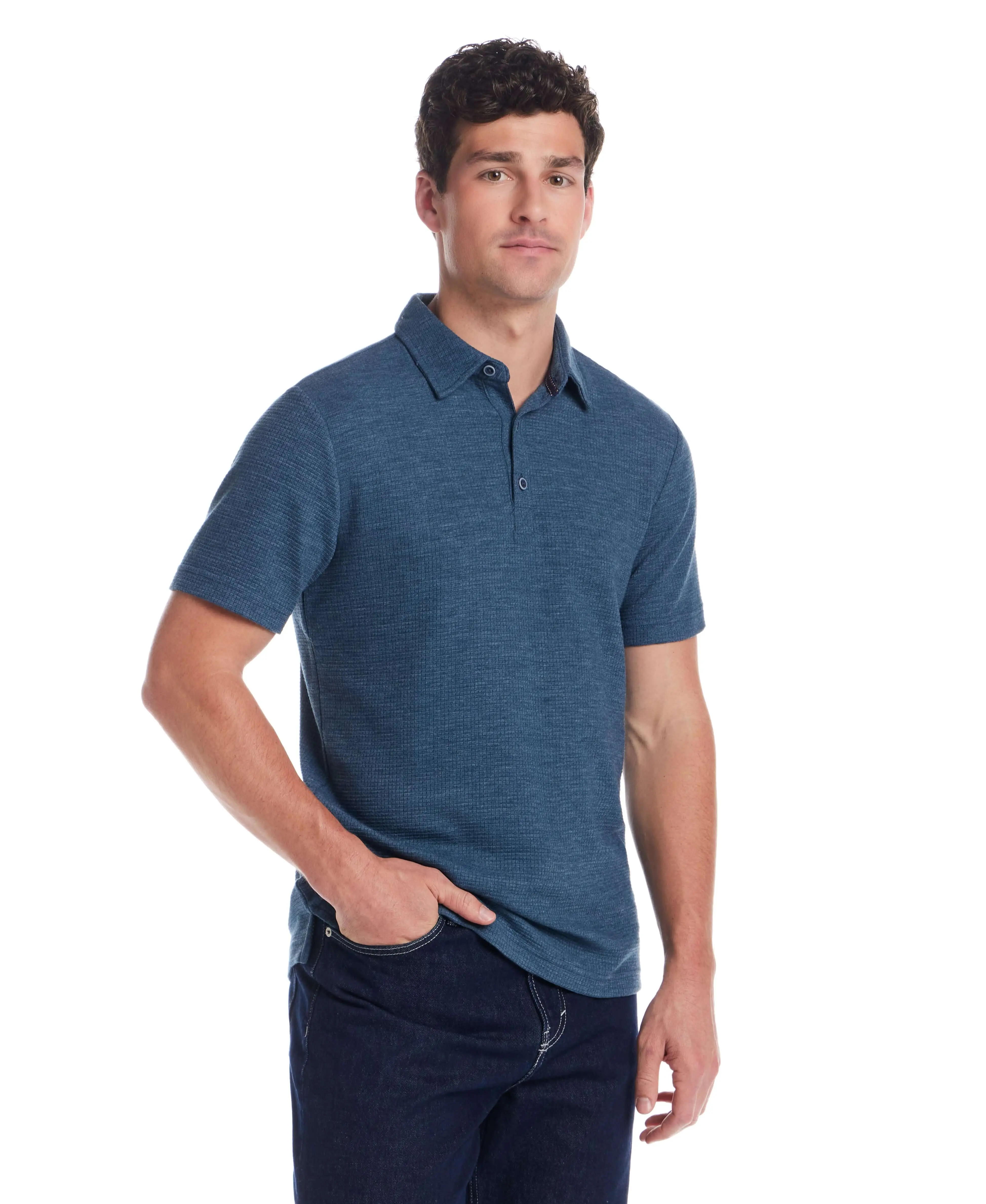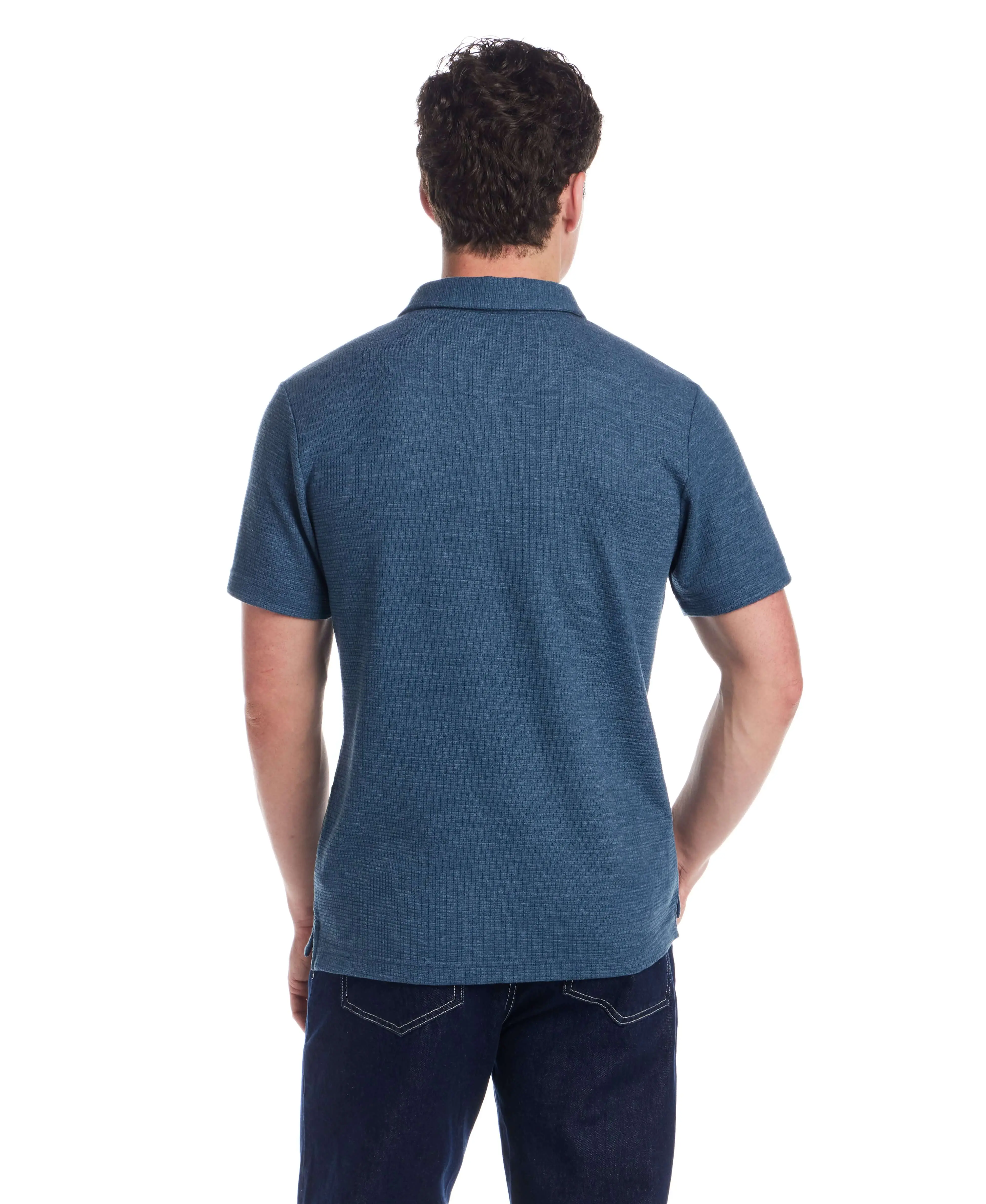 A modern take on the classic polo, this version is knit in a lightweight stretch waffle fabric that adds subtle texture and comfort. Easy to wear on its own or layered under a jacket, it’s an effortless go-to for warm days.
