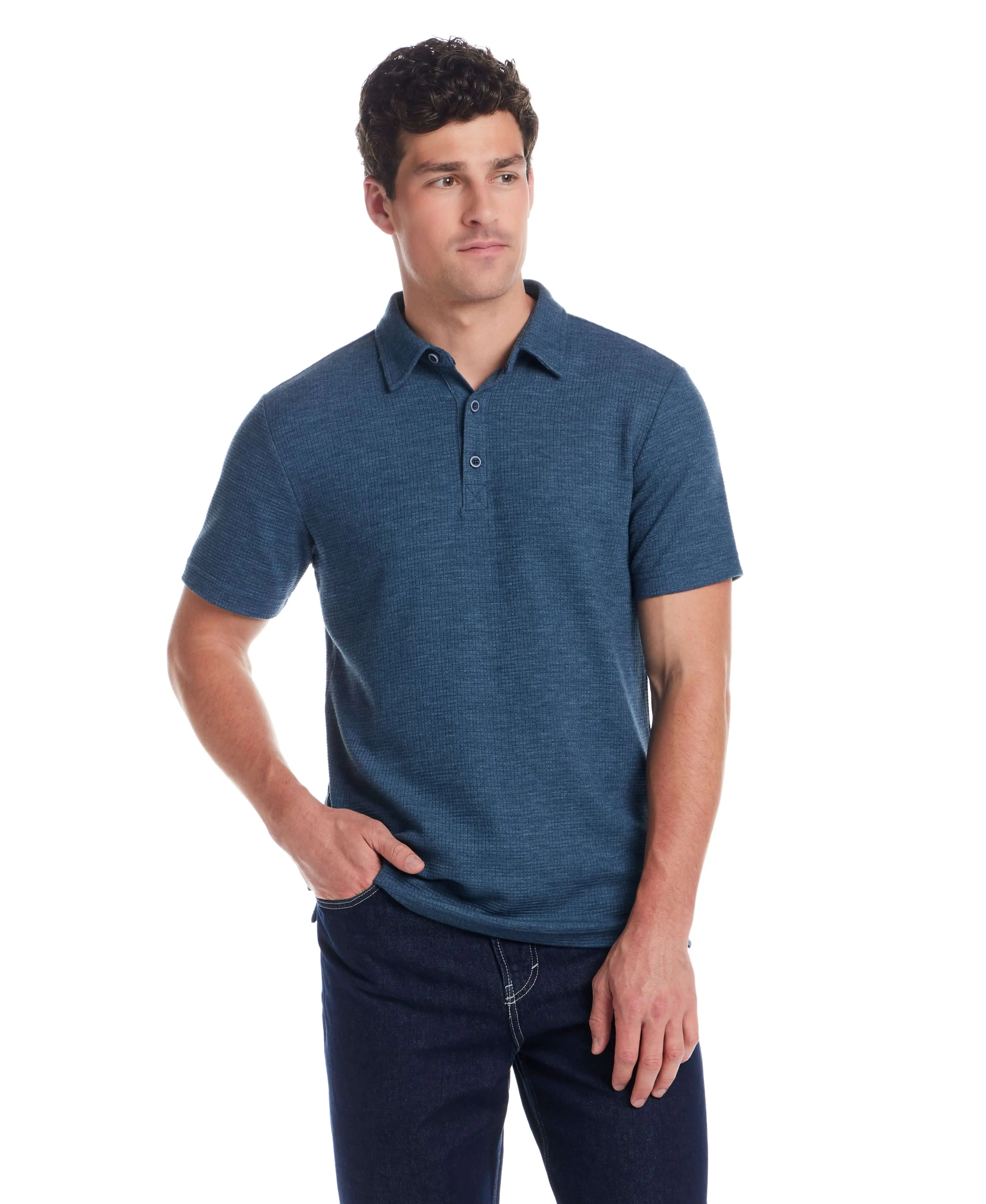 Fit: Classic shape — roomy, but not boxy. Detail: Stretch waffle fabric, polo collar, three-button placket. Material: 64% Polyester, 34% Viscose, 2% Spandex Model: is 6'1" wearing size Medium Care: Machine washable