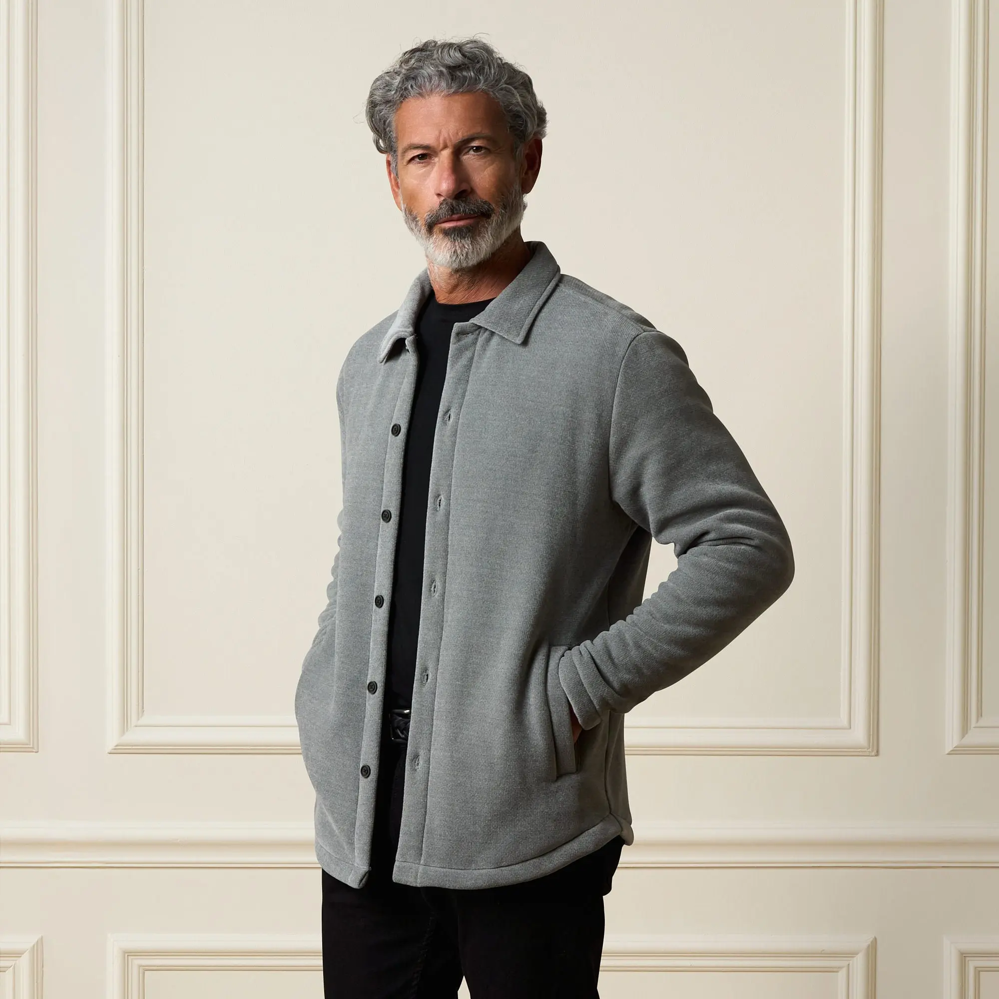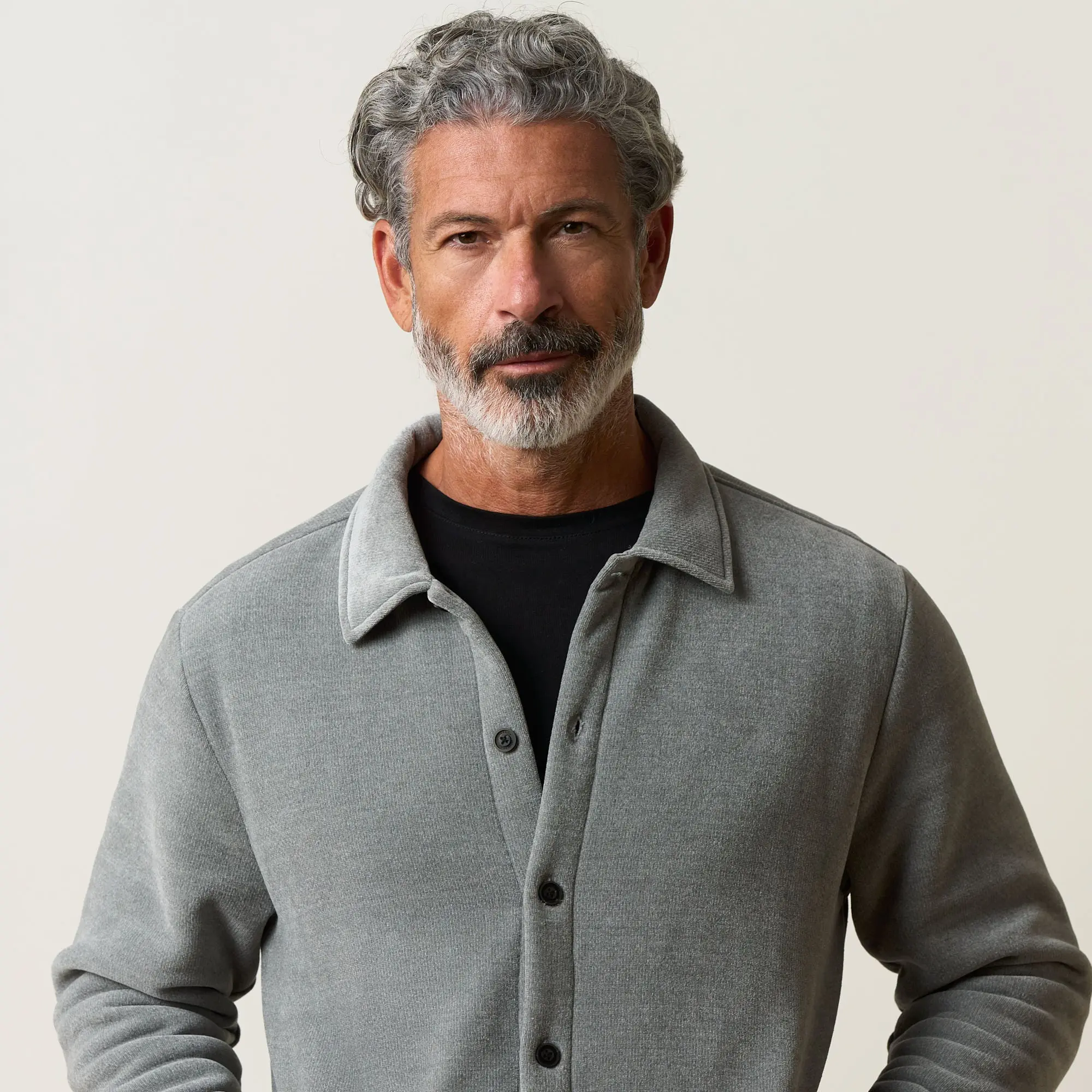 Button-up shirt jacket made of soft brushed corded fabric. Designed for comfort and ease, this versatile layer adds warmth and texture to any outfit. Also known as a shacket, this piece bridges the gap between a casual shirt and a structured jacket.