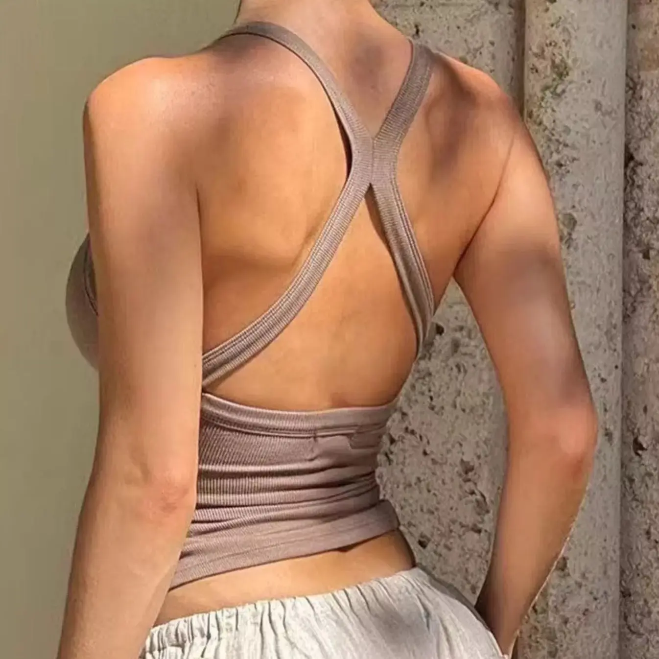 Elevate your wardrobe with this sleek, form-fitting criss cross back tank top. Blending Y2K style with modern comfort, it features a dramatic open back with a deep V-Neck. This breathable tank offers a flattering, body-contouring silhouette and is perfect for effortless styling.