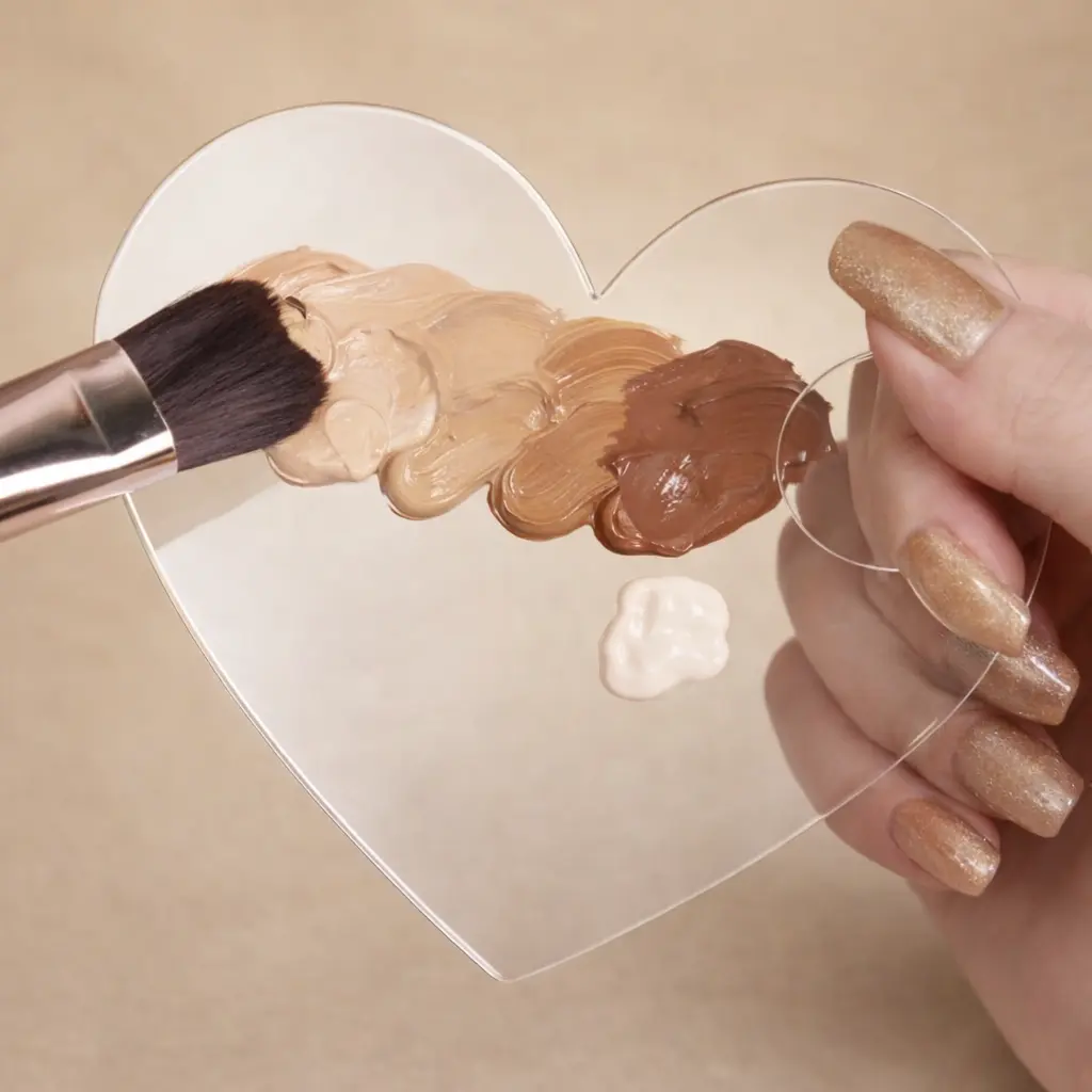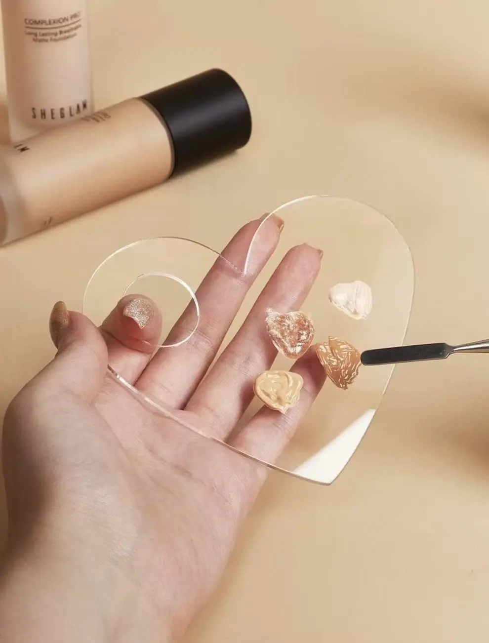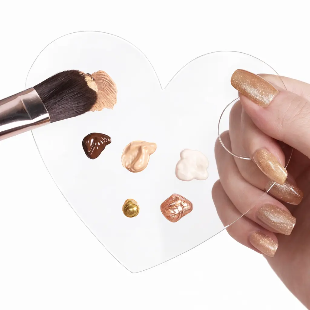 Style:Heart ShapeColor:ClearDescription:Clear heart shape makeup mixing palette that helps keep hands clean while using makeup. Good for mixing foundation, cream, concealer, and other beauty products. Simple, light, and easy to use for daily makeup.