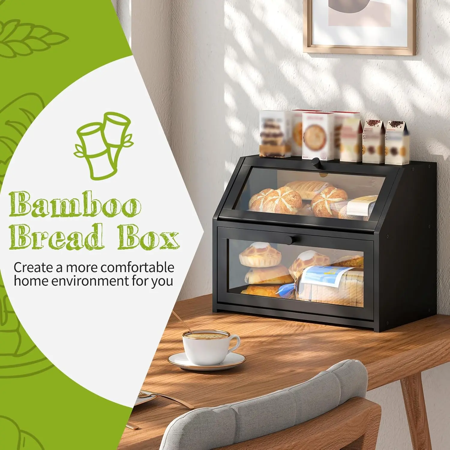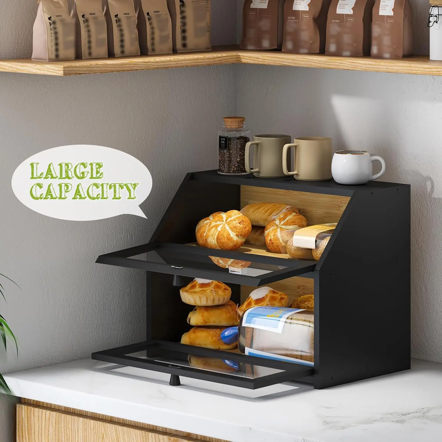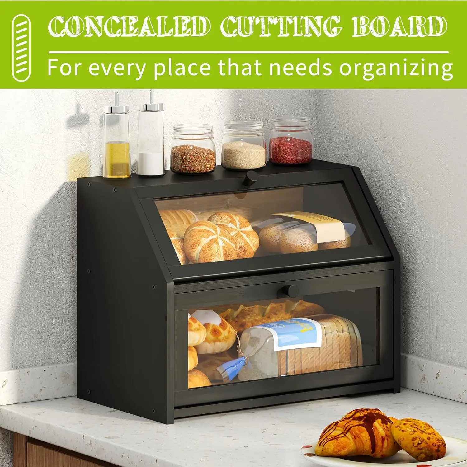 Farmhouse Bread Box for Kitchen Countertop Bread box Double Layer Bamboo Wooden Extra Large Capacity Bin Kitchen Food Storage Container(Black)