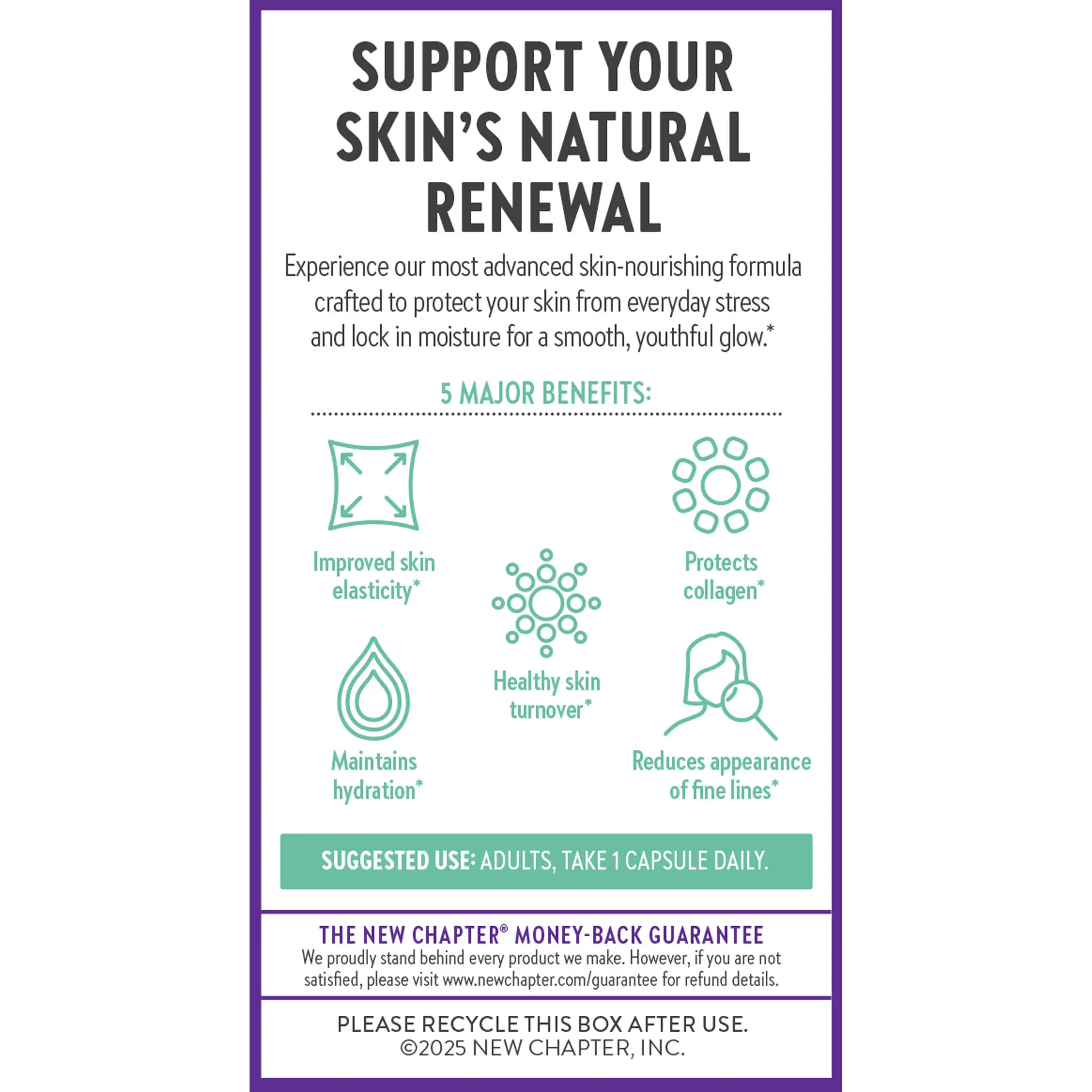 | Ingredients | Calories 30 Total Carbohydrates 7 g 3%** Vitamin A (100% as beta-carotene) 900 mcg 100% Vitamin C (as ascorbic acid) 18 mg 20% Vitamin D3 (as cholecalciferol from lichen) 14 mcg (560 IU) 70% Vitamin E (as d-alpha-tocopheryl acetate) 15 mg 100% Vitamin K (as phylloquinone [K1]) 60 mcg 50% Thiamin (as thiamine hydrochloride and from ferment media) 2.5 mg 208% Riboflavin (and from ferment media) 2.5 mg 192% Niacin (as niacinamide and as nicotinic acid from ferment media) 30 mg 188% Vitamin B6 (as pyridoxine hydrochloride and from ferment media) 2.5 mg 147% Folate (as L-5-methylfolate) 80 mcg DFE 20% Vitamin B12 (as cyanocobalamin) 2.4 mcg 100% Biotin (and from ferment media) 30 mcg 100% Pantothenic Acid (as calcium D-pantothenate and from ferment media) 5 mg 100% Choline (as choline bitartrate) 20 mg 4% Calcium (as calcium citrate) 26 mg 2% Iodine (as potassium iodide) 150 mcg 100% Magnesium (as magnesium citrate) 13 mg 3% Zinc (as zinc citrate) 5.5 mg 50% Selenium (as selenium glycinate) 55 mcg 100% Manganese (as manganese citrate) 0.04 mg 2% Chromium (as chromium picolinate) 2.3 mcg 7% Molybdenum (as molybdenum glycinate chelate) 45 mcg 100% Organic Superfood Blend Organic Elderberry (Sambucus nigra) (fruit), Organic Black Currant (Ribes nigrum) (fruit) extract, Organic Grape (Vitis vinifera) (seed) extract, Organic Acerola (Malpighia glabra L.) (fruit) 100 mg,Water, organic glycerin, natural flavors; Less than 2% of: ferment media (Saccharomyces cerevisiae, molasses), organic stevia leaf extract, purple carrot (color), malic acid, citric acid (preservative), xanthan gum.,Vitamin A (100% as beta-carotene and from ferment media) 180 mcg 20% Vitamin C (as ascorbic acid and from ferment media) 18 mg 20% Vitamin E (as d-alpha tocopheryl acetate from ferment media) 3 mg 20% Zinc (as zinc oxide from ferment media) 2.2 mg 20% Organic Haematococcus pluvialis algae Astaxanthin 6 mg 180 mg • Ceramide Peptide Blend Organic collagen peptides (from grass-fed cattle), Konjac (Amorphophallus konjac) root extract 120 mg • • Daily Value (DV) not established Other ingredients: Organic capsule (organic pullulan, purified water, sodium alginate), ferment media (organic soy flour, organic Saccharomyces cerevisiae, organic orange peel powder, organic carrot powder, lactic acid bacteria [L. acidophilus, L. rhamnosus, B. bifidum], papain [deactivated], bromelain [deactivated]), organic ground rice hulls, organic MCT oil, silica.,Other ingredients (Mixed Berry): Water, organic glycerin, natural flavors; Less than 2% of: ferment media (Saccharomyces cerevisiae, molasses), organic stevia leaf extract, purple carrot (color), malic acid, citric acid (preservative), xanthan gum. |