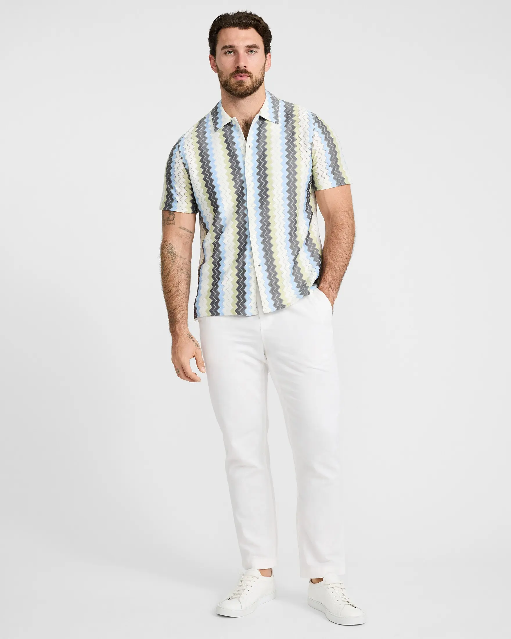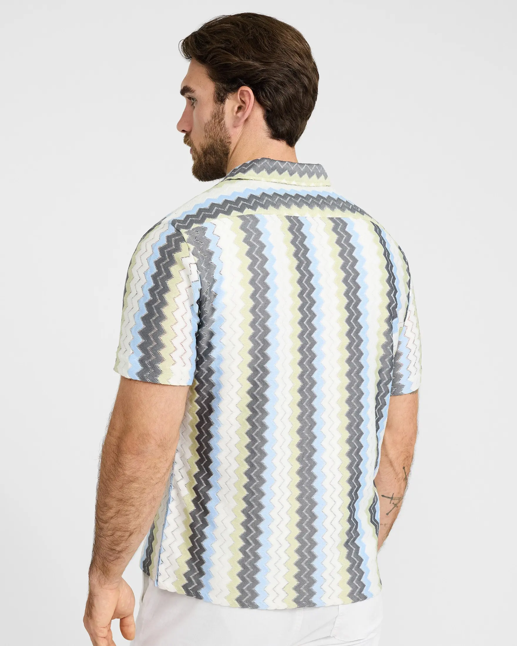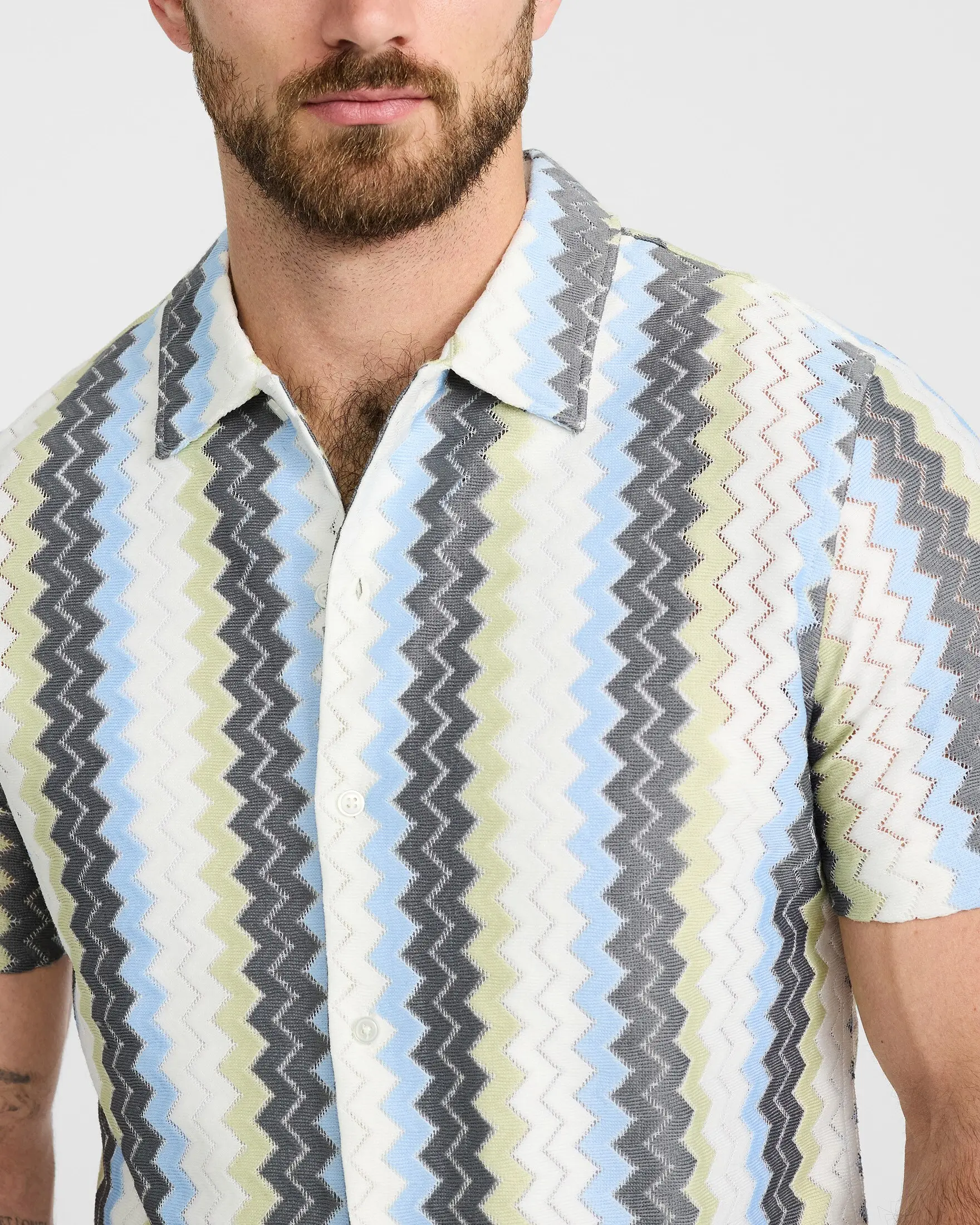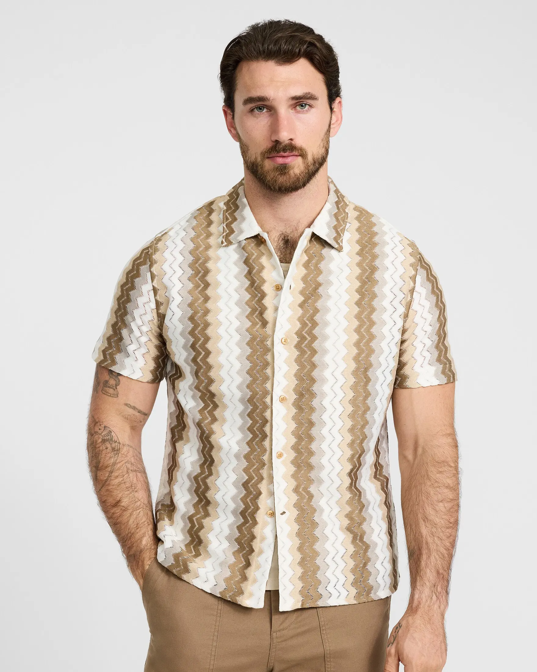 This button-down shirt features short sleeves, a classic point collar, a full button front, and a textured zig zag striped print. Perfect for layering open with your favorite tan for an easy warm weather style.