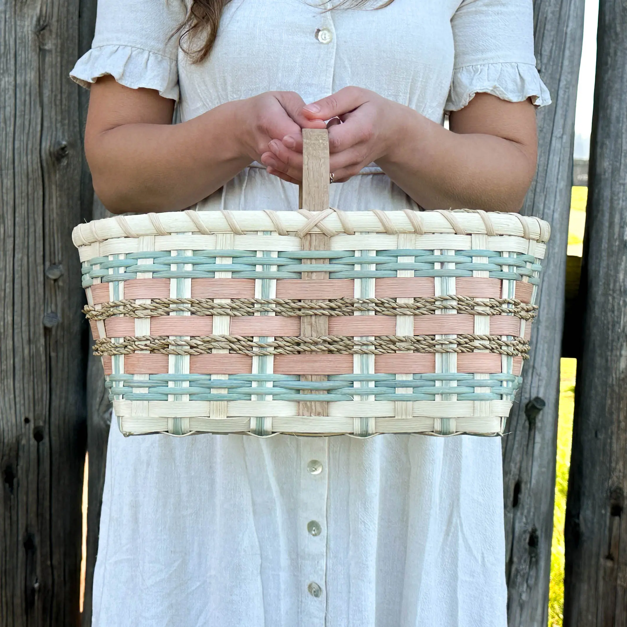 Brittany wove Kitty from rattan reed, by hand, start to finish—and then she wove in color. Bands of blush and sage run through the natural reed, creating a texture that feels less like a pattern and more like shifting light.