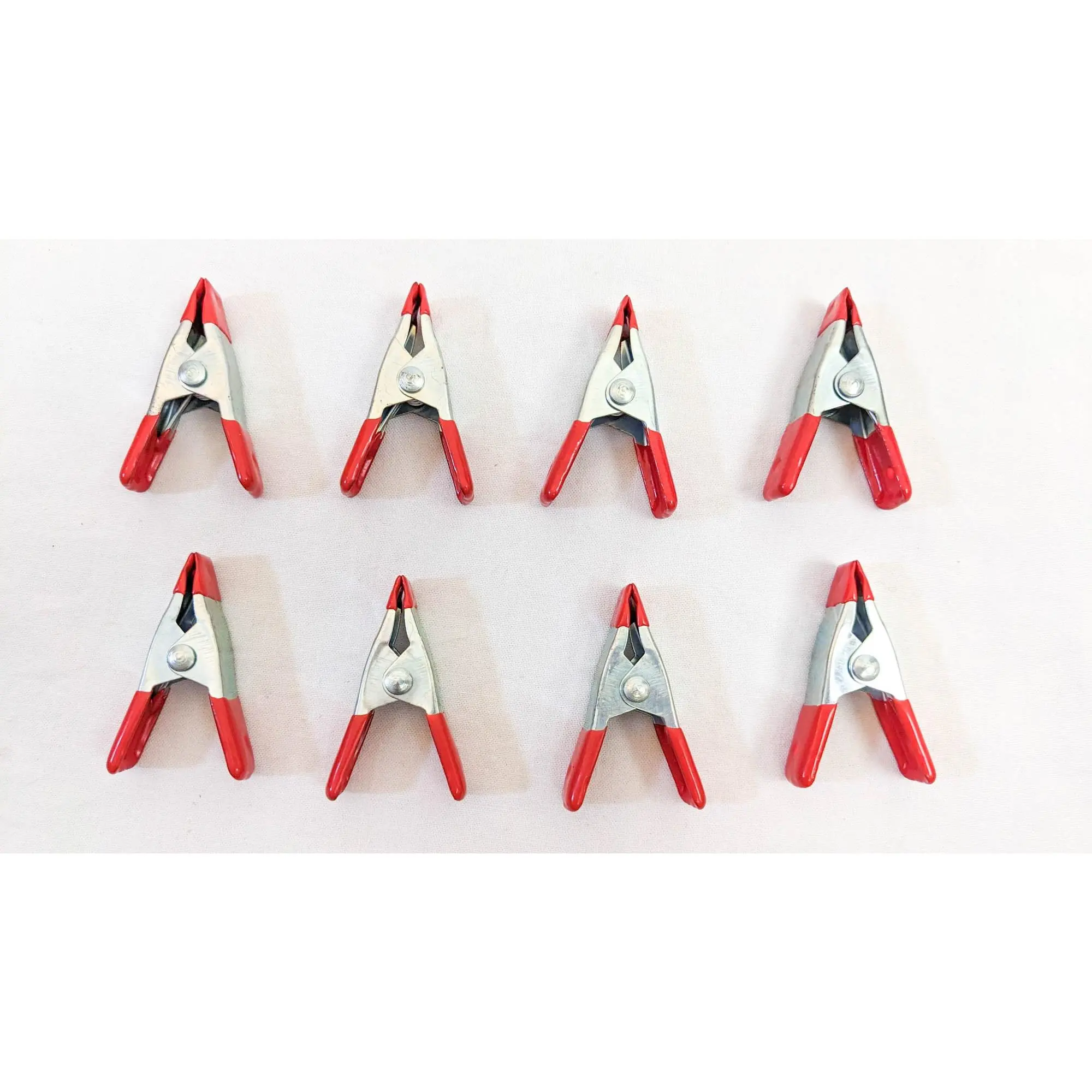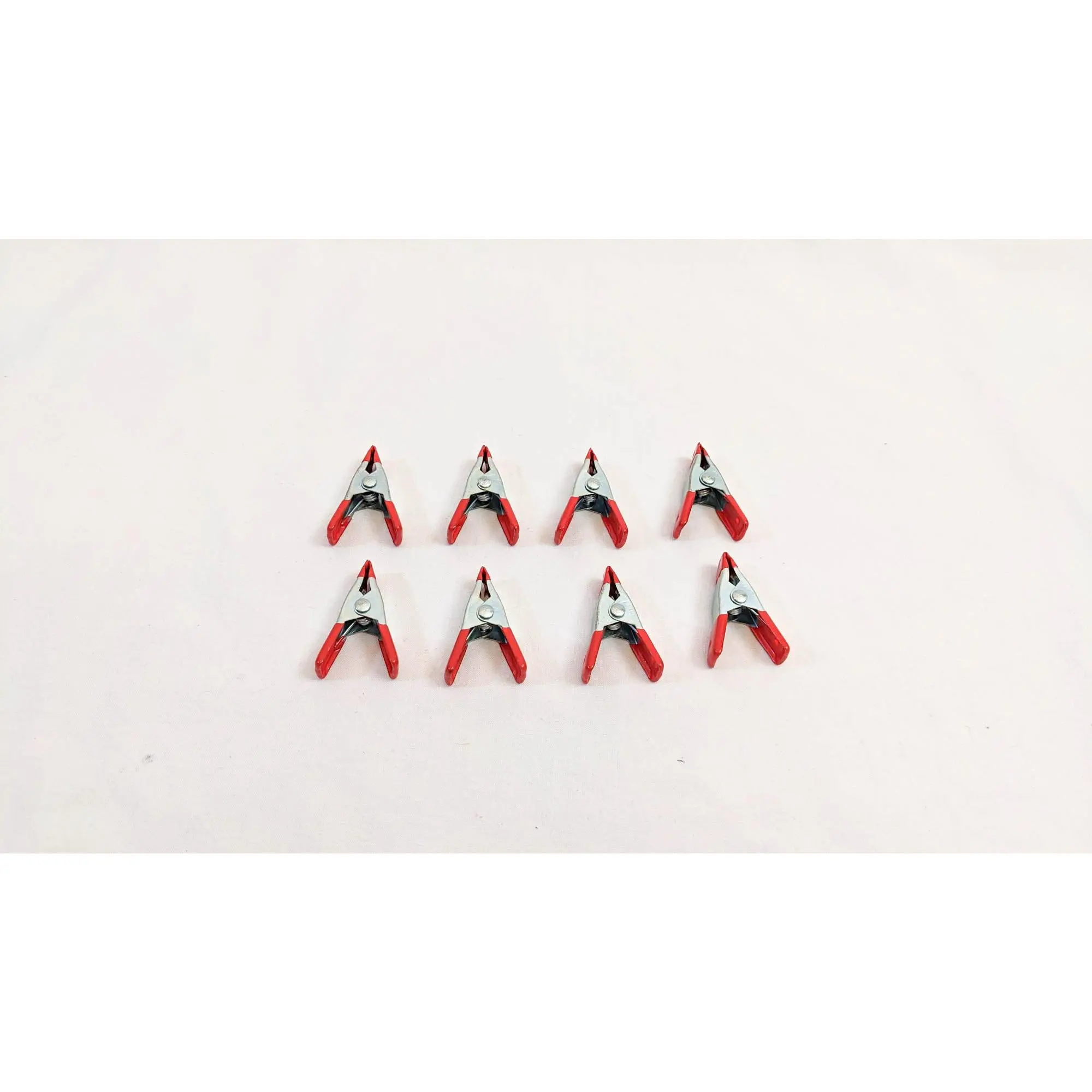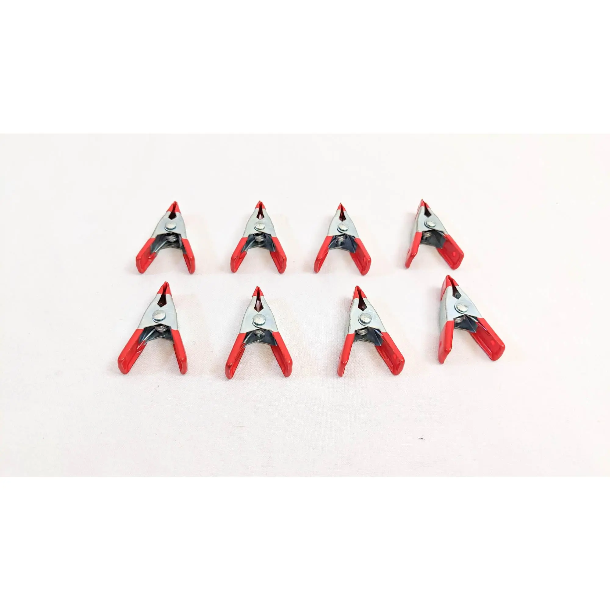 Set of 8 metal spring clamps. These clamps are two inches long and open about one inch when the clamp is opened.