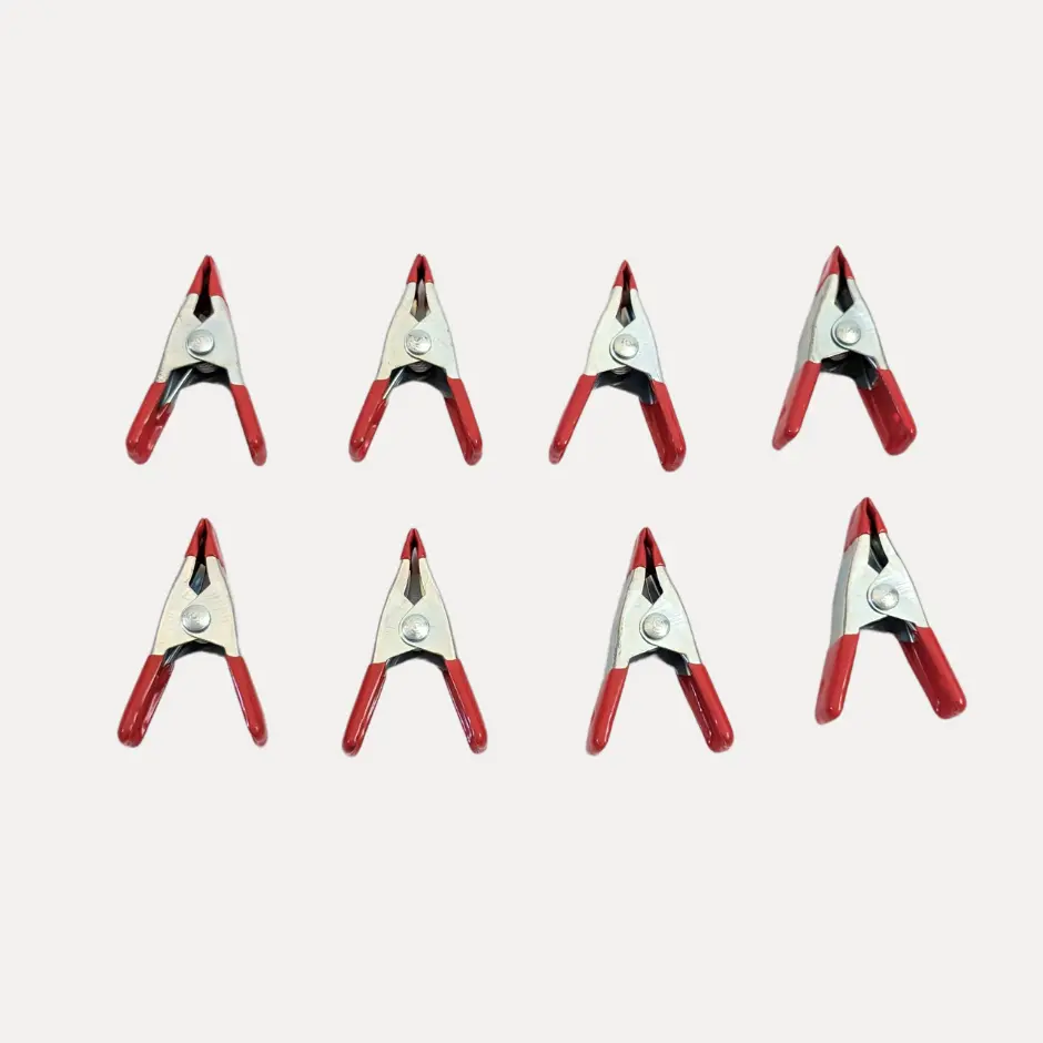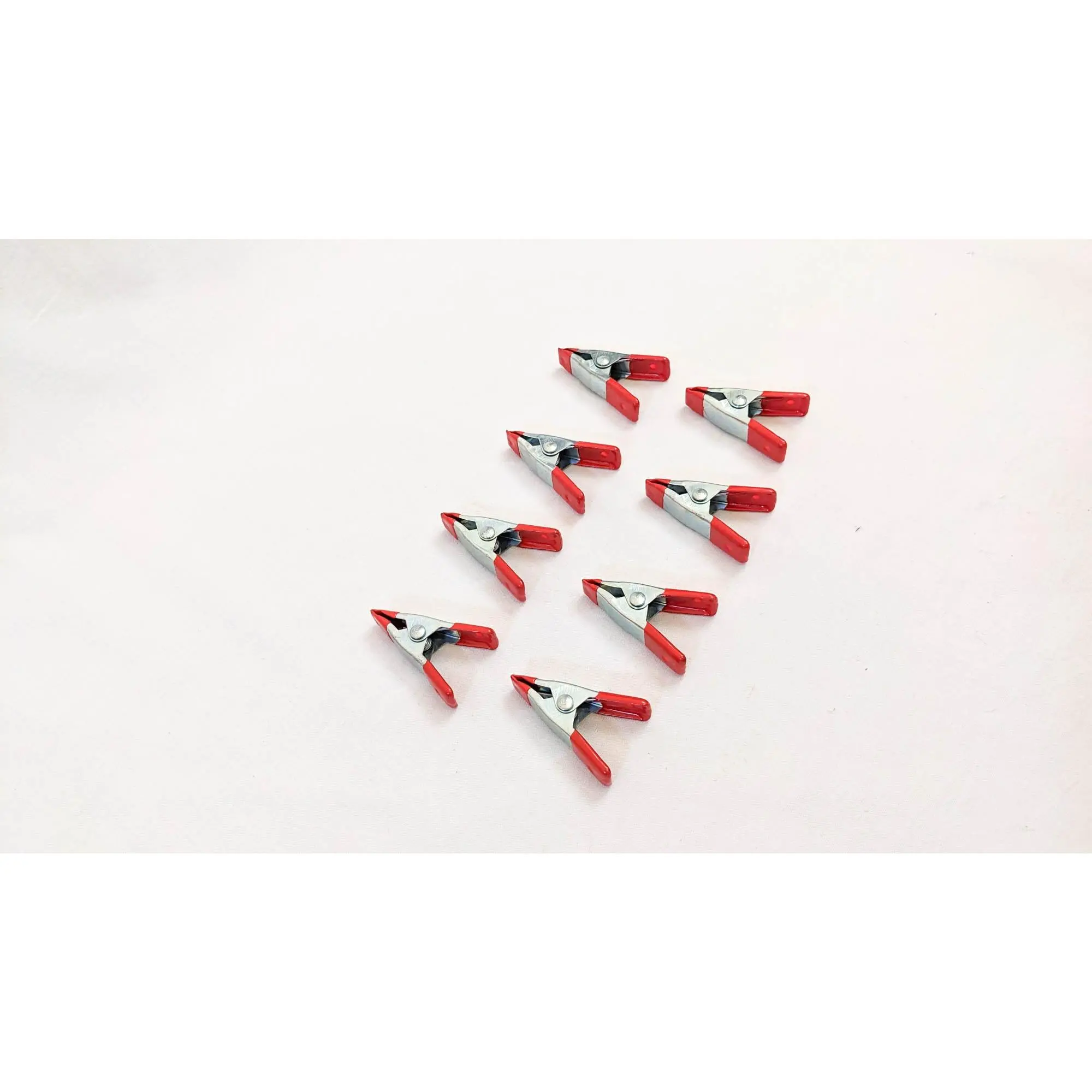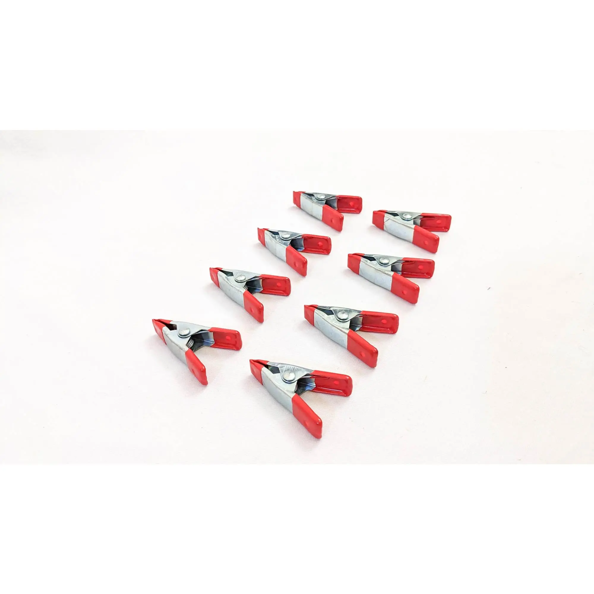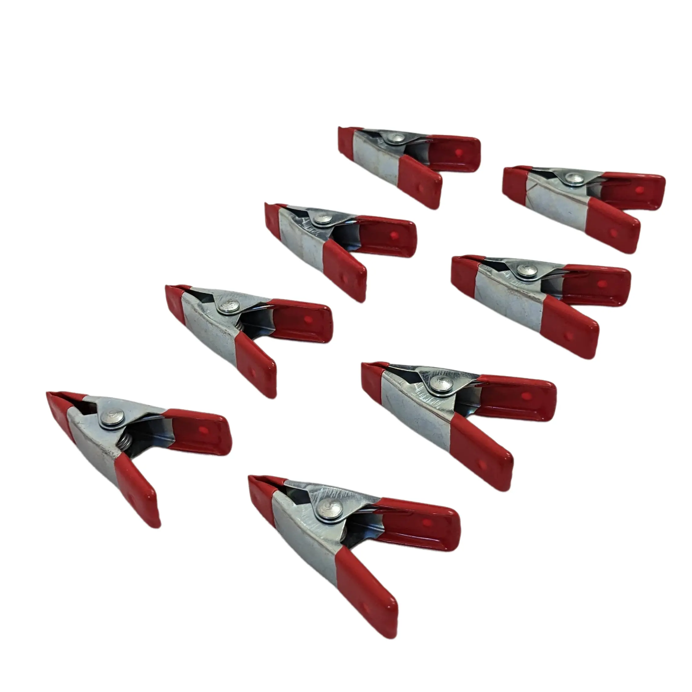 Set of 8 metal spring clamps. These clamps are two inches long and open about one inch when the clamp is opened.