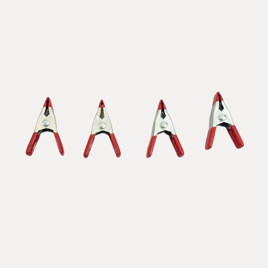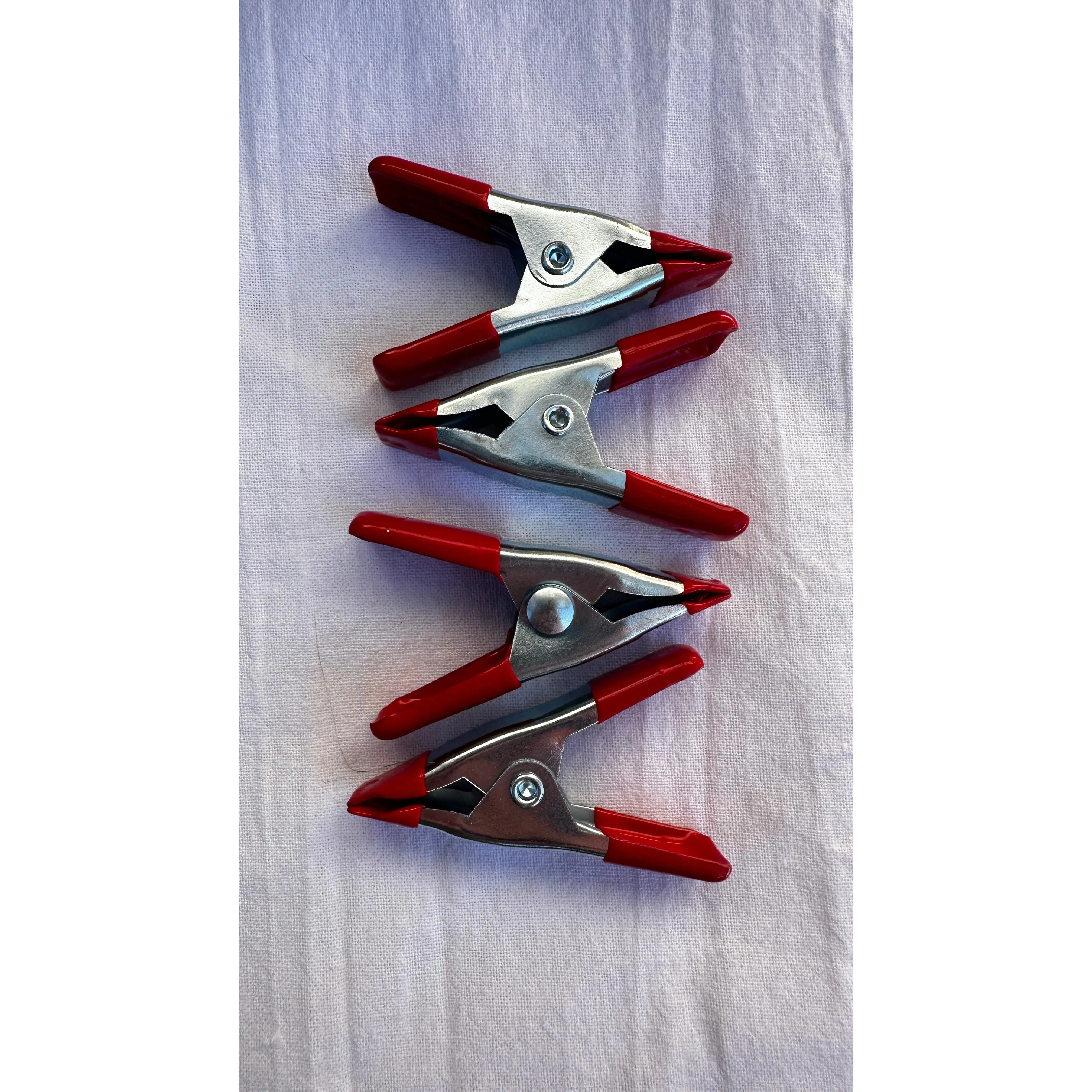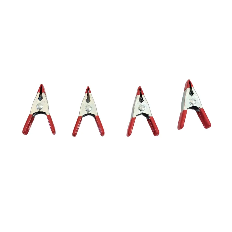 Set of 4 metal spring clamps. These clamps are two inches long and open about one inch when the clamp is opened.
