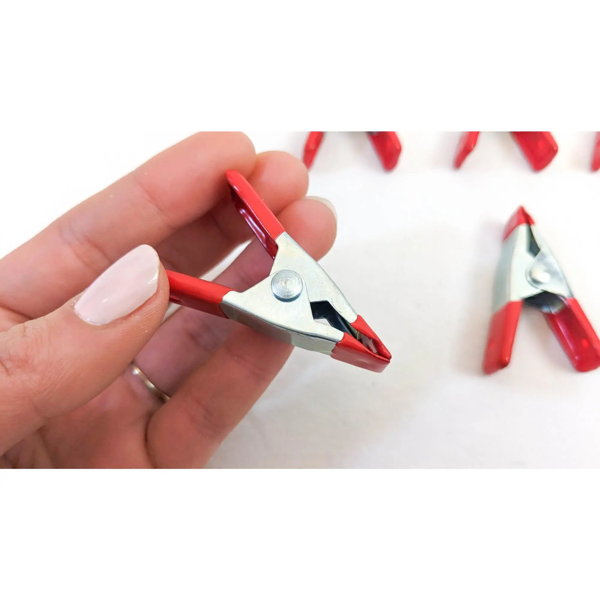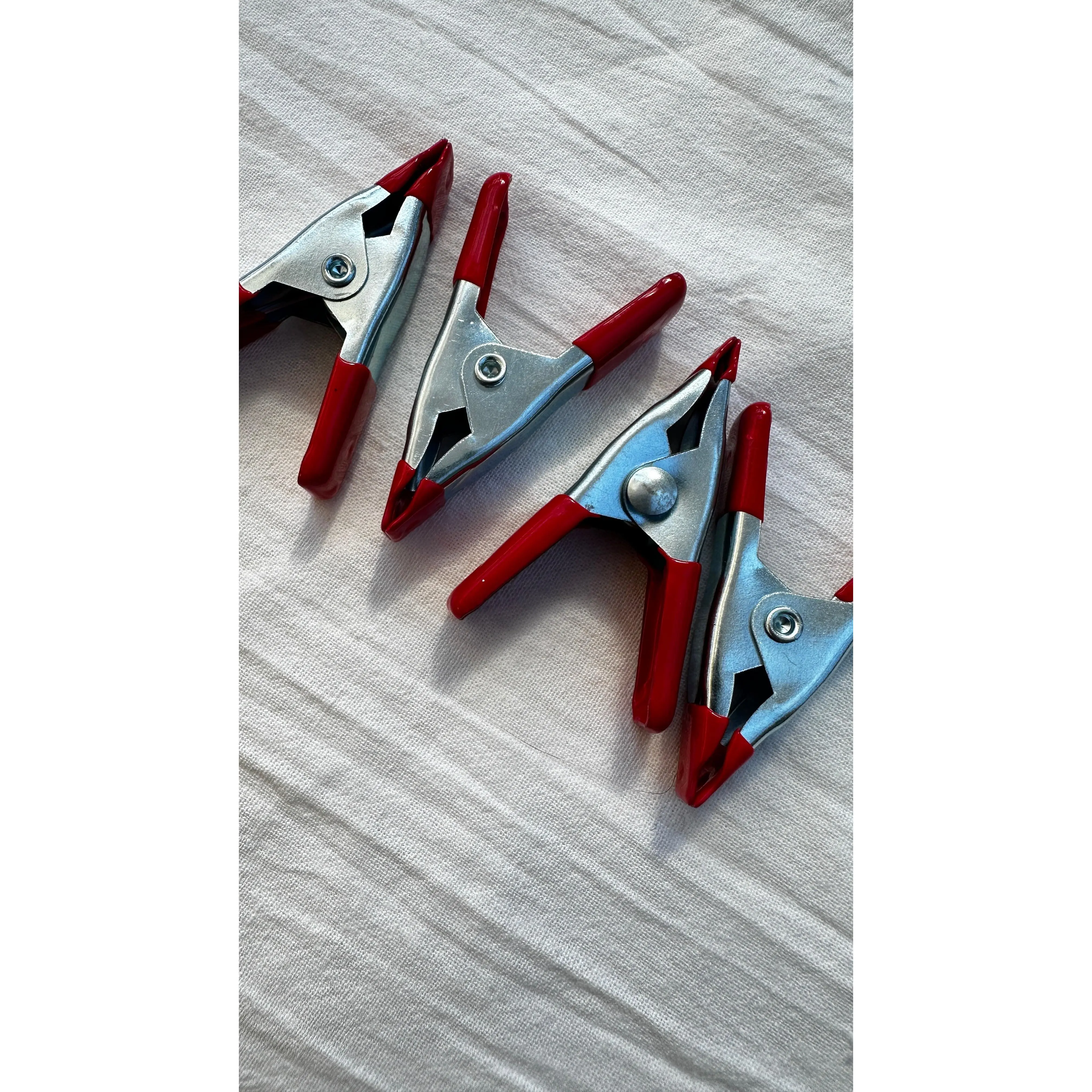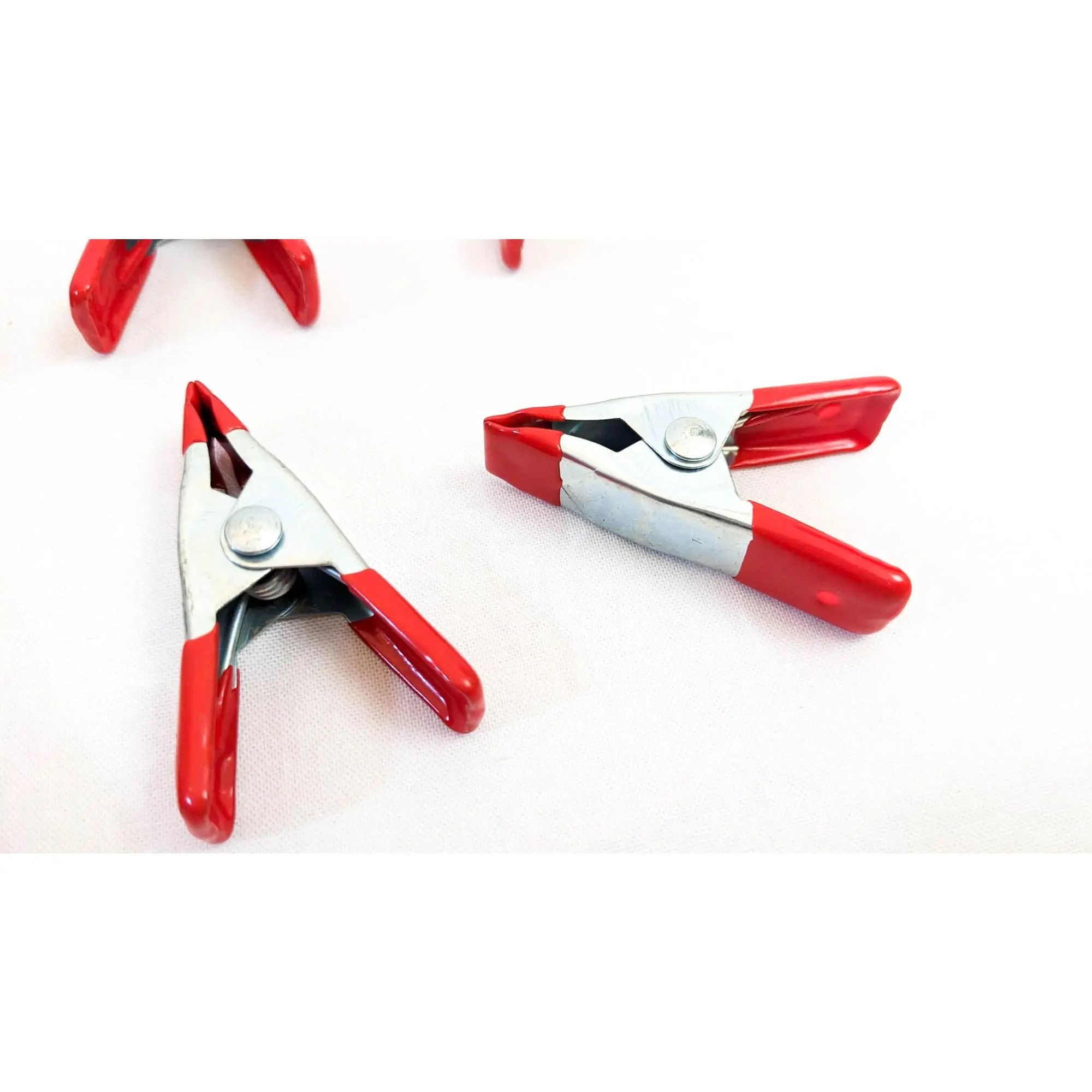 Set of 4 metal spring clamps. These clamps are two inches long and open about one inch when the clamp is opened.