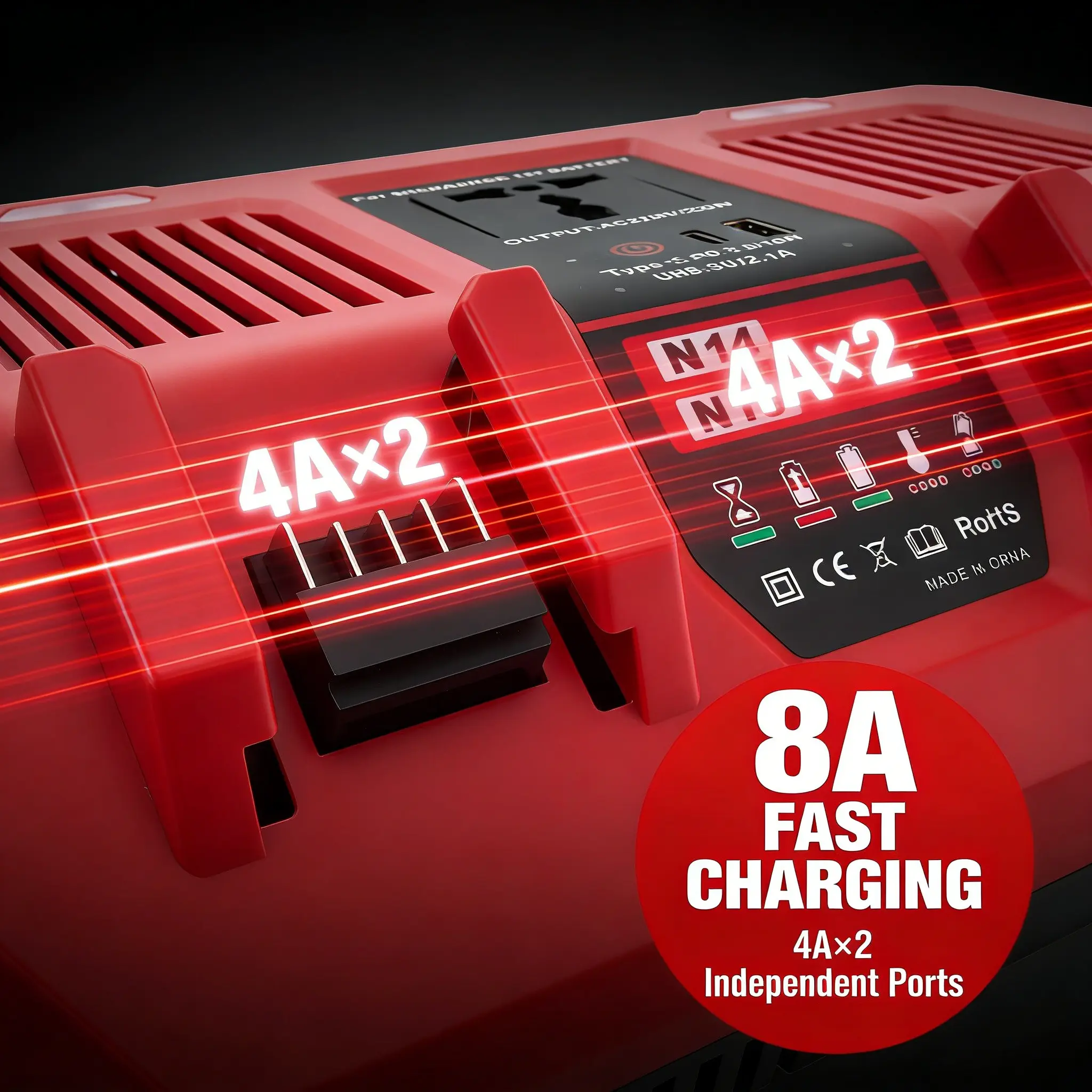 This dual battery charger is specially designed to fit Milwaukee M18 14.4V/18V batteries, bringing efficient and stable charging experience for your power tool batteries. Equipped with 8A high-power fast charging (4A×2 independent charging slots), it realizes simultaneous fast charging of two batteries without mutual interference, greatly shortening charging waiting time and improving your work efficiency—an ideal charging solution for professionals who pursue high efficiency.