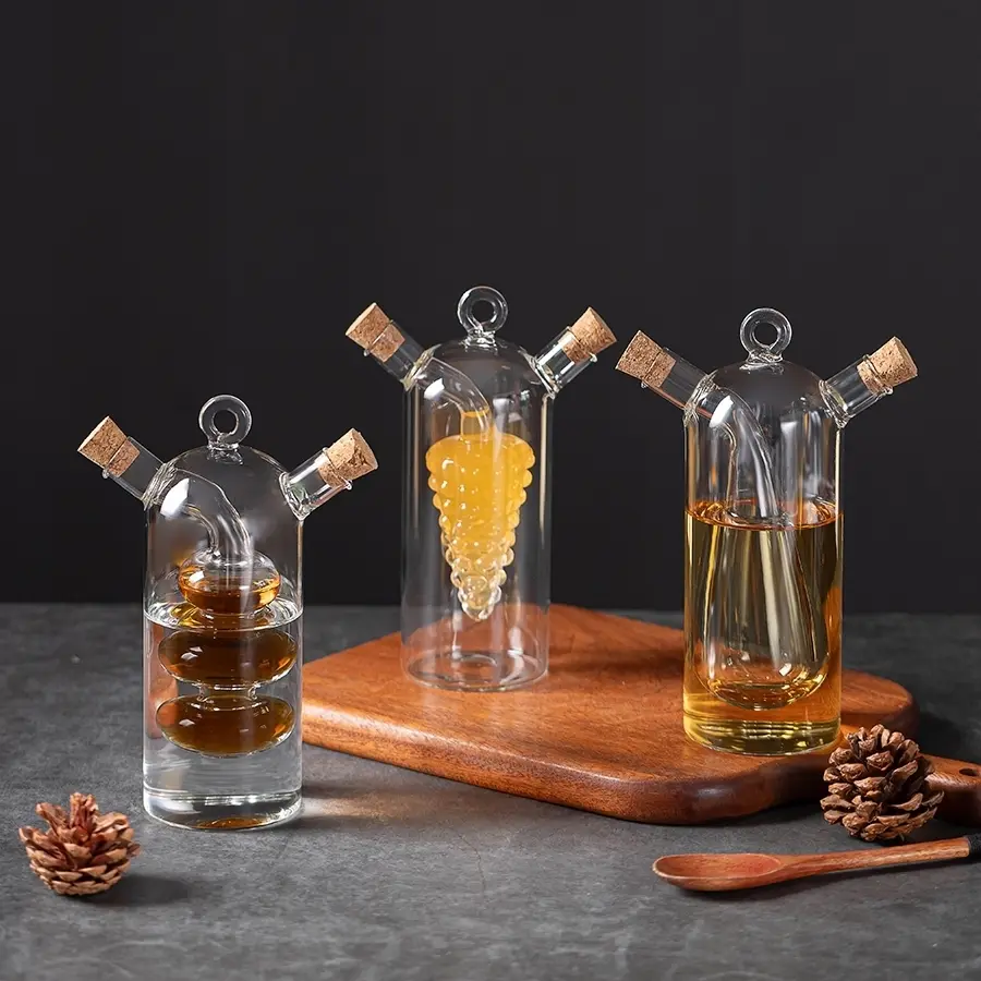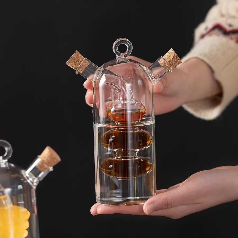 2-In-1 Glass Olive Oil & Vinegar Dispenser with Cork Stopper, Transparent Kitchen Cooking Container, Dual Nozzle Design, Kitchen Essentials