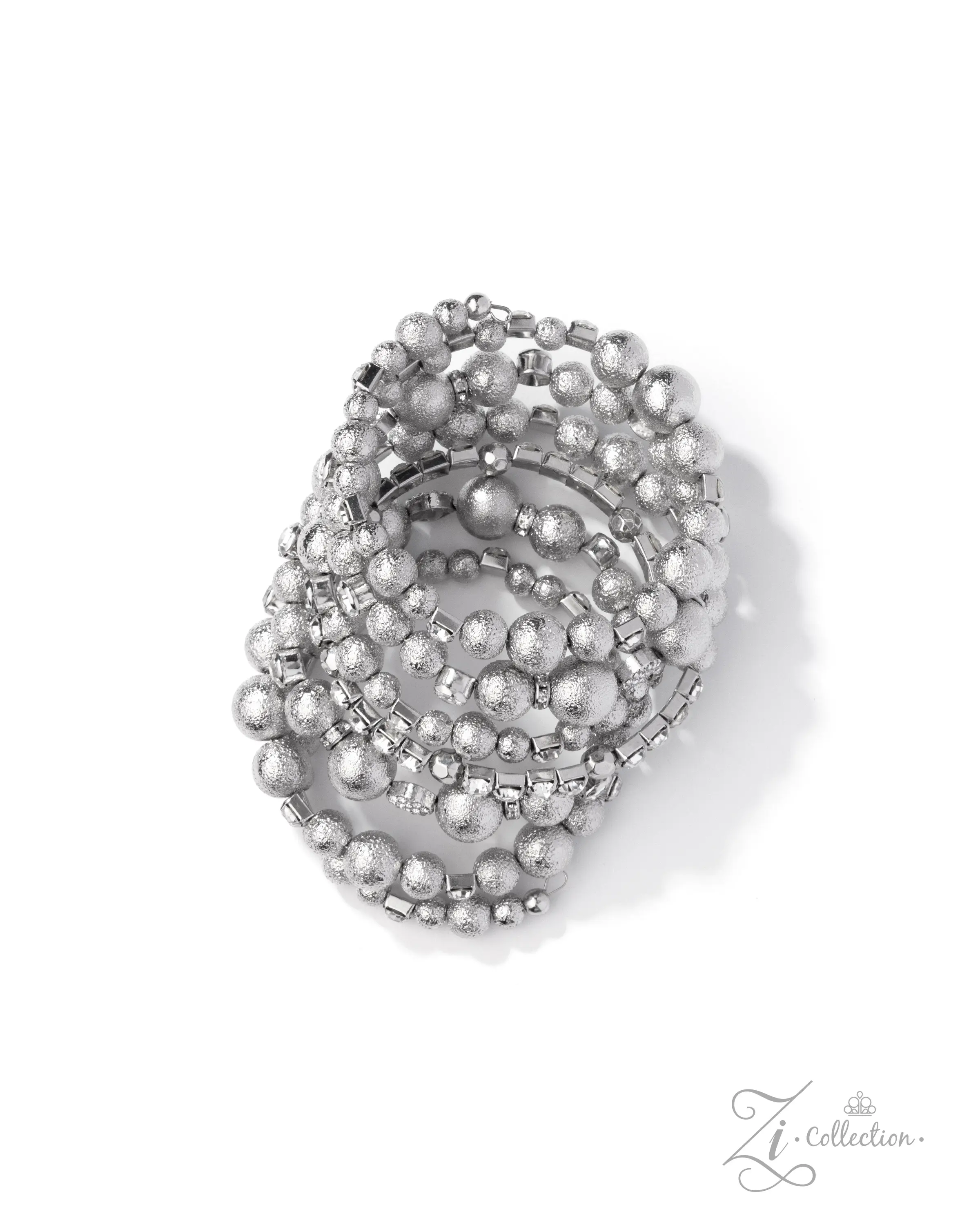 Featuring various dazzling dimensions, a collection of subtly textured silver beads in varying sizes, white gems in elevated round silver fittings, white rhinestones in square silver fittings, silver accents, diamond-shaped beads dusted in white rhinestones, and white rhinestone-embellished silver discs are threaded along an invisible wire that coils around the wrist. Each flick of the wrist captures a different detail, showcasing the infinity wrap’s irresistible shimmer and range of refinement. Sold as one individual bracelet. Intended for adult use.