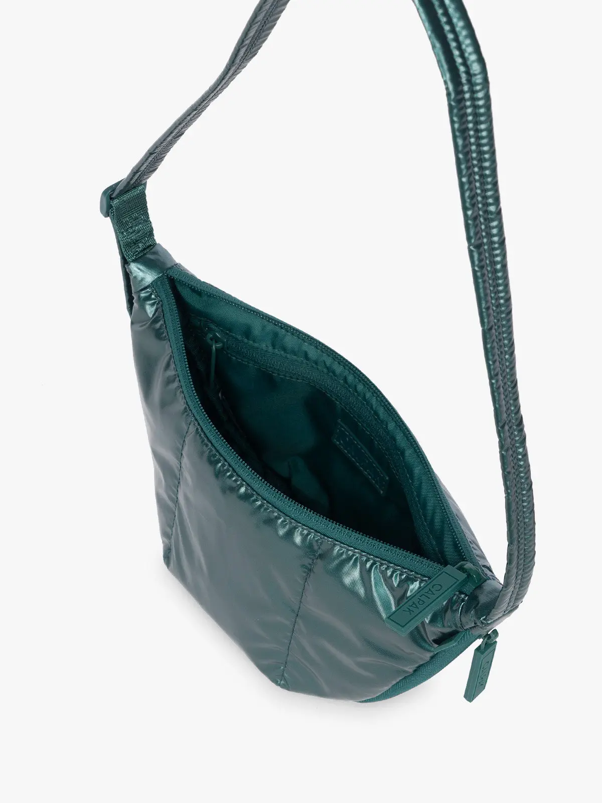 The Luka Crescent Bag is a lightweight crescent bag designed for everyday versatility with a soft, puffy silhouette that moves with you. Crafted from durable, water-resistant material with a comfortable adjustable strap, it blends effortless style with functional organization. The expandable design and multiple interior pockets keep essentials secure while maintaining a relaxed shape that transitions seamlessly from errands to travel.