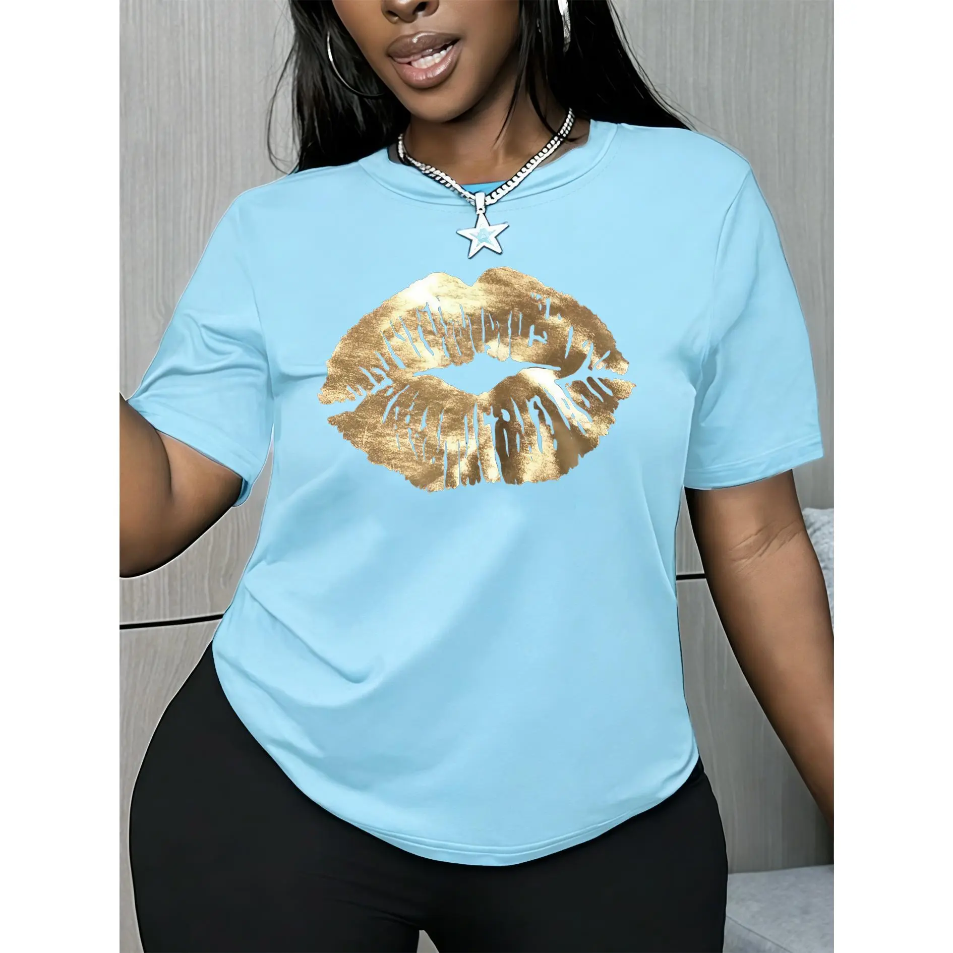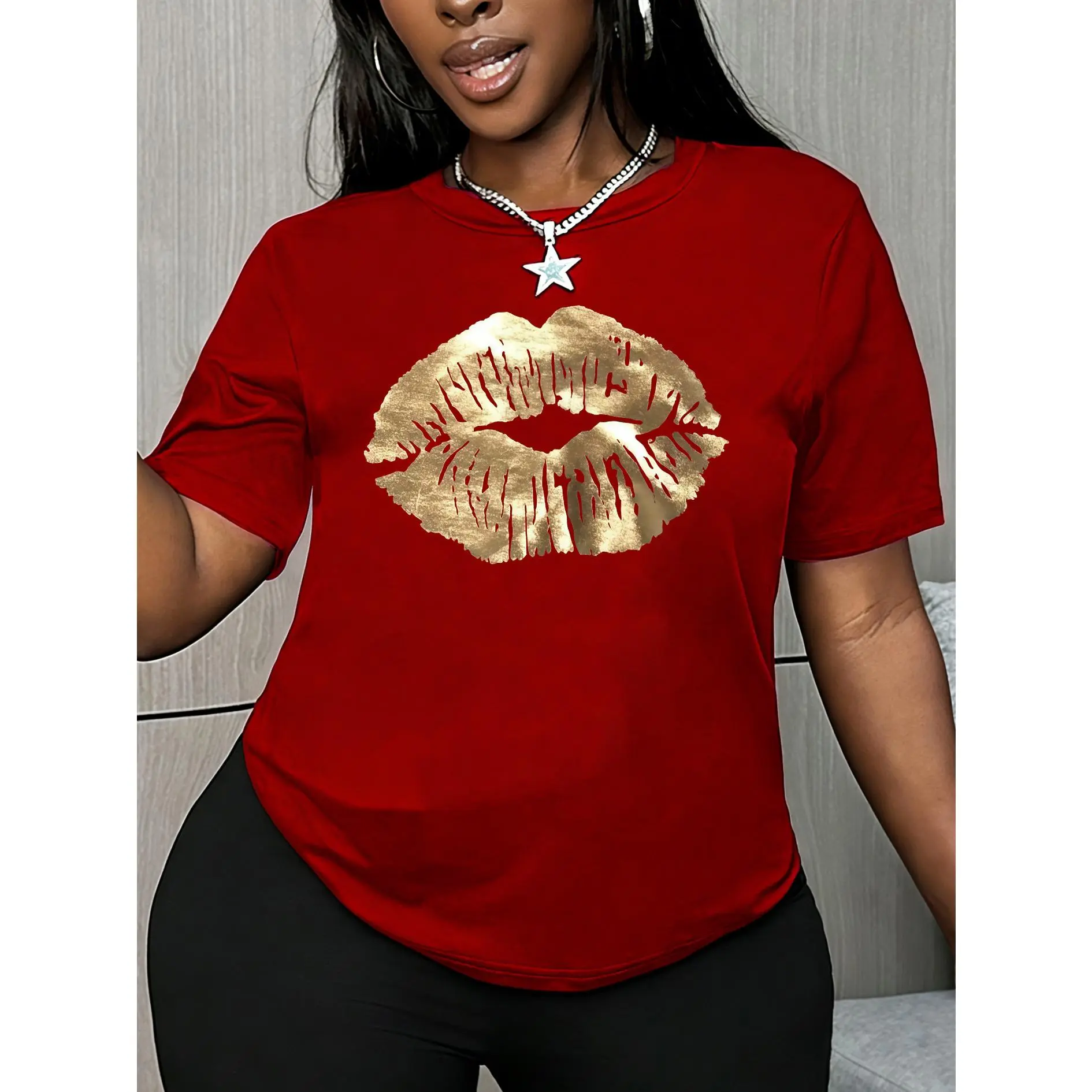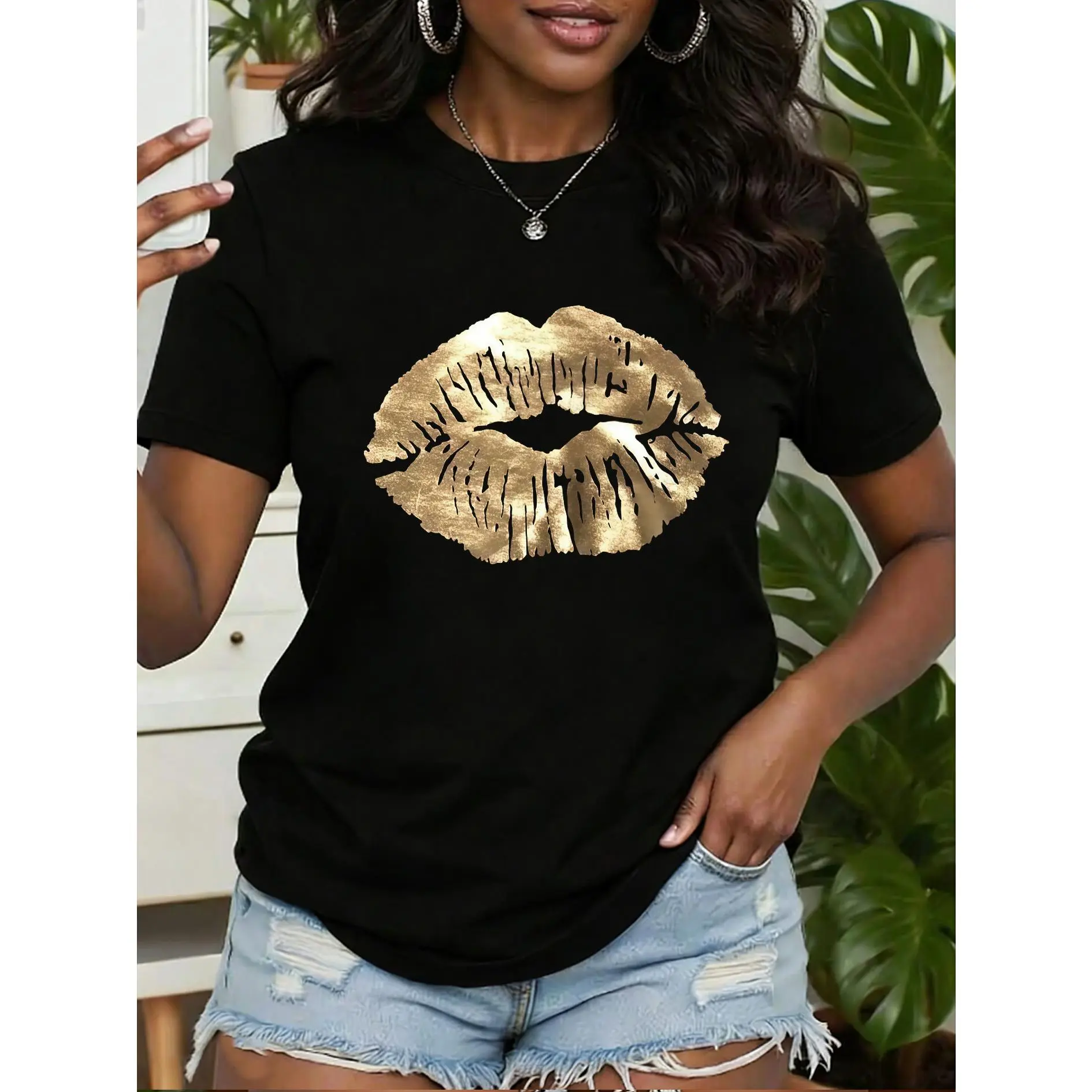 Women's short-sleeve top with gold-embossed large lips, luxurious and high-end print, round neck, machine washable, comfortable, soft, breathable, suitable for spring, summer, and autumn. New recommended style, loose and casual