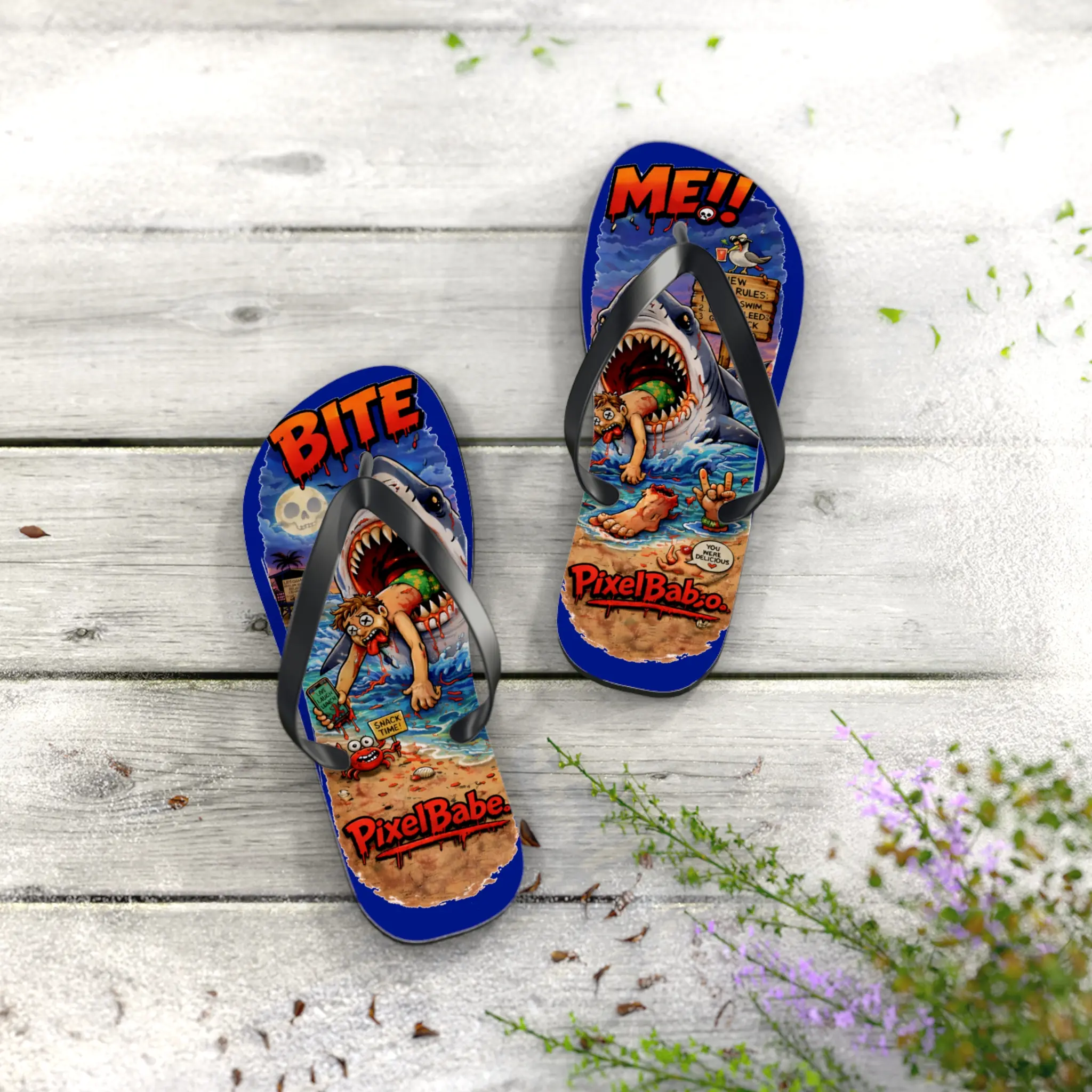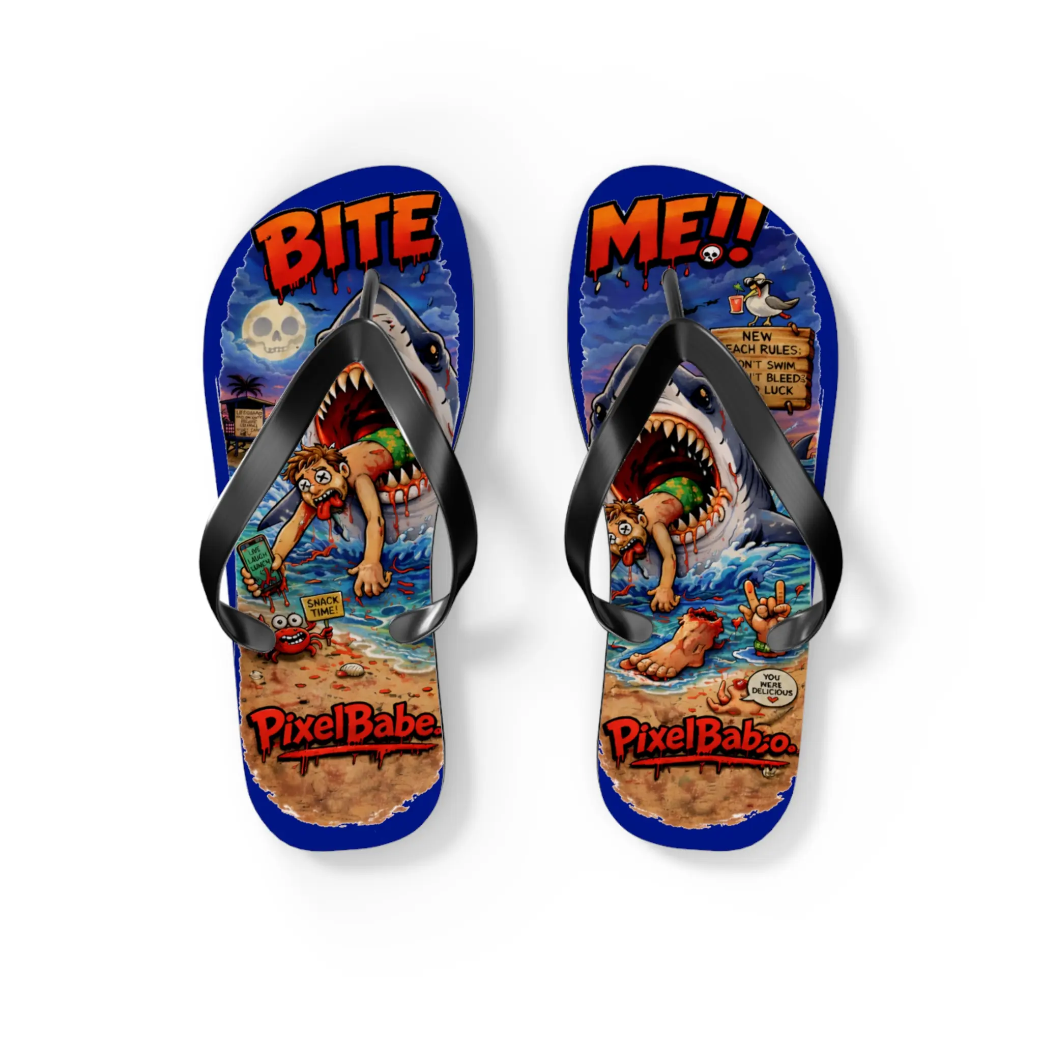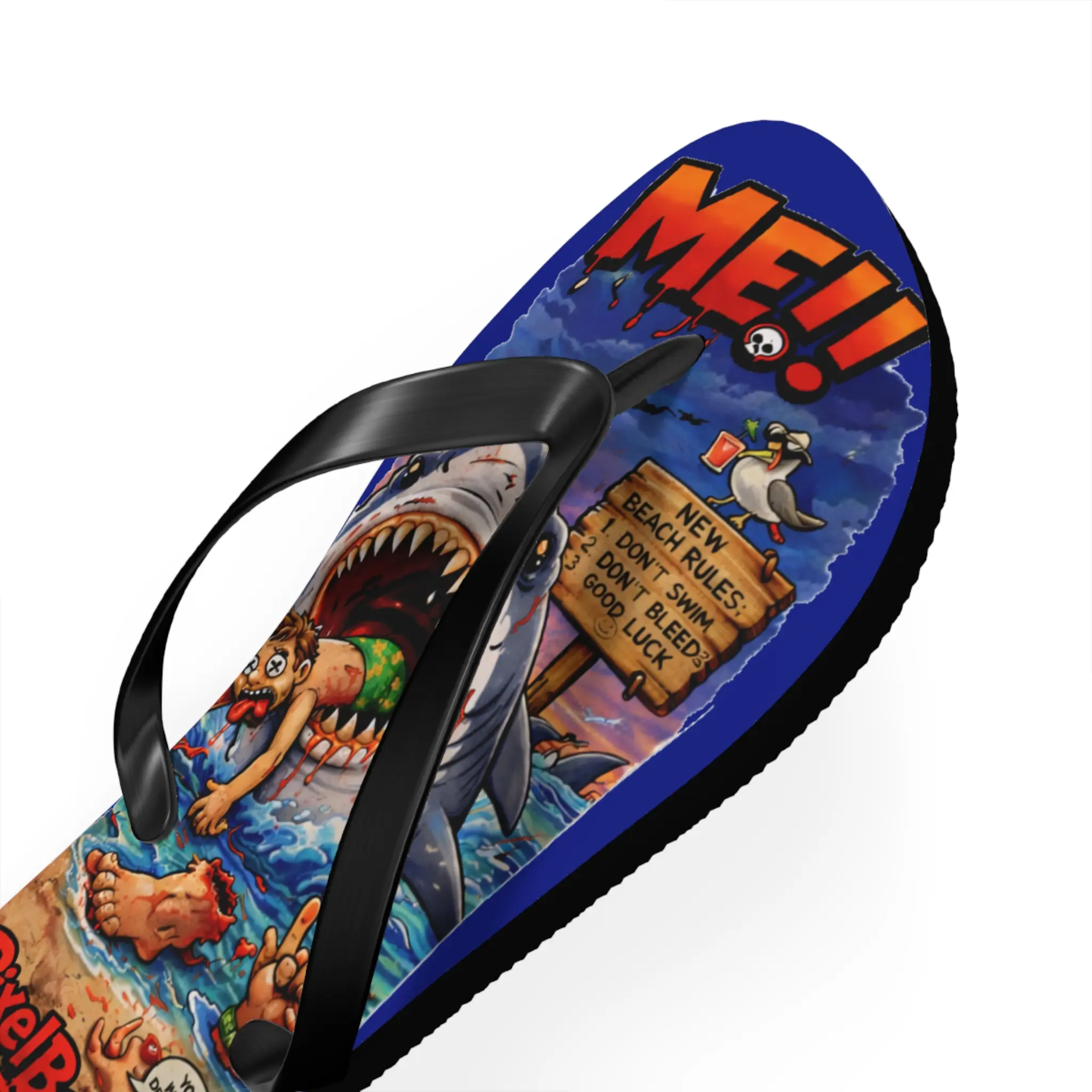 These flip flops bring loud, colorful beach mayhem to your warm-weather rotation. Bright sublimation prints sit on a soft polyester suede footbed, so the artwork — sharks, sunburnt beachgoers, and comic chaos — reads sharp and lively with every step. The lightweight 15 mm EVA sole flexes with your foot for long days on sand or boardwalks, while a textured, slip-resistant bottom keeps you steady on wet surfaces. Black PVC straps anchor the design and give a clean contrast to the riot of color. Wear them to skate the pier, wander a seaside market, or carry that irreverent, surf-adjacent energy into backyard barbecues and beach bonfires.