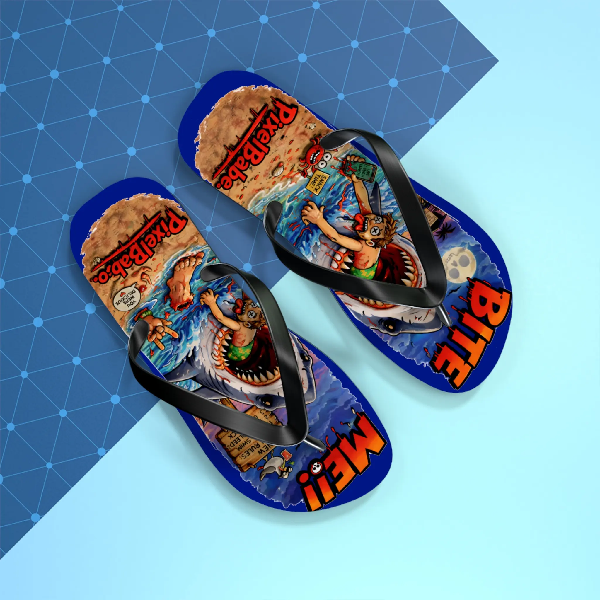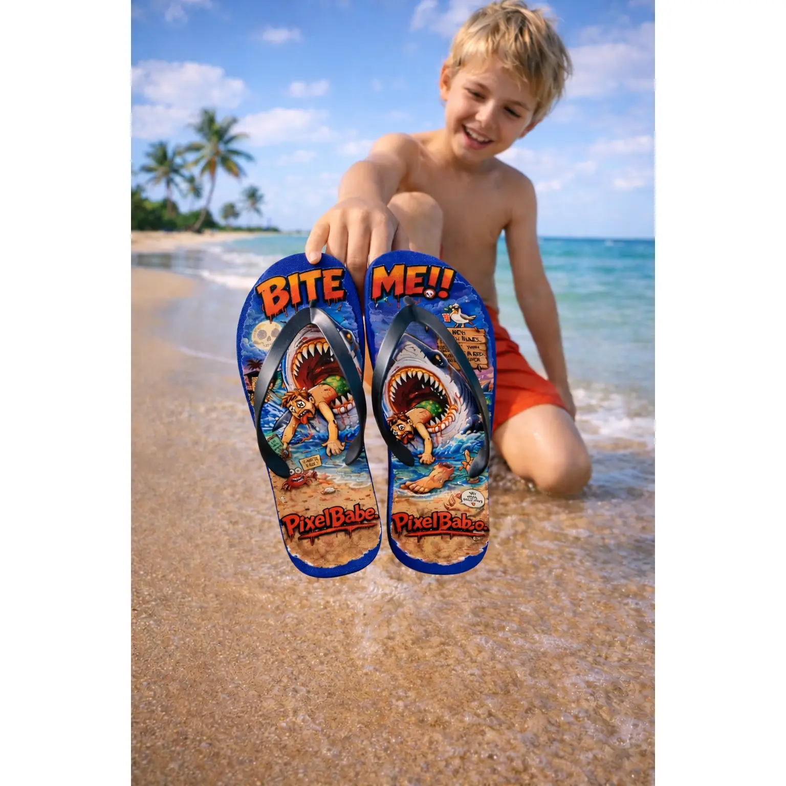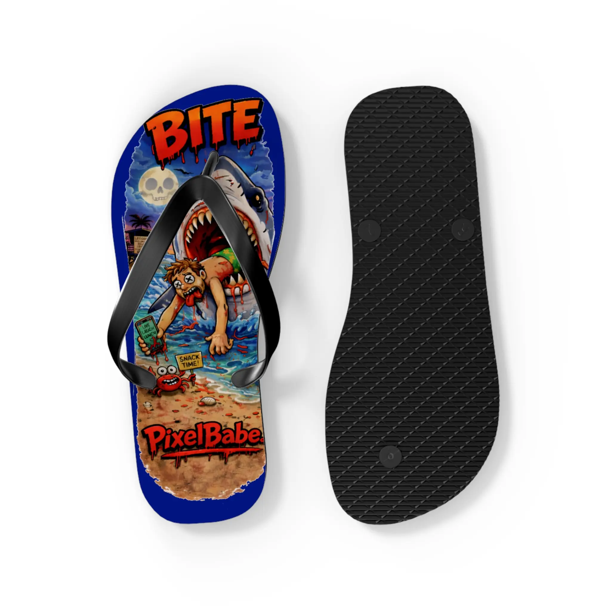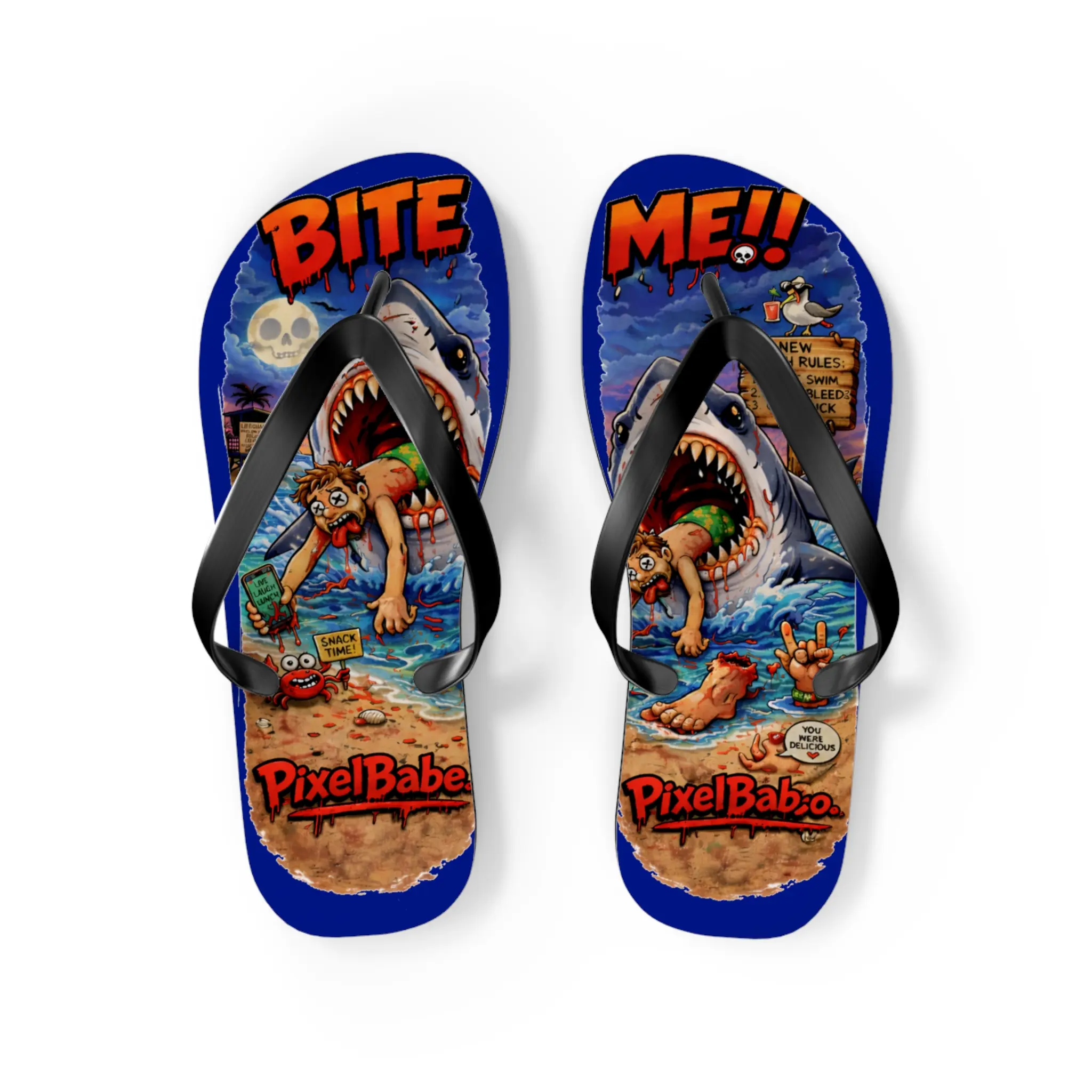 These flip flops bring loud, colorful beach mayhem to your warm-weather rotation. Bright sublimation prints sit on a soft polyester suede footbed, so the artwork — sharks, sunburnt beachgoers, and comic chaos — reads sharp and lively with every step. The lightweight 15 mm EVA sole flexes with your foot for long days on sand or boardwalks, while a textured, slip-resistant bottom keeps you steady on wet surfaces. Black PVC straps anchor the design and give a clean contrast to the riot of color. Wear them to skate the pier, wander a seaside market, or carry that irreverent, surf-adjacent energy into backyard barbecues and beach bonfires.