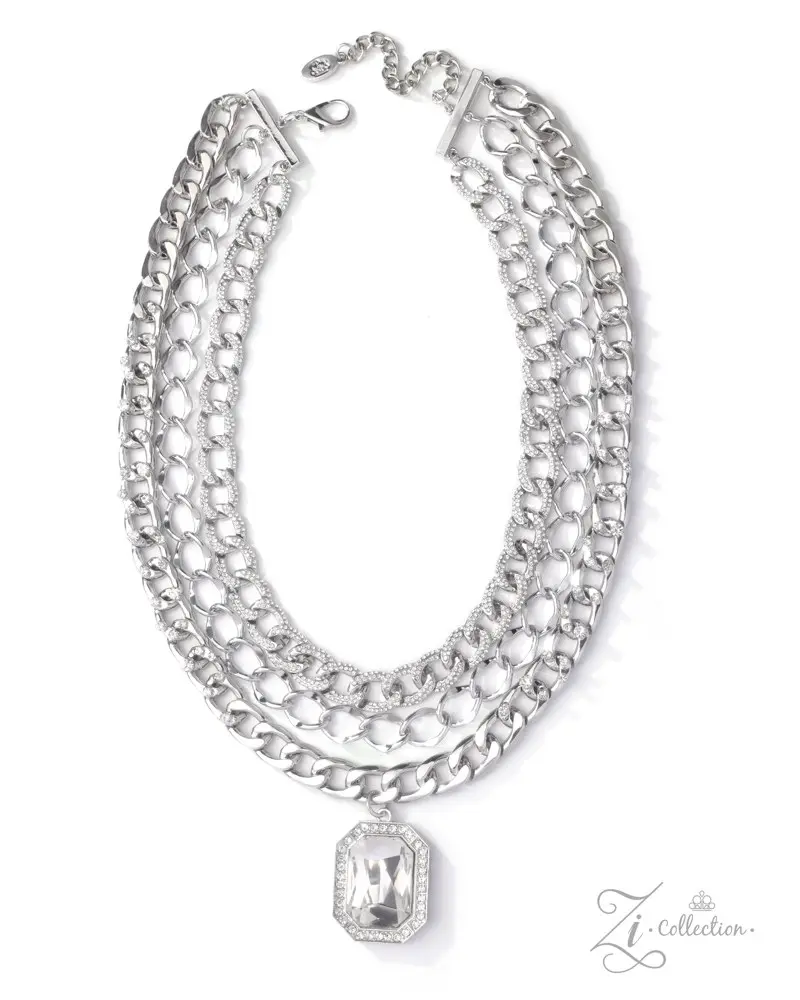 A large emerald-cut gem, pressed in a white rhinestone-embellished silver frame, drips below a mashup of oversized silver curb chains, some embellished in luminous white rhinestones, creating a beautiful contrast of industrial grit and timeless sparkle. Features an adjustable clasp closure. Sold as one individual necklace. Includes one pair of matching earrings. Intended for adult use.