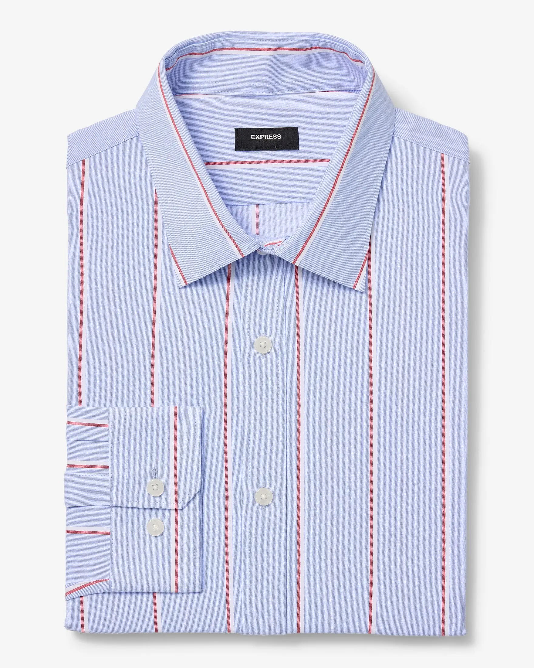 Lightweight and breathable, this blue dress shirt has your back during long days at the office or nights out on the town. Featuring an eye-catching red and white stripe pattern, a point collar, a full button front, and is crafted from a moisture-wicking, wrinkle-resistant, stretch fabric to keep you cool and confident.