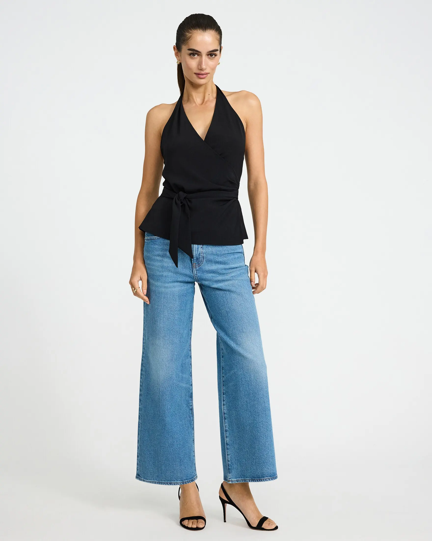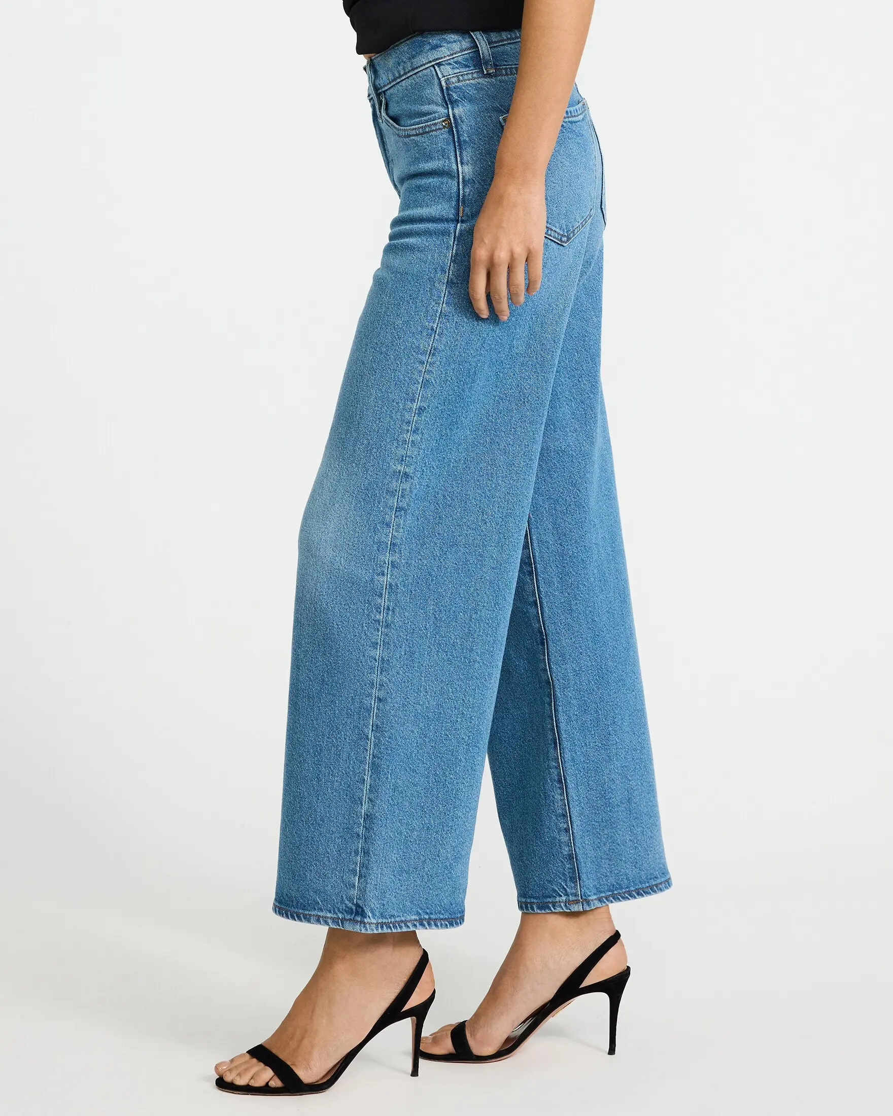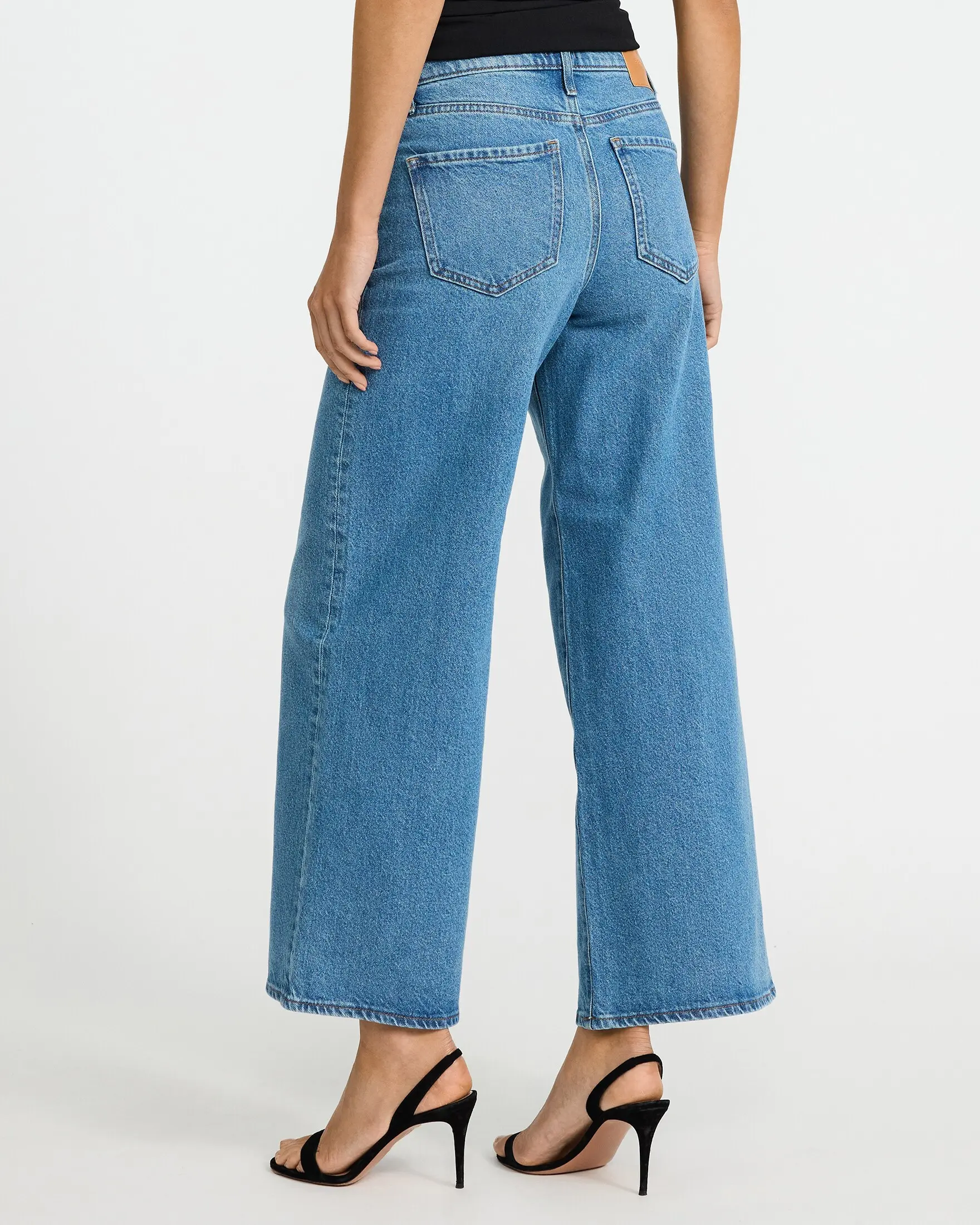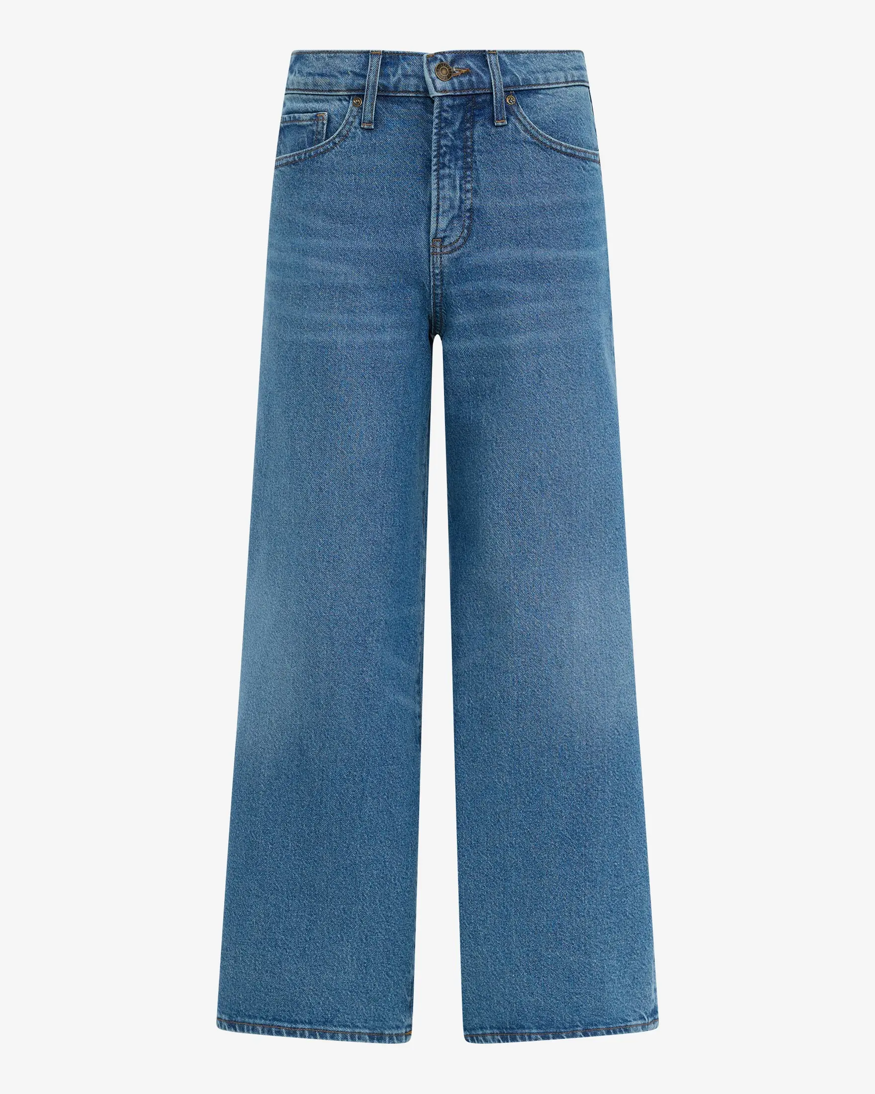 These classic medium wash jeans feature a high rise waist and have a fitted look through the waist and hip. This wide leg is designed to fall straight down from the hip and cut off at an ankle length. Crafted in stretch denim that’s equal parts comfort and vintage feel.