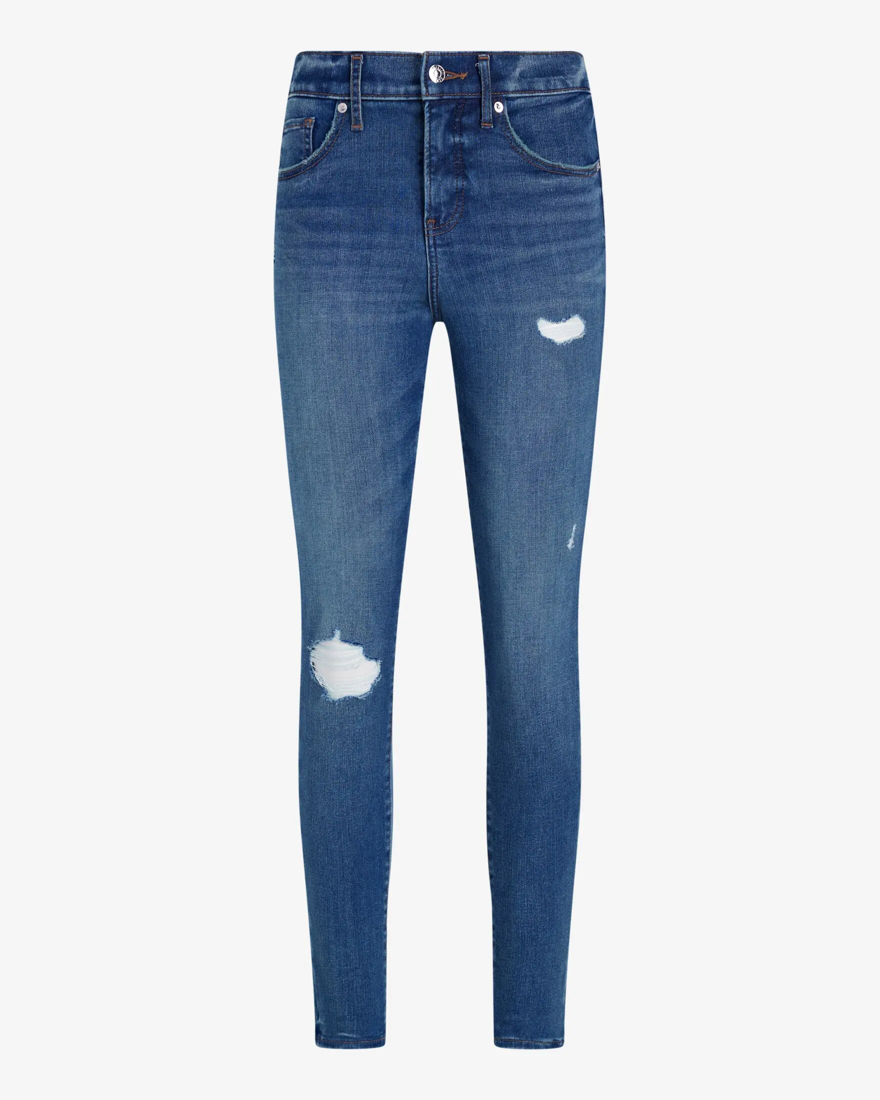 This classic skinny fit will make your legs look endless in this waist hugging, full-length inseam. The super slim fit in our premium stretch denim, is designed to hold its figure-flattering shape wear after wear. This style features ripped details for added flair.