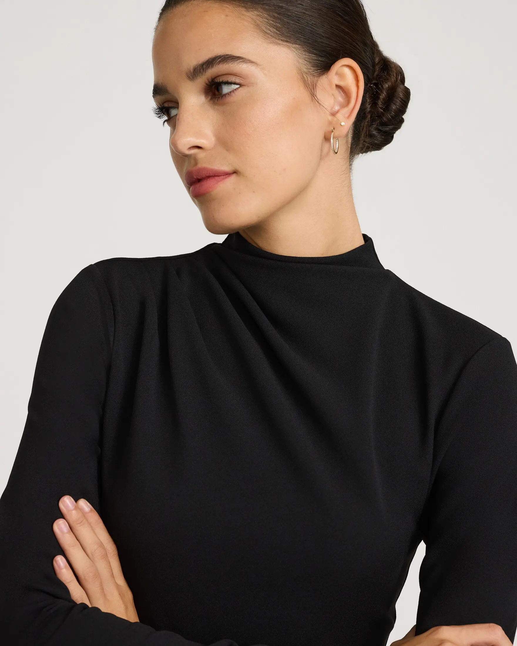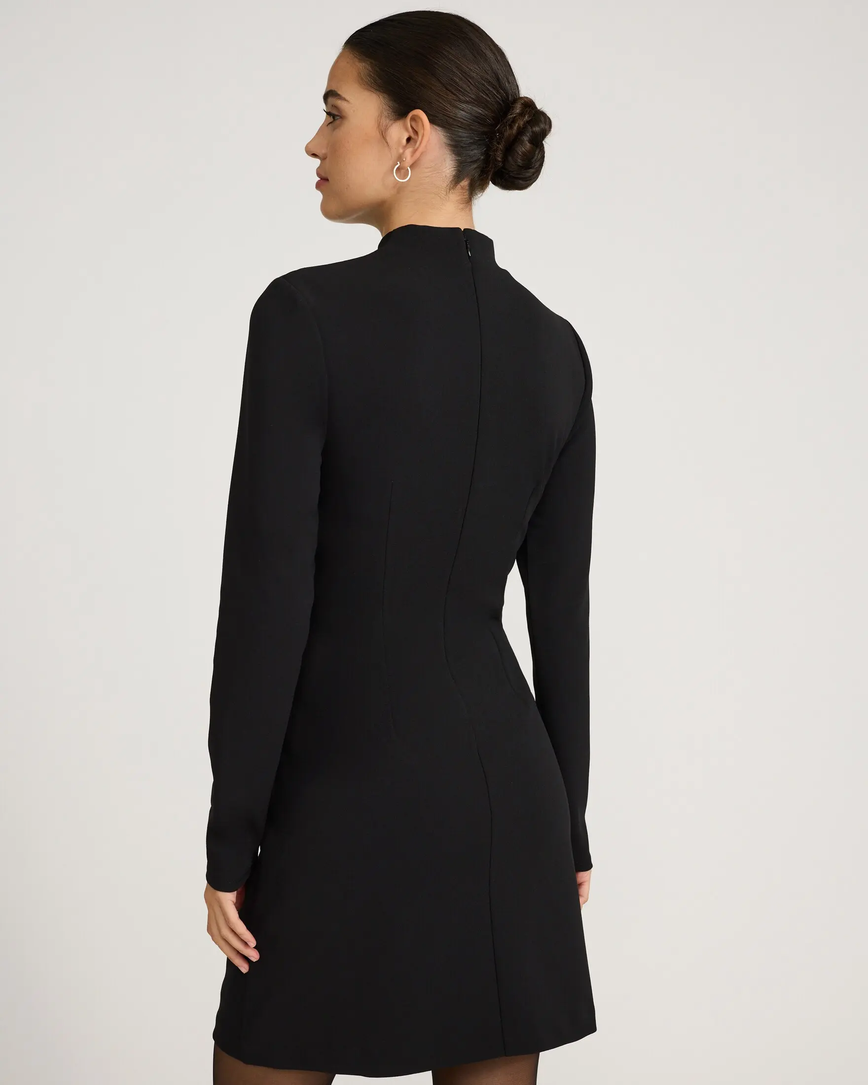 Sleek style made easy, this long sleeve mini dress is complete with a mock neckline and all-over ruching for a flattering fit. Style solo or pair with tights for days in the office that transition to cocktail hour.