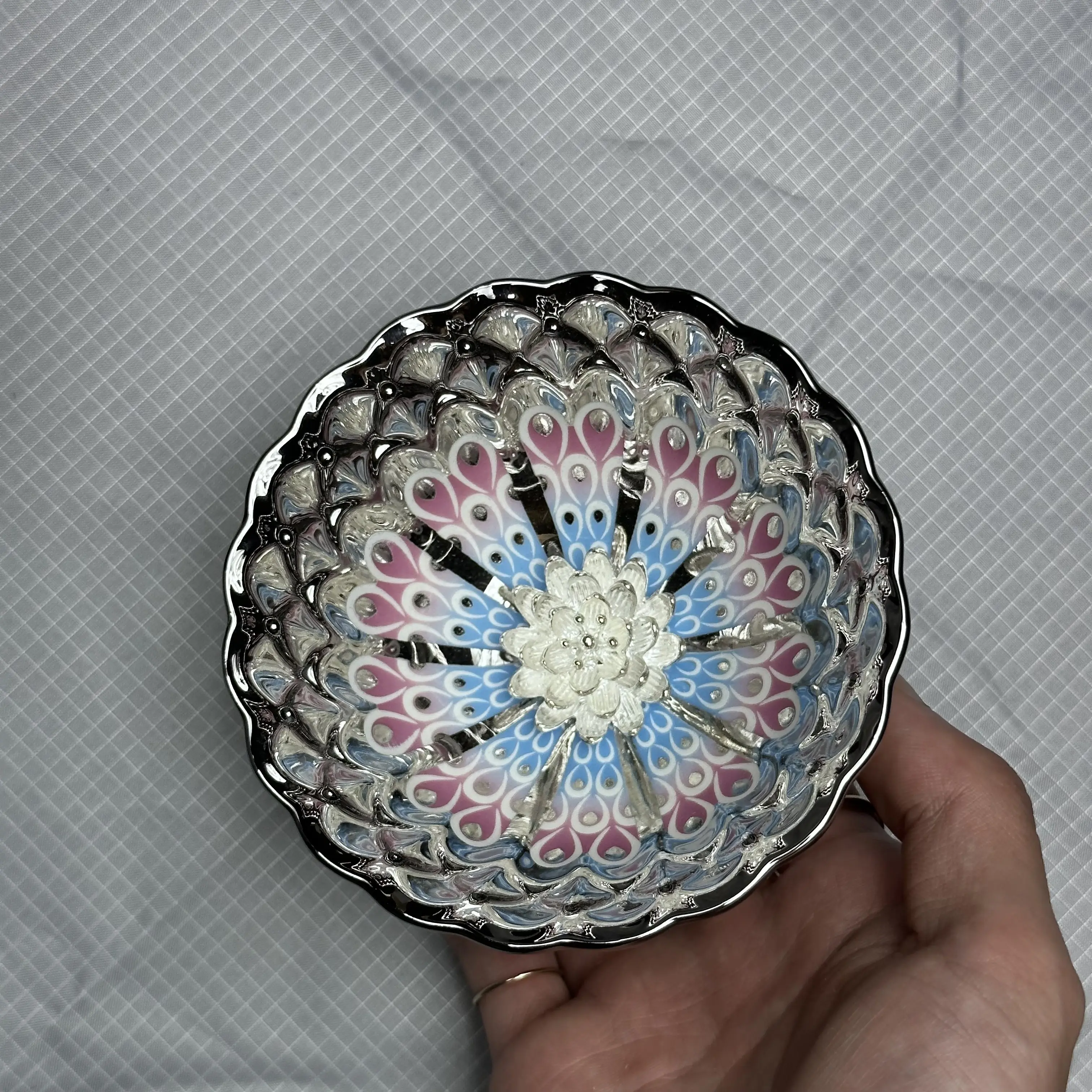 Luminous Silver-Toned Porcelain Teacup with Peacock Feather & Lotus