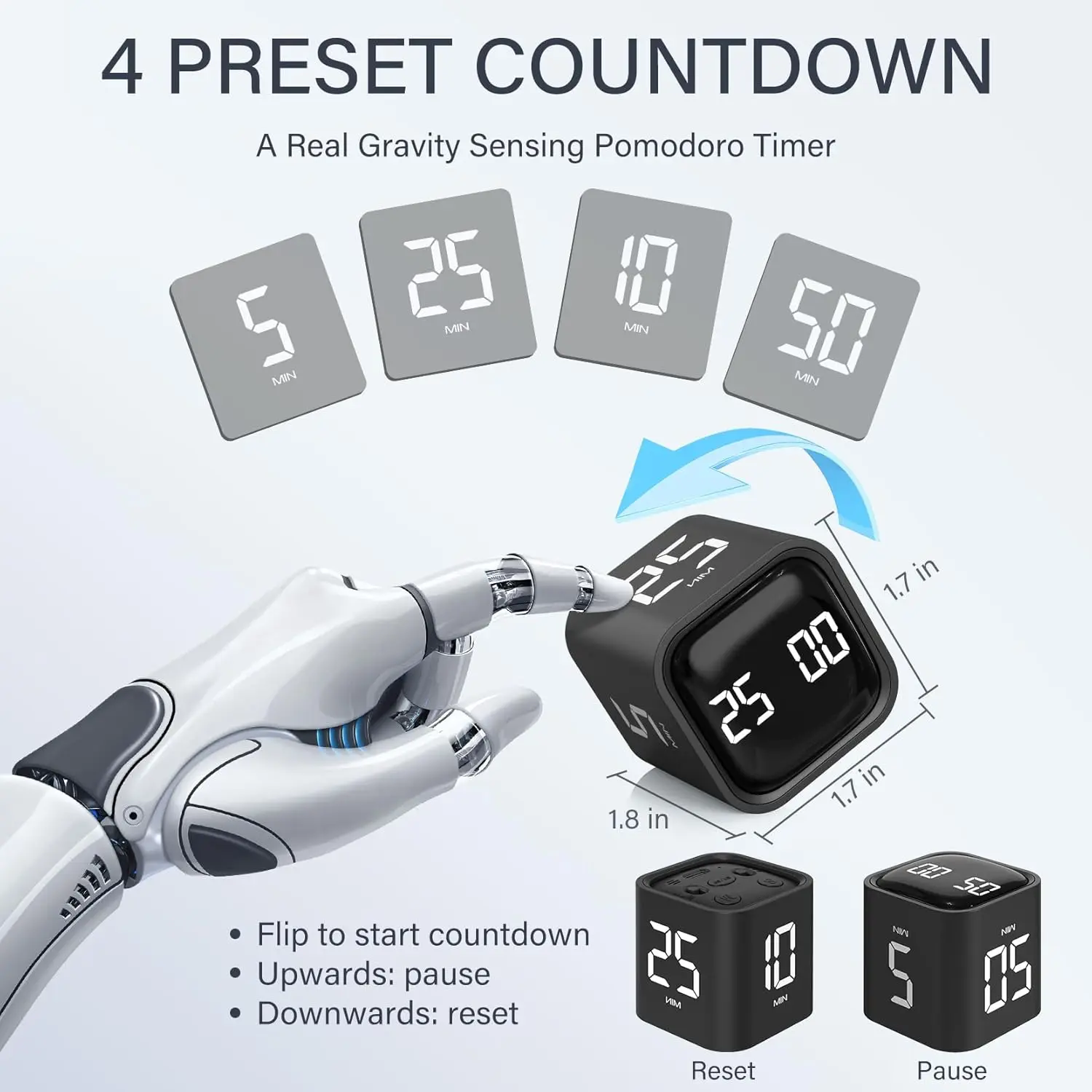 ·Rotating Productivity Timer with Gra vity Sensor. We have preset 5, 25, 10, 50 minutes for gra vity sensing mode. You only need to flip the timer to the preset number with facing upwards, and then it will automatically start to countdown. Flip the timer screen facing upwards to stop the timing; Flip the timer screen facing downwards to reset it to zero.