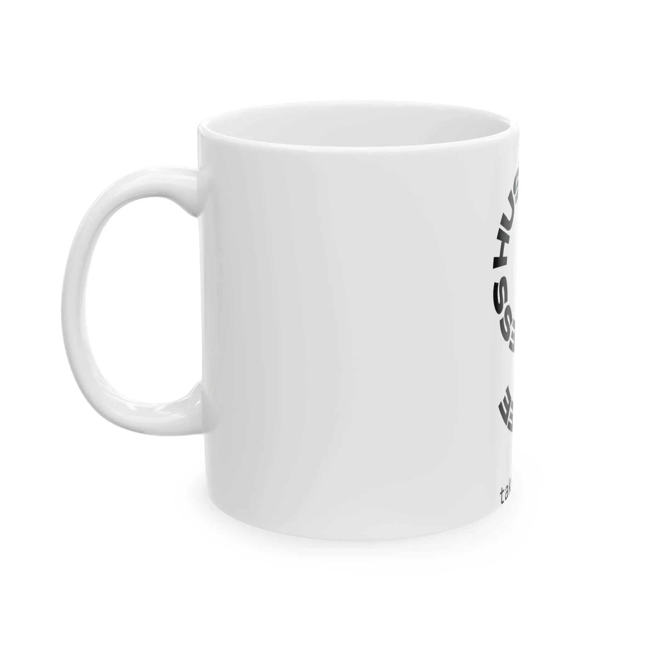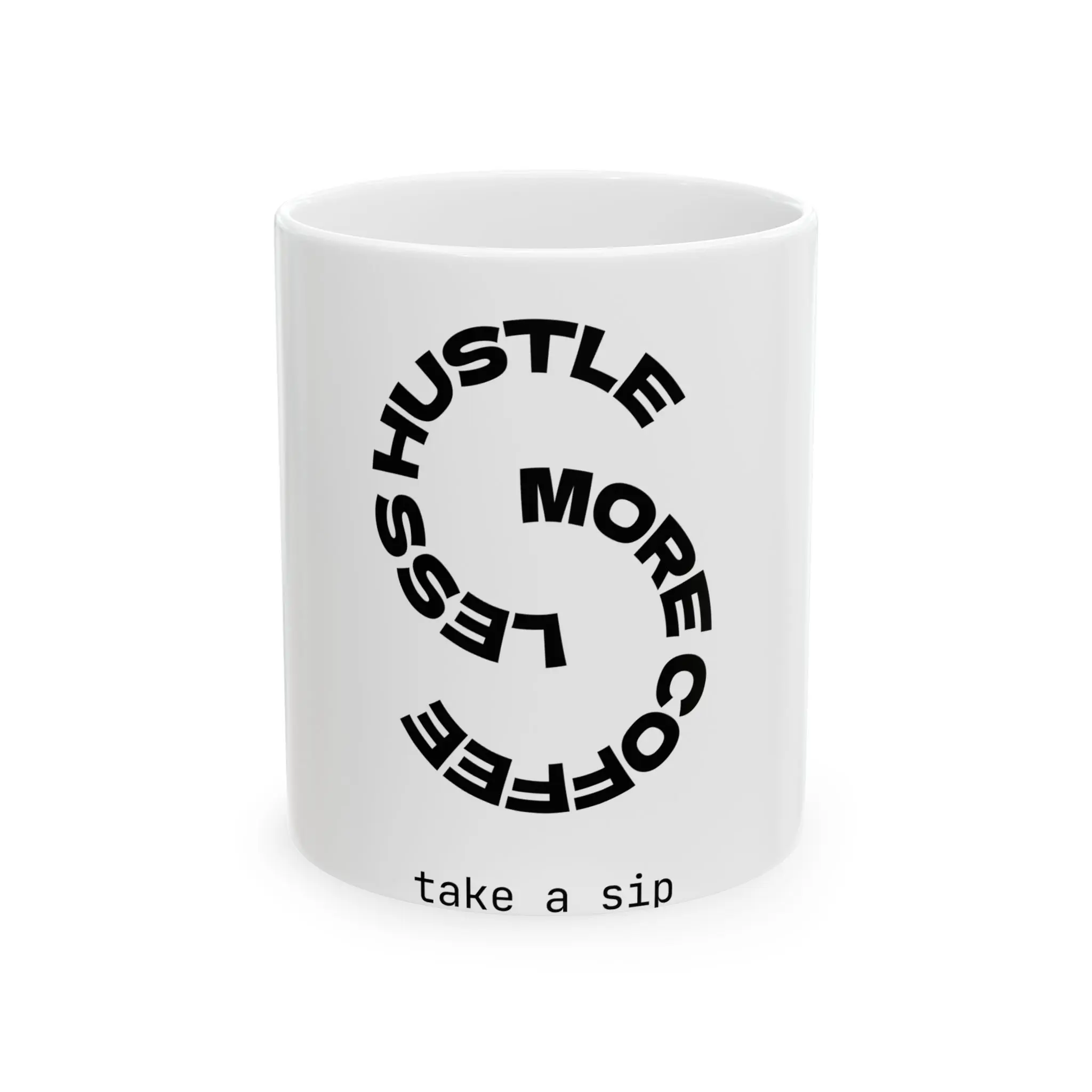 This glossy white ceramic mug carries a simple, bold statement for anyone fueled by caffeine and creativity. A circular black type design spells out “HUSTLE MORE COFFEE LESS,” curving like a slow swirl of steam, while a small, playful “take a sip” rests gently at the base. It feels like a quiet nudge at the start of the day — a moment to breathe, focus, and keep moving. The clean monochrome look suits minimalist desks, busy studio counters, and late-night work sessions; it sits comfortably in your hand with a classic C-handle and keeps your routine feeling intentional. Microwave- and dishwasher-safe, lead- and BPA-free, and offered in 11oz and 15oz sizes, this mug blends practicality with an everyday reminder to keep doing the work you love.