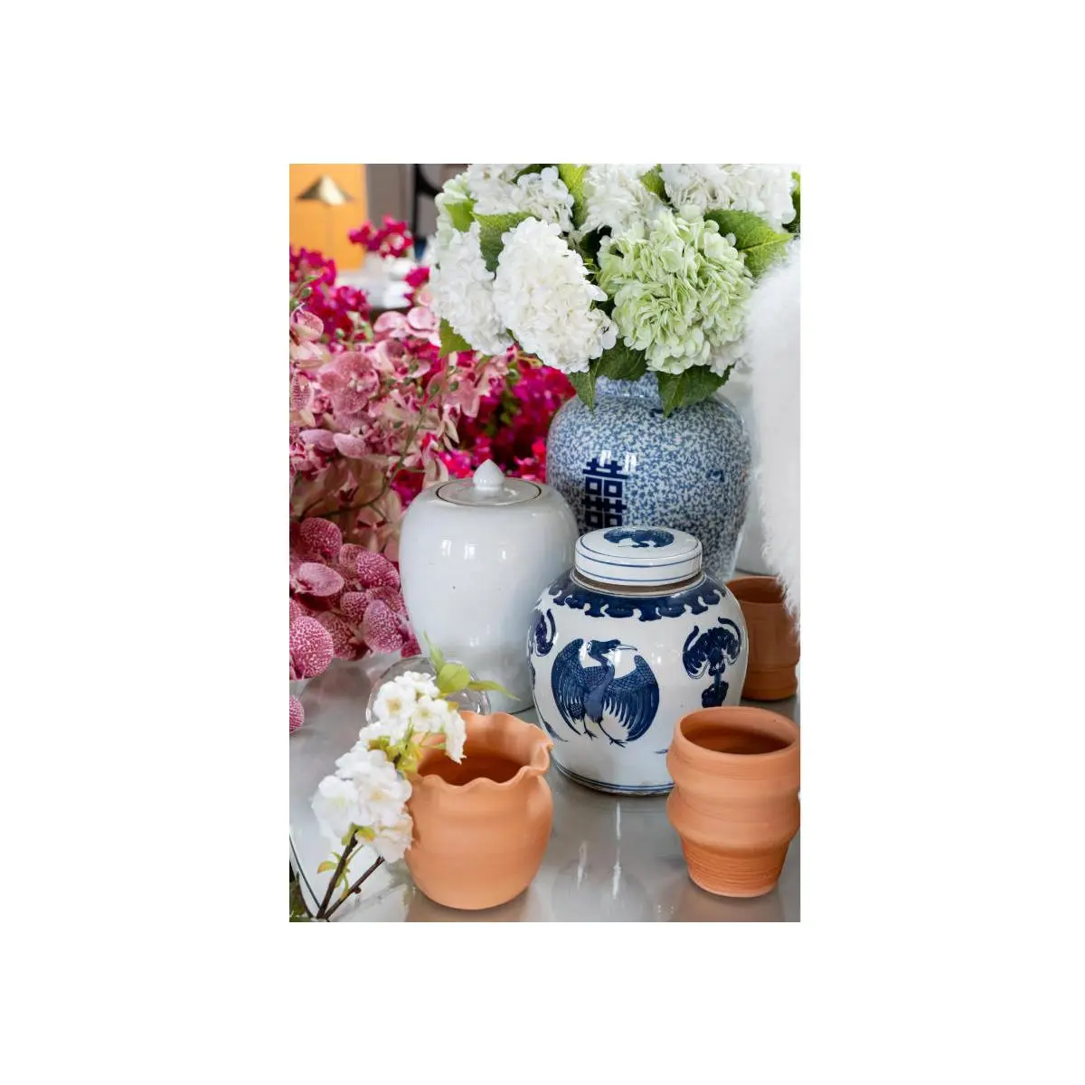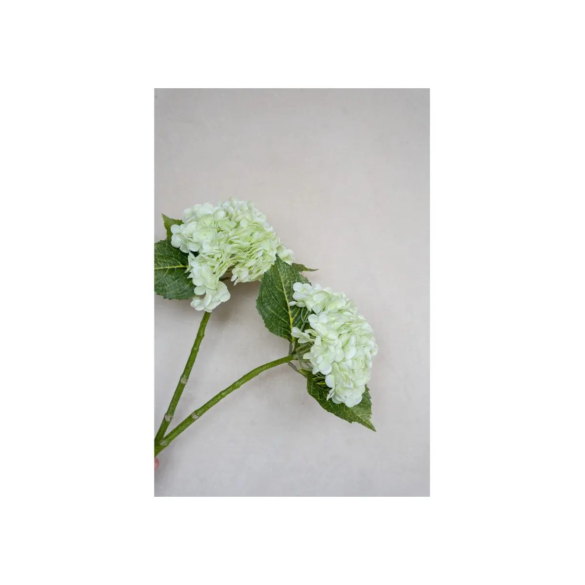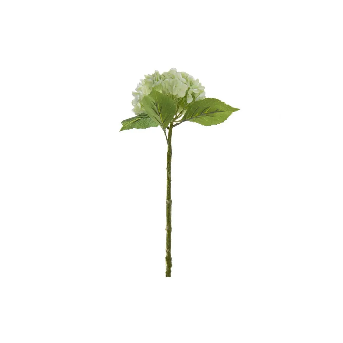 This faux hydrangea lends a fresh, ethereal touch. Its tall stem supports a beautiful blossom of soft green flowers complemented by lifelike leaves. Create a sophisticated look by clustering multiples together or pairing with the white hydrangeas.