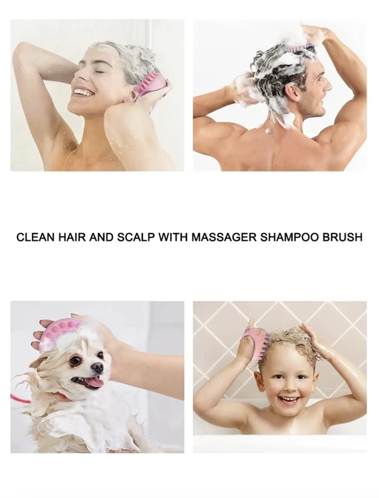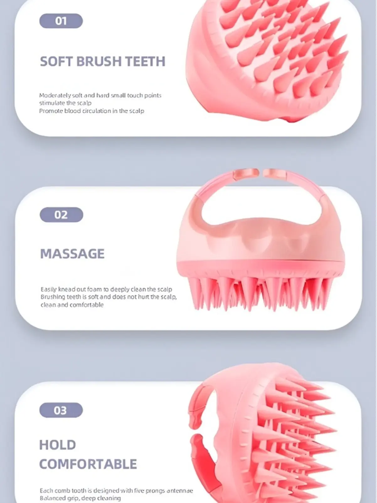-SCALP MASSAGER -ANTI SLIP GRIP -SOFT SILICONE -DANDRUFF REMOVE -HAIR & SCALP HEALTH -DEEP CLEANSING & RELAXATION -IDEAL FOR SHOWER OR DRY USE -LENGTH: 3.34", HEIGHT: 3.03