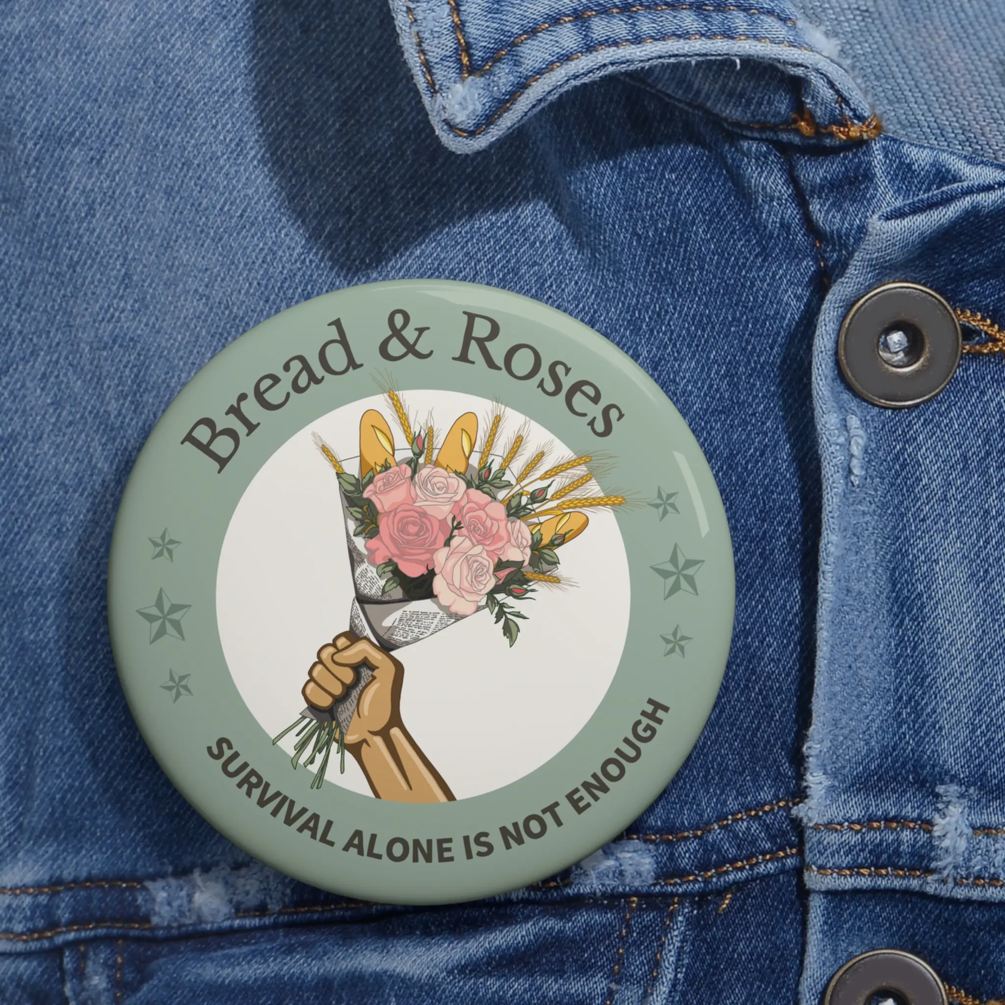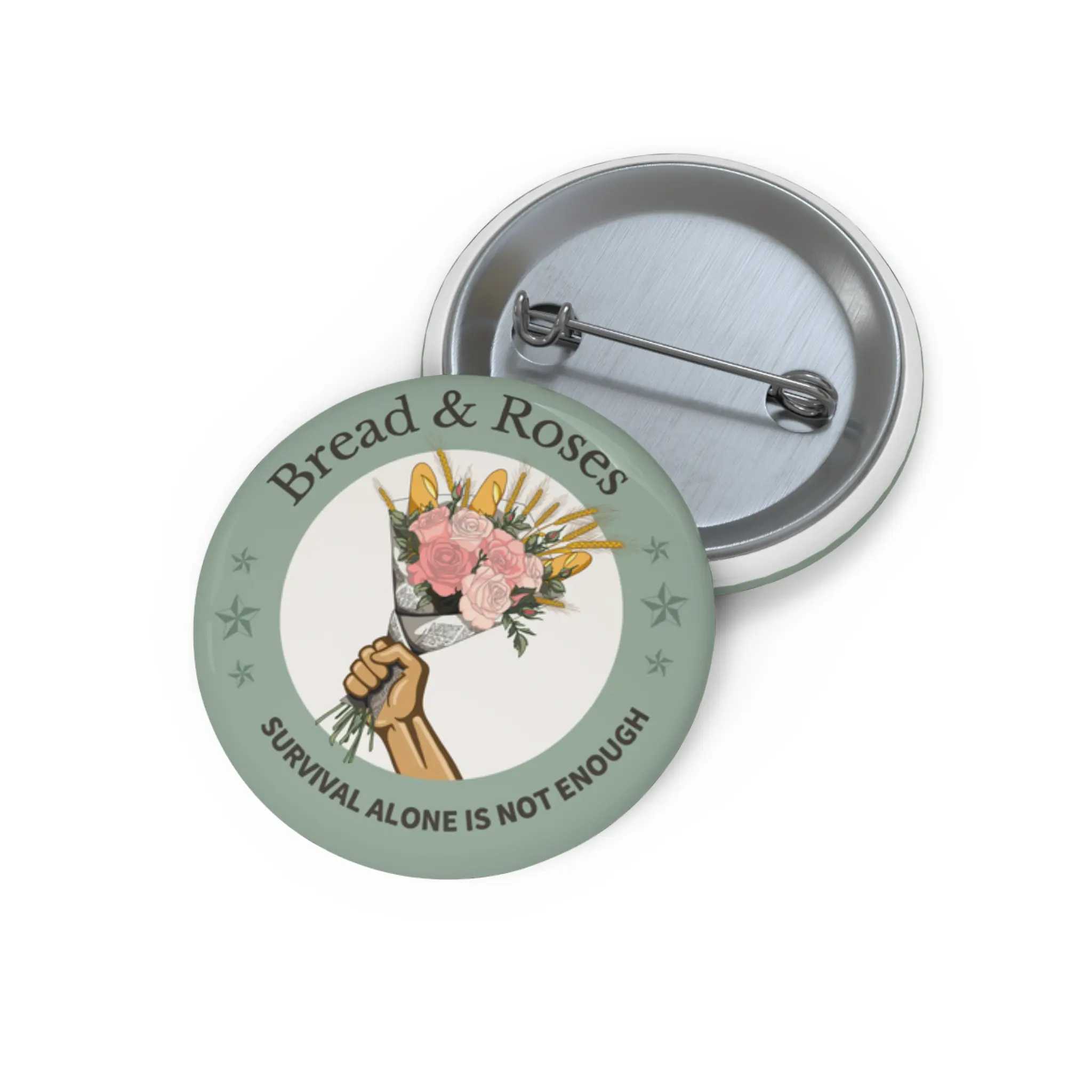 This version features the Bread & Roses bouquet in a soft sage green, with the phrase wrapped around it as a reminder of what that really means.