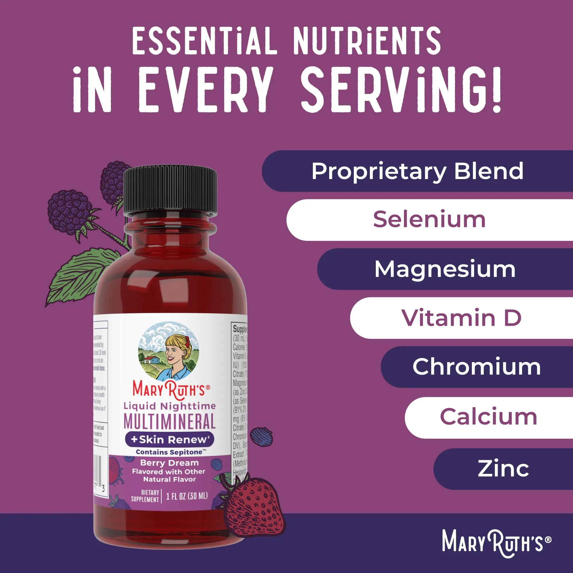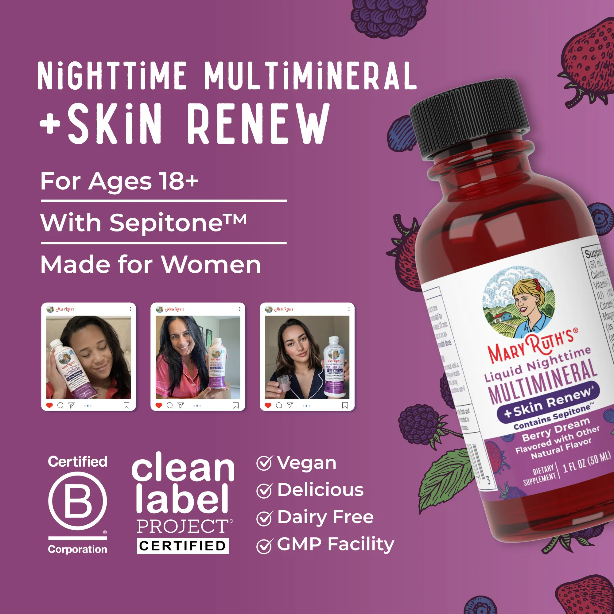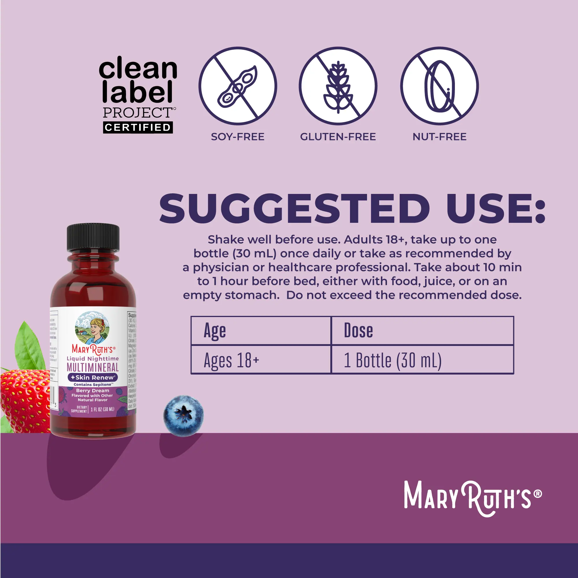 For Most Lifestyles: MaryRuth's Liquid Nighttime Multimineral + Skin Renew is Non-GMO, Vegan, Made in a GMP Facility. Melatonin Free, Dairy Free, Gluten Free. Formulated for Adults 18+. Clean Label Project Certified. B Corp Certified. Women Owned Business.