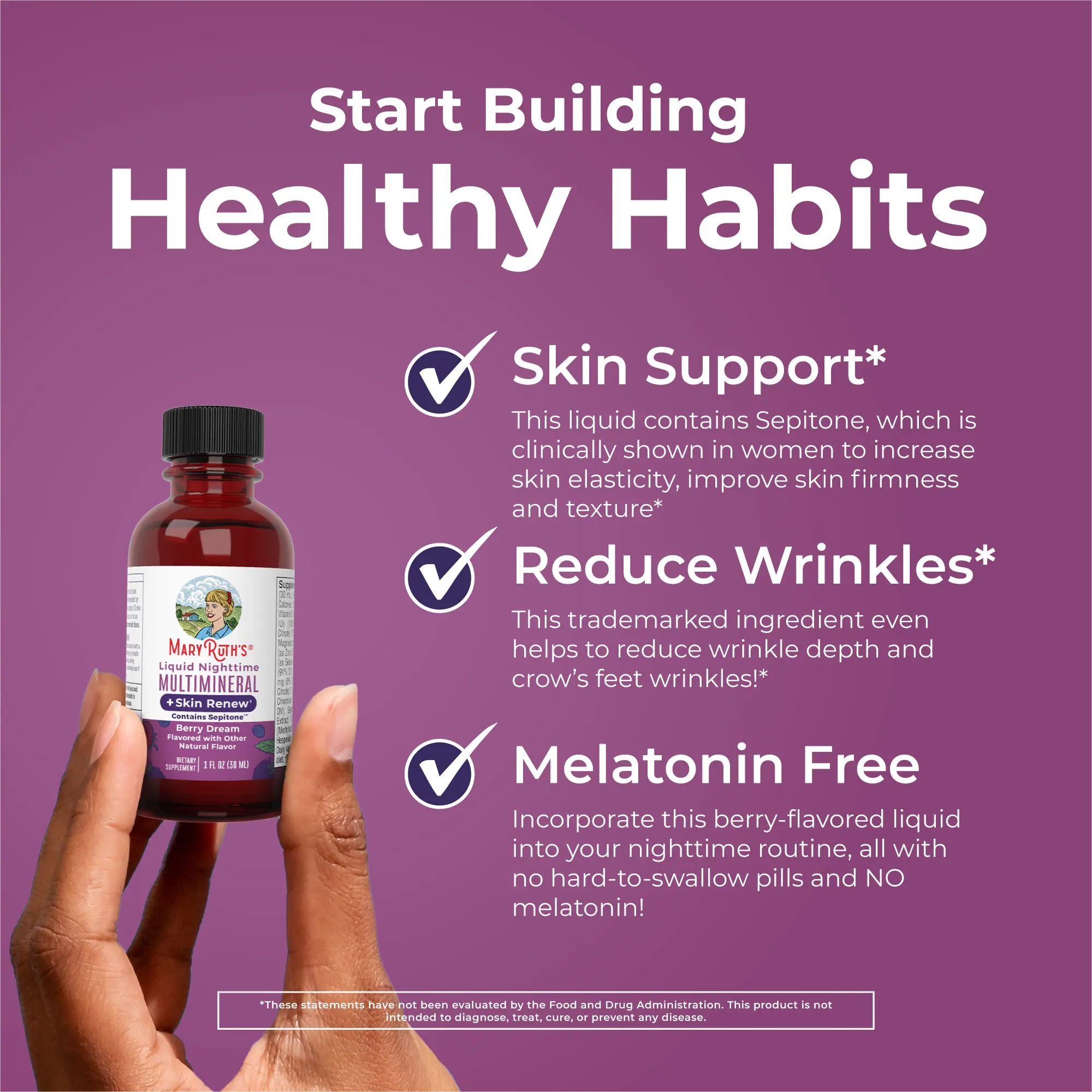 Nighttime Skin Support: Reduce fine wrinkles & improve skin firmness with Sepitone while you sleep! The nighttime partner to our liquid multivitamins — this multimineral for women helps renew your skin each night. No hard-to-swallow pills and no melatonin!