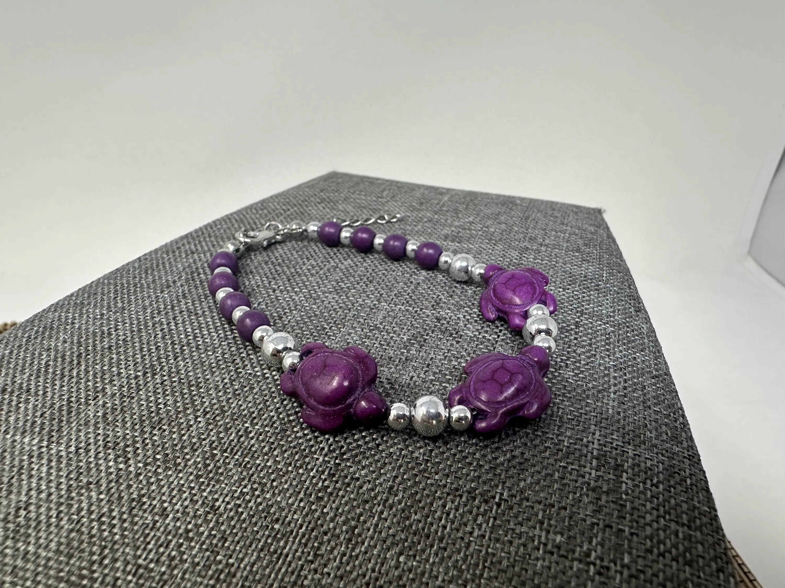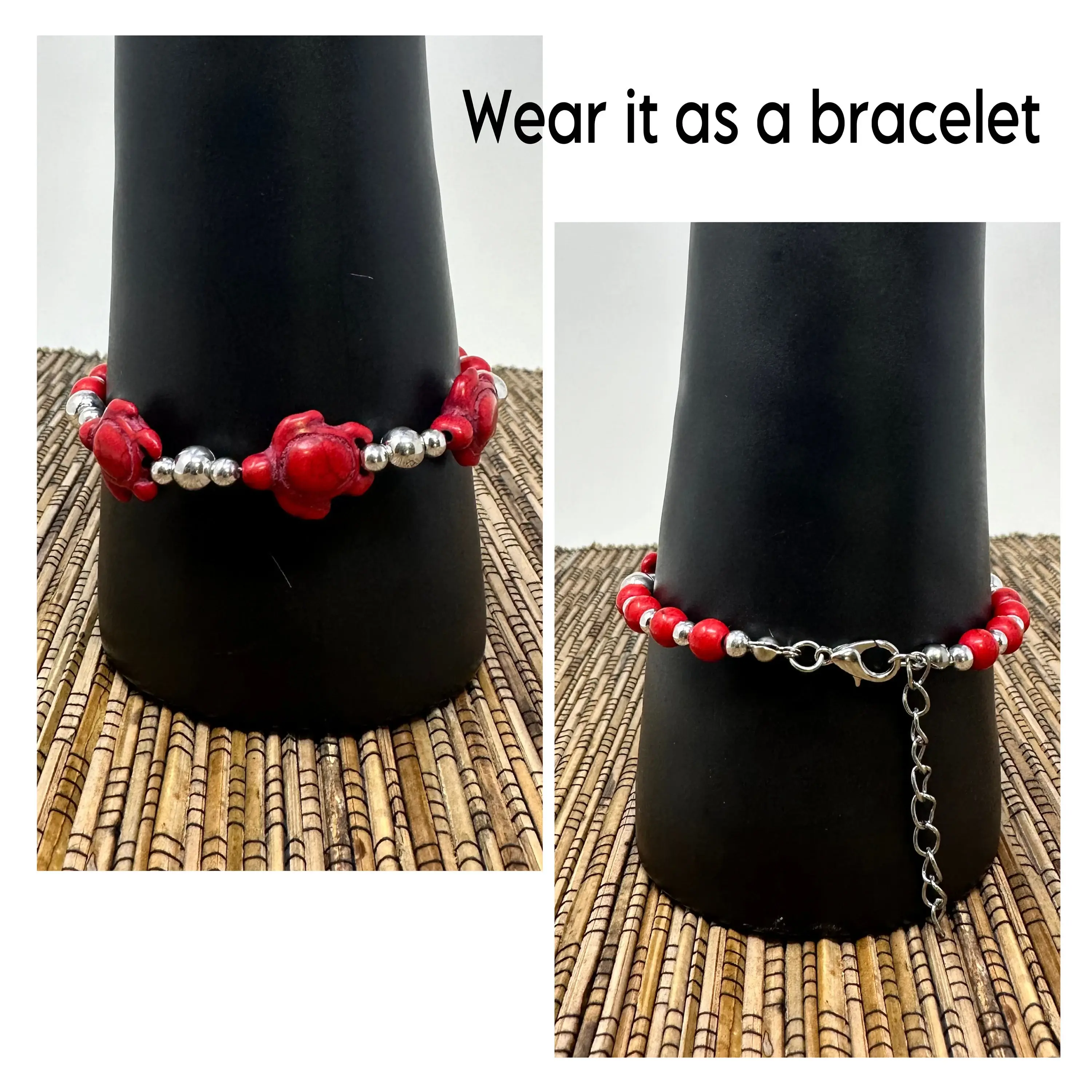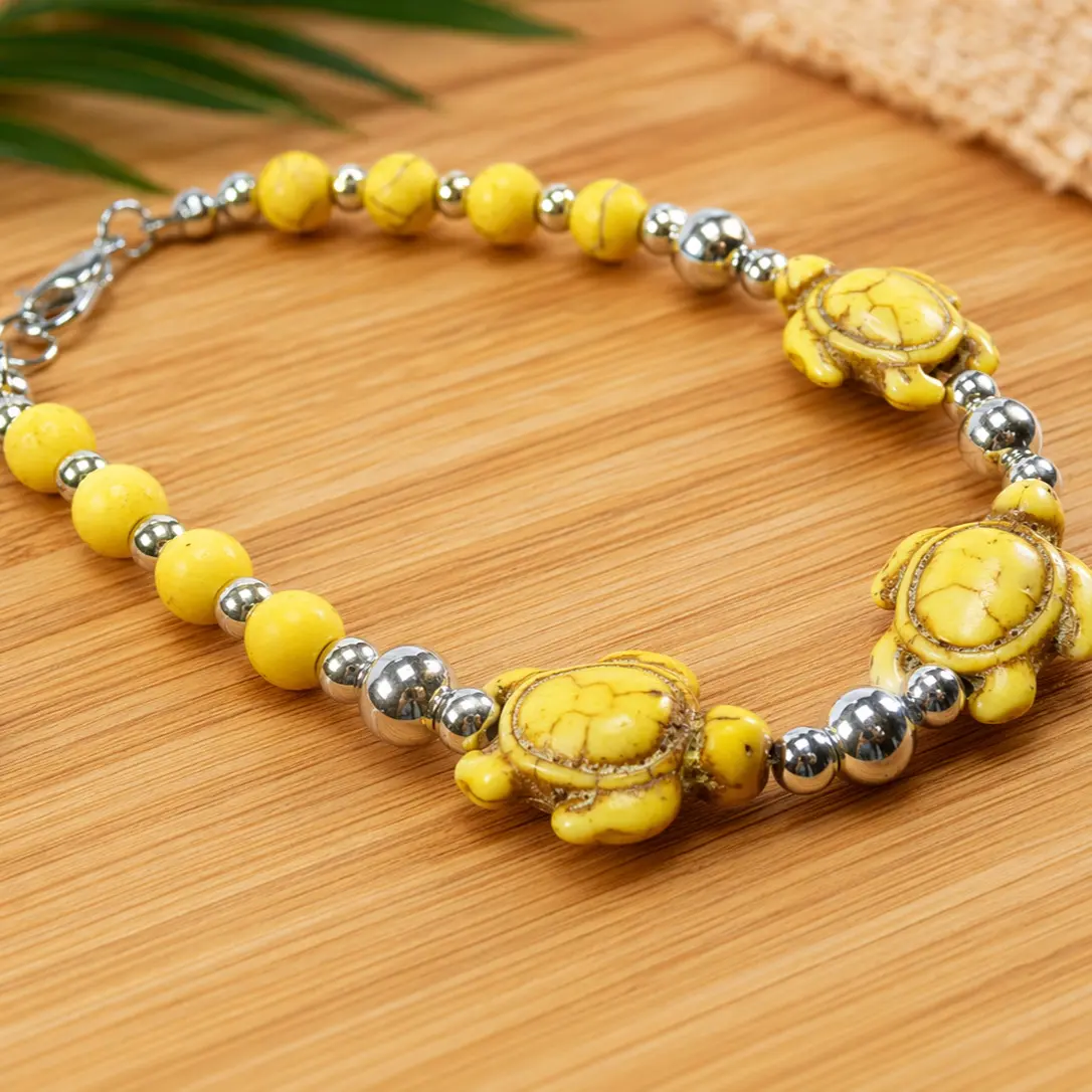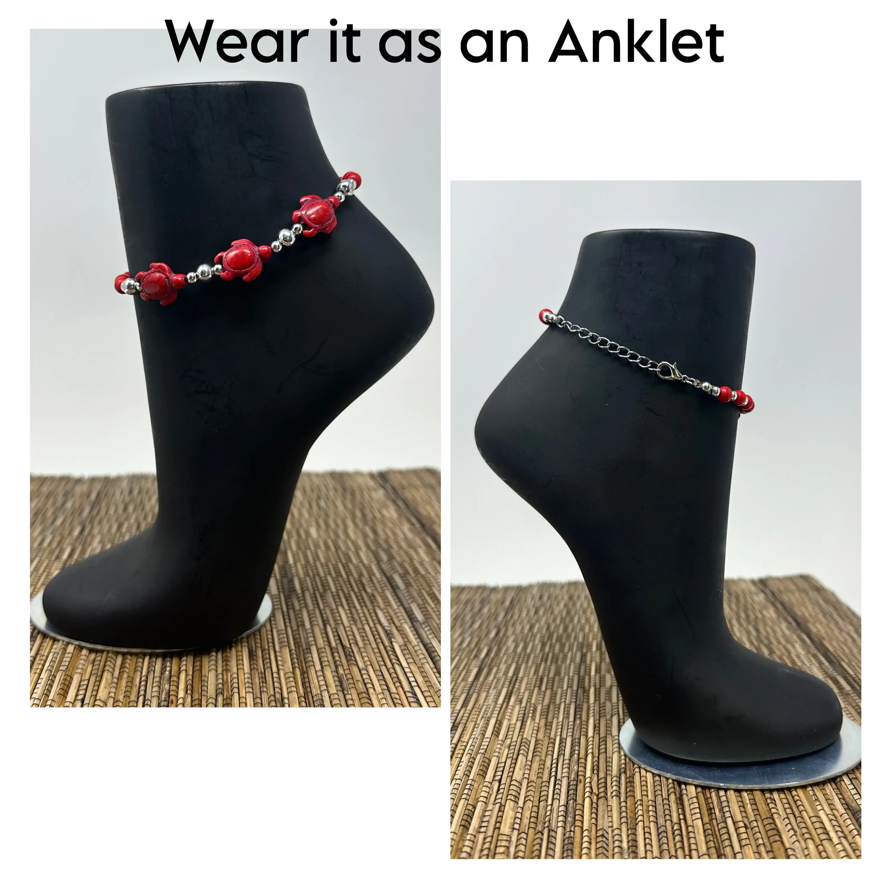 Elevate your beach style with this versatile sea turtle piece. Wear it as a bracelet or anklet, perfect for everyday wear, vacations, or gifting. Detailed turtle beads and polished accents bring coastal energy and symbolic meaning. Silver-tone bead details ensure a clean, stylish look. Secure lobster clasp closure for safety. Lightweight and comfortable, it's unisex and easy to style.