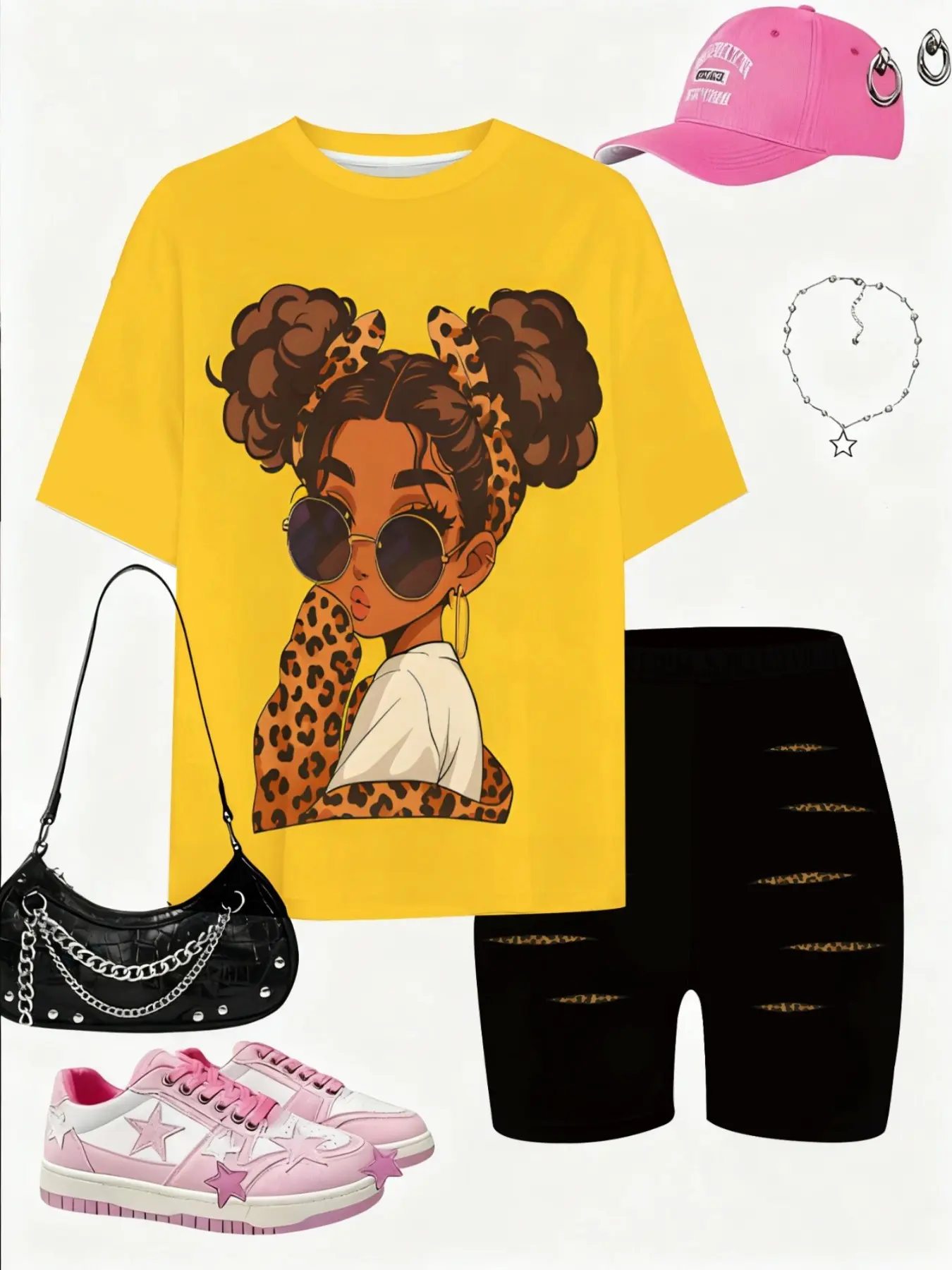 5. Girls' 2-Piece Set, Striped Heart Print T-Shirt & Short Pants, Cute Summer, Perfect for Parties & Daily Wear, Sister Matching Clothes