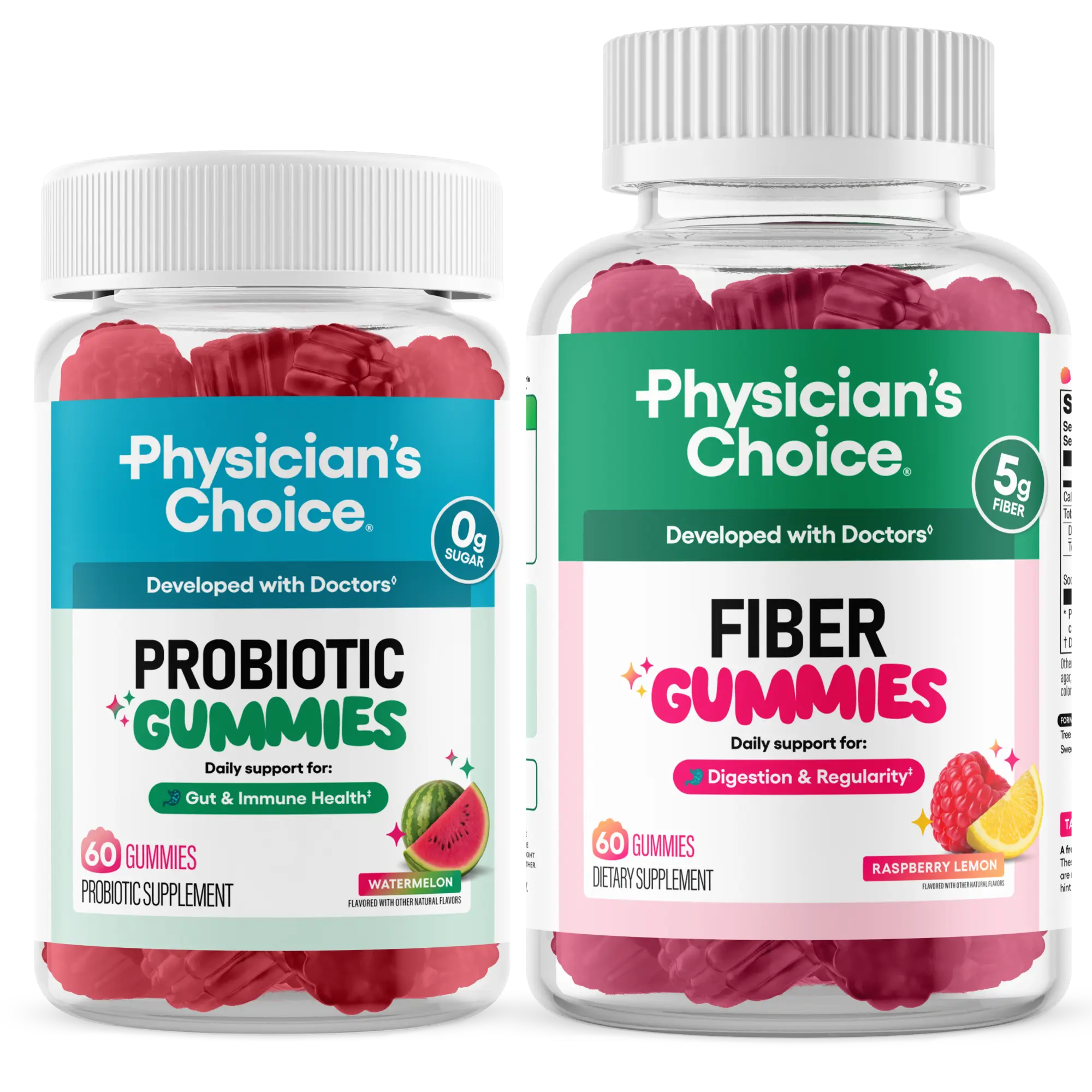 Physician's Choice Gut Gummy Bundle pairs Prebiotic Fiber Gummies and Probiotic Gummies for complete daily gut and immune support. No pills, no powder, and no added sugar!
