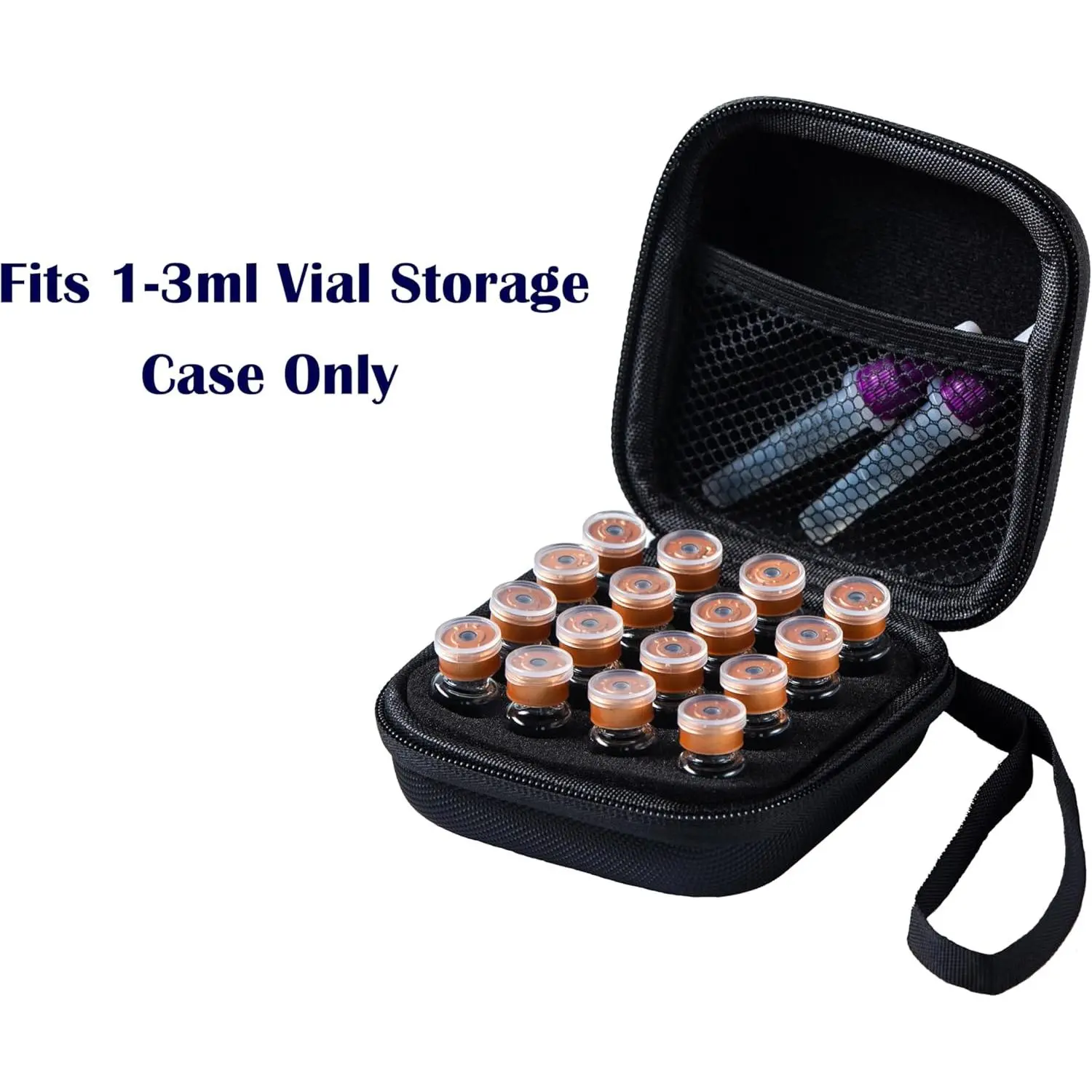 This compact 16-slot case fits 1ml–3ml vials perfectly, with EVA foam protection, a handy wrist strap, and fridge-friendly design.