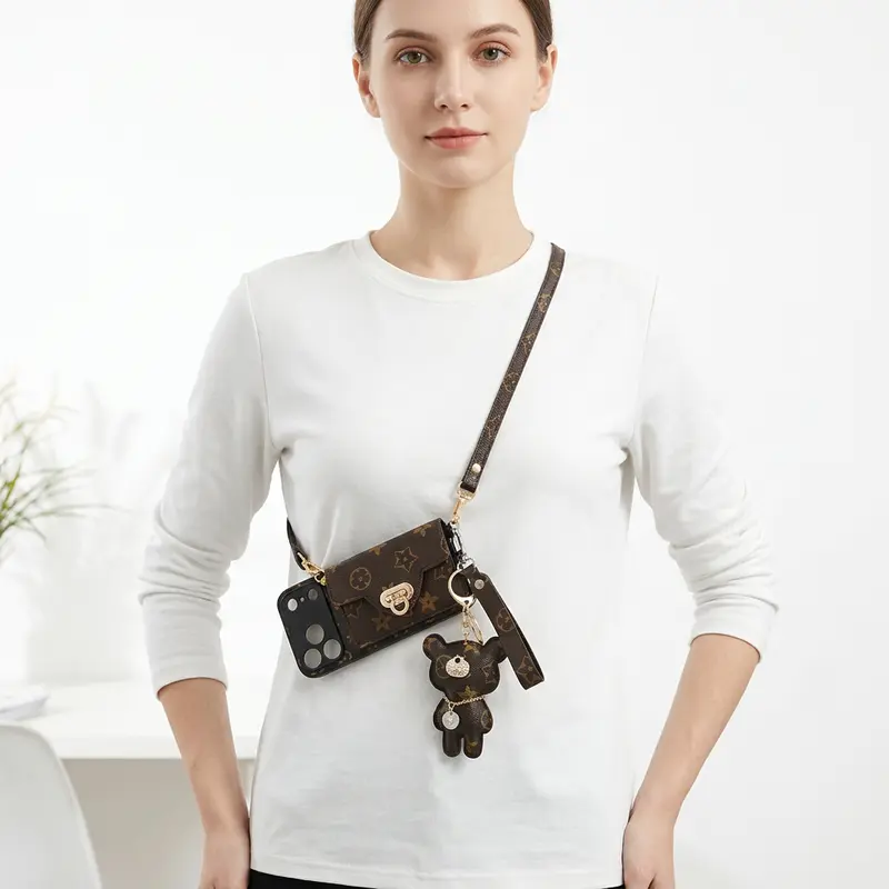 iPhone 16 Pro Max Case with Bear Shoulder Strap & Card Holder for iPhone17ProMaxCase Protective Cover with Pattern and Gold Hardware
