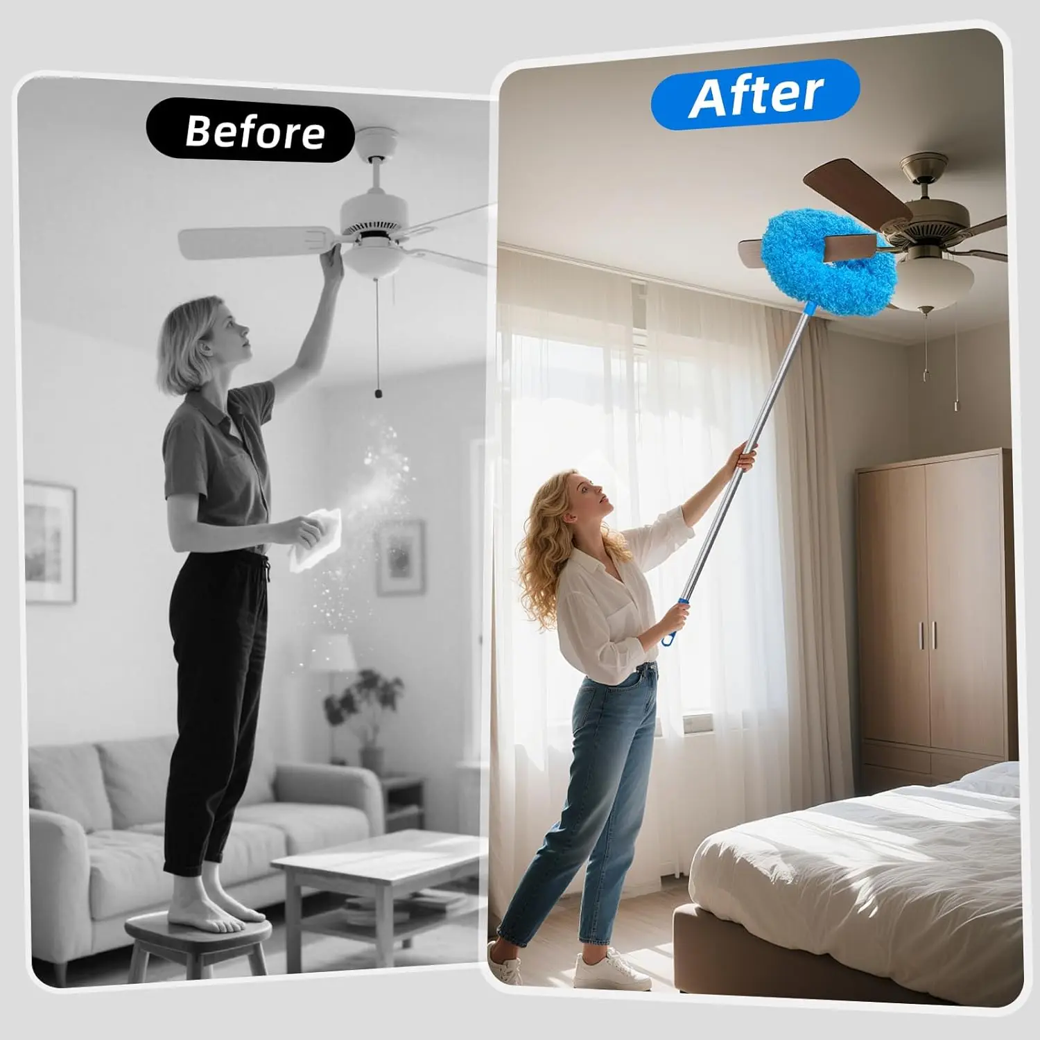 Designed with an extendable handle, this duster allows you to clean ceilings, fans, shelves, and other hard-to-reach areas effortlessly. No ladders or stools needed! Perfect for safe and convenient everyday cleaning. This tool is your go-to for maintaining a clean home or office.