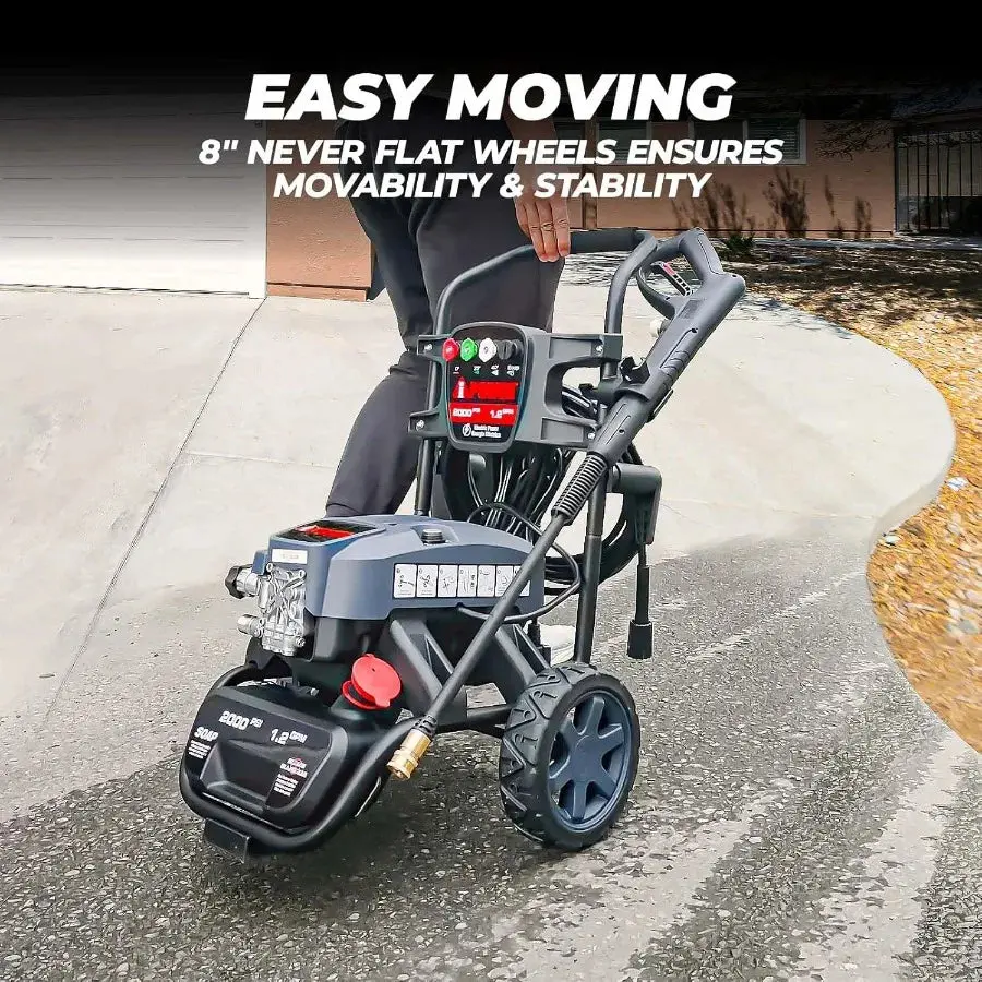 Powerful Motor: Featuring a CETL-certified universal motor, this electric pressure washer delivers formidable cleaning power, boasting an exceptional strength of 2000PSI/1.2GPM, ensuring both efficiency and safety during operation.