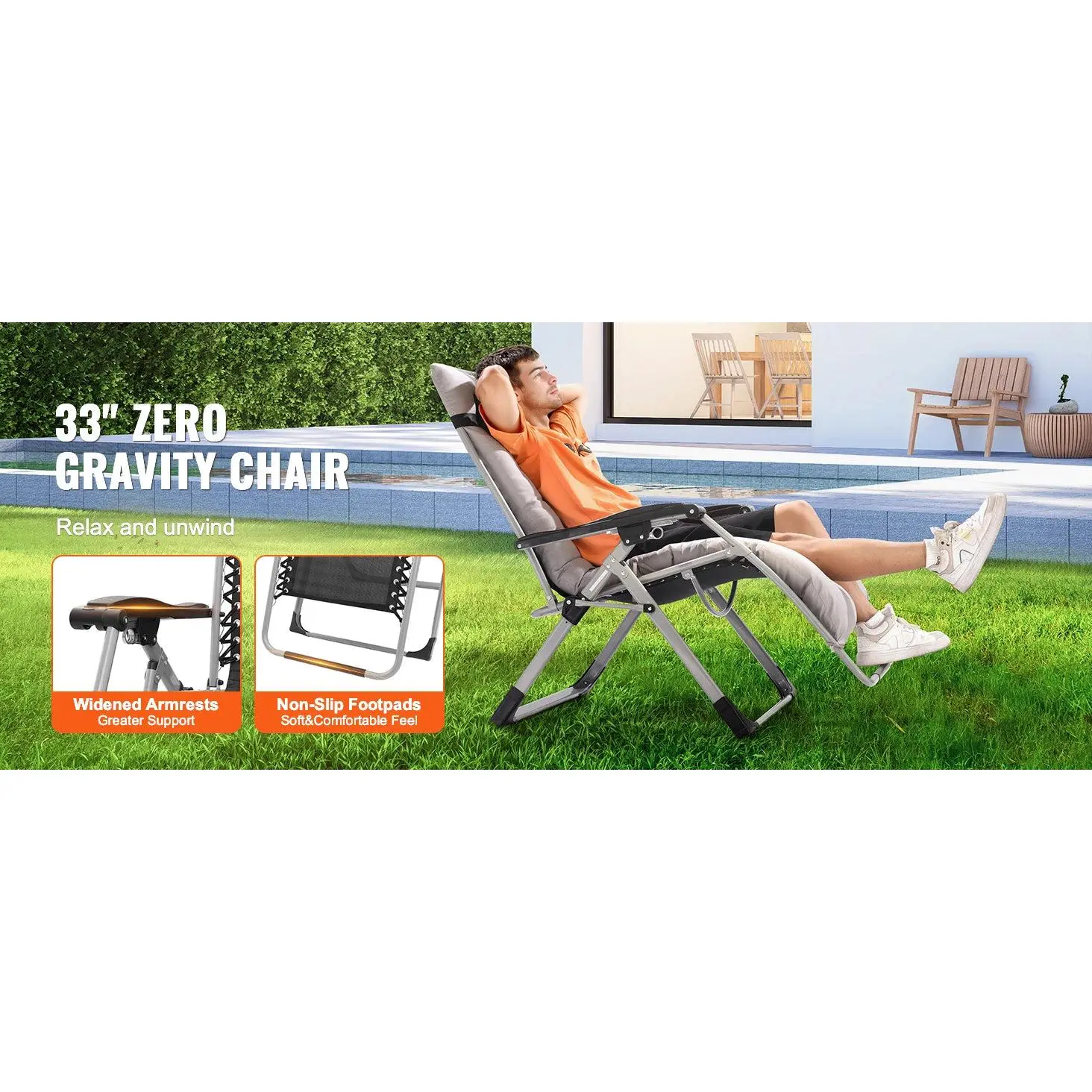 ·500lbs Heavy-Duty Support: Featuring a robust triangular frame, reinforced square steel tubes, 8mm aluminum locks, and double-layer elastic cords, this 33" zero gravity chair offers exceptional stability and supports up to 500lbs. Ideal for users of all sizes.