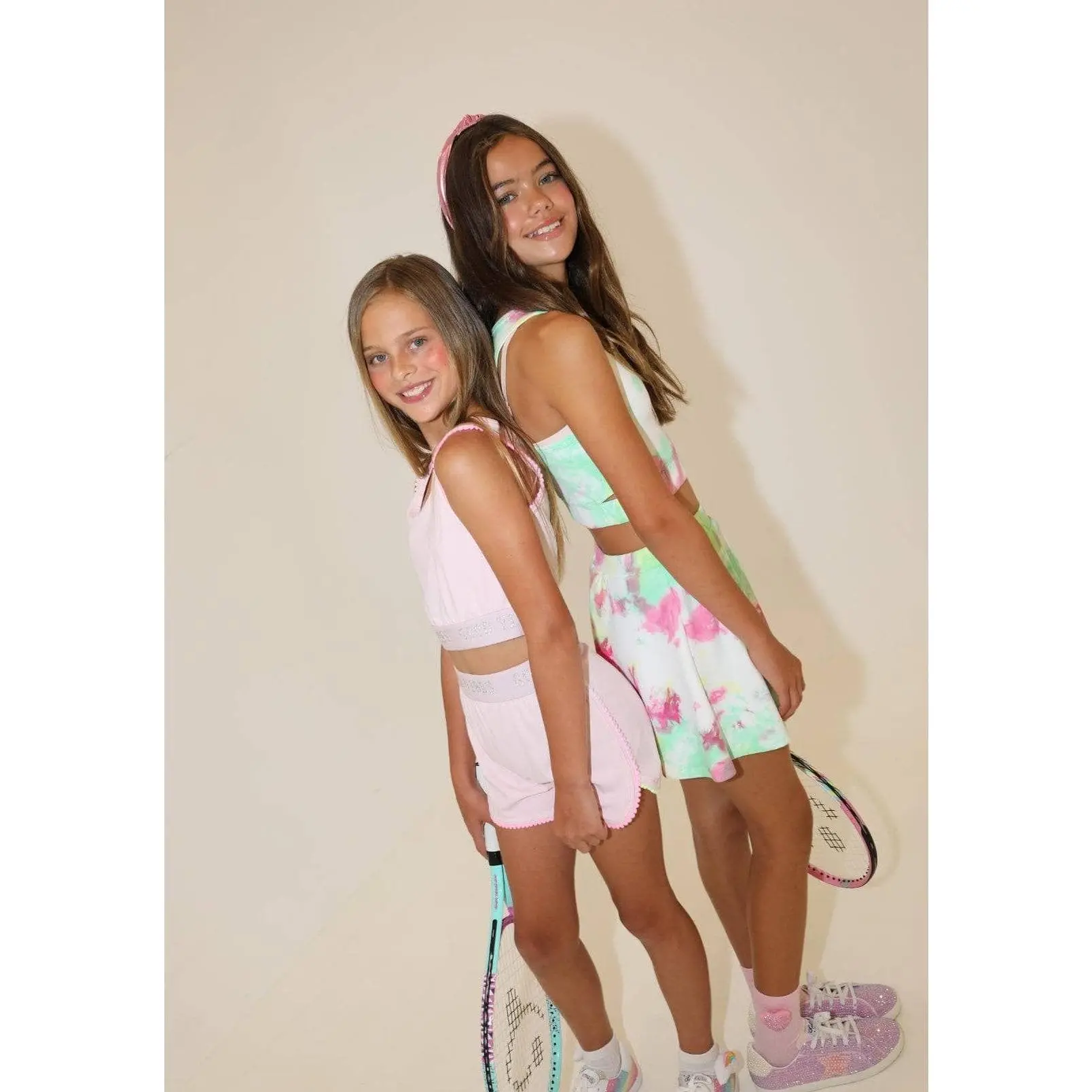 Two-piece tank and skirt set bursting with playful pastel tie-dye print. The fitted crop tank pairs perfectly with a flowy skater skirt featuring built-in shorts—ideal for spinning, skipping, and all-day adventures.
