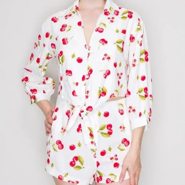 Cherry Set - White Top with Red Cherry Prints, Long Sleeves, V-Neck, and Tie Waist Design