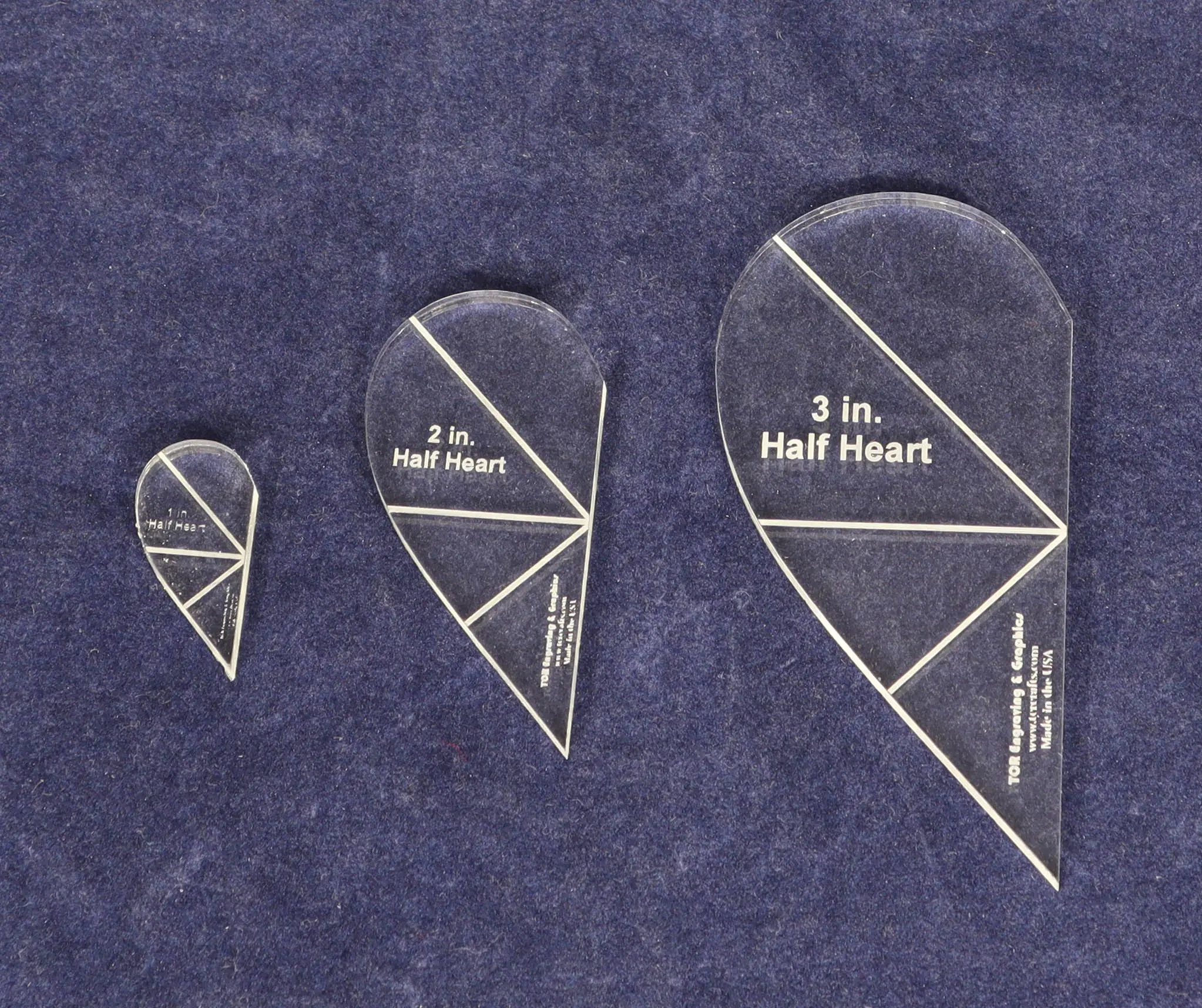 Half Heart Template 3 Piece Set. 1, 2, 3 Inches- Clear 1/8 Inch Thick w/ Guidelines