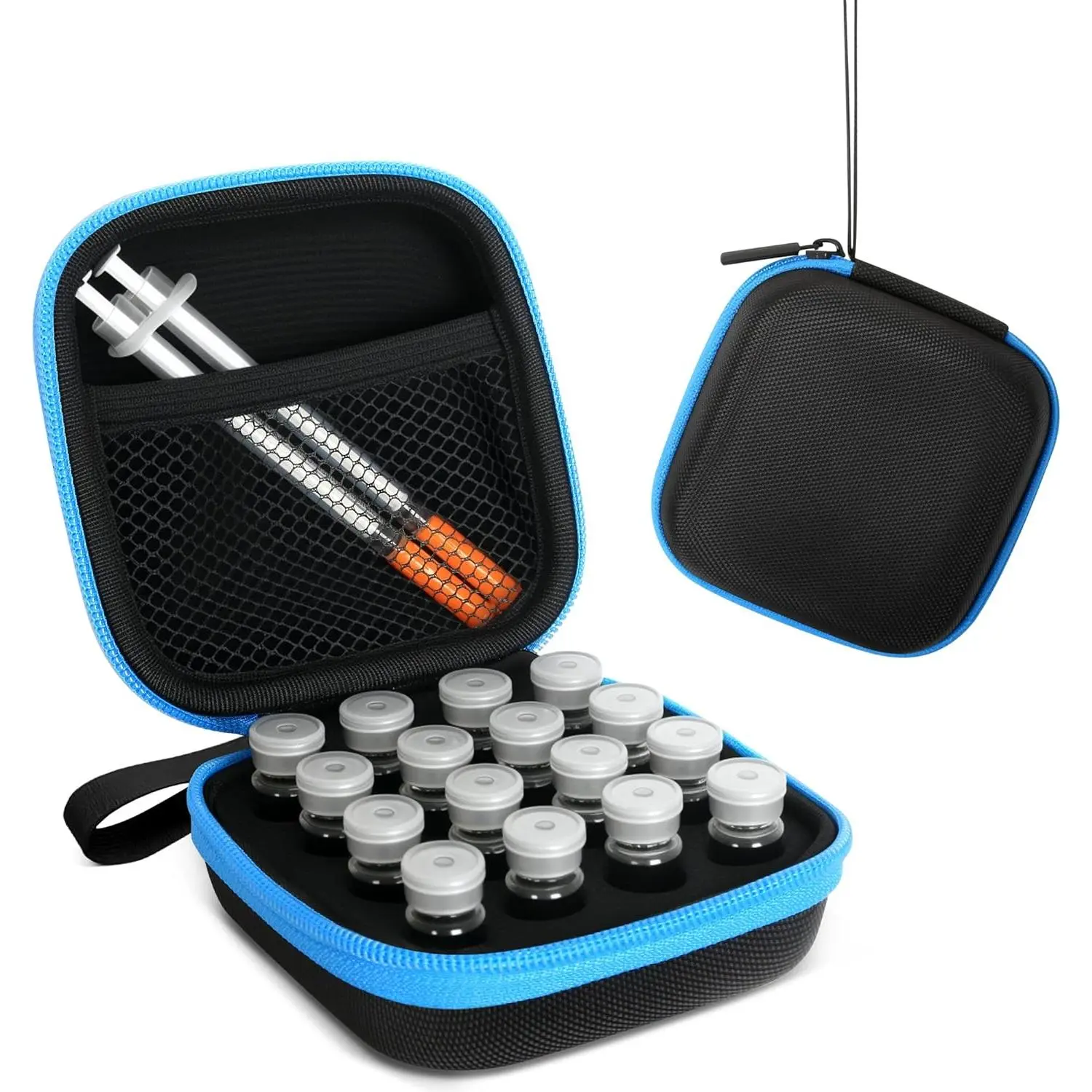 This compact 30-slot case fits 1ml/2ml/3ml vials perfectly, with custom foam slots to stop rattling.Fridge, freezer & travel-friendly - plus a mesh pocket for syringes & wipes.Case only.