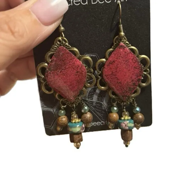 Layers of fuschia teal and wood accent these lovely earrings
