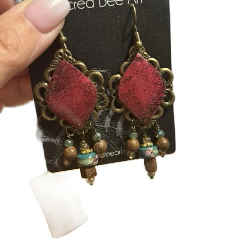 Fuschia Reclaimed Tin Earrings with Beaded Dangles and Intricate Design