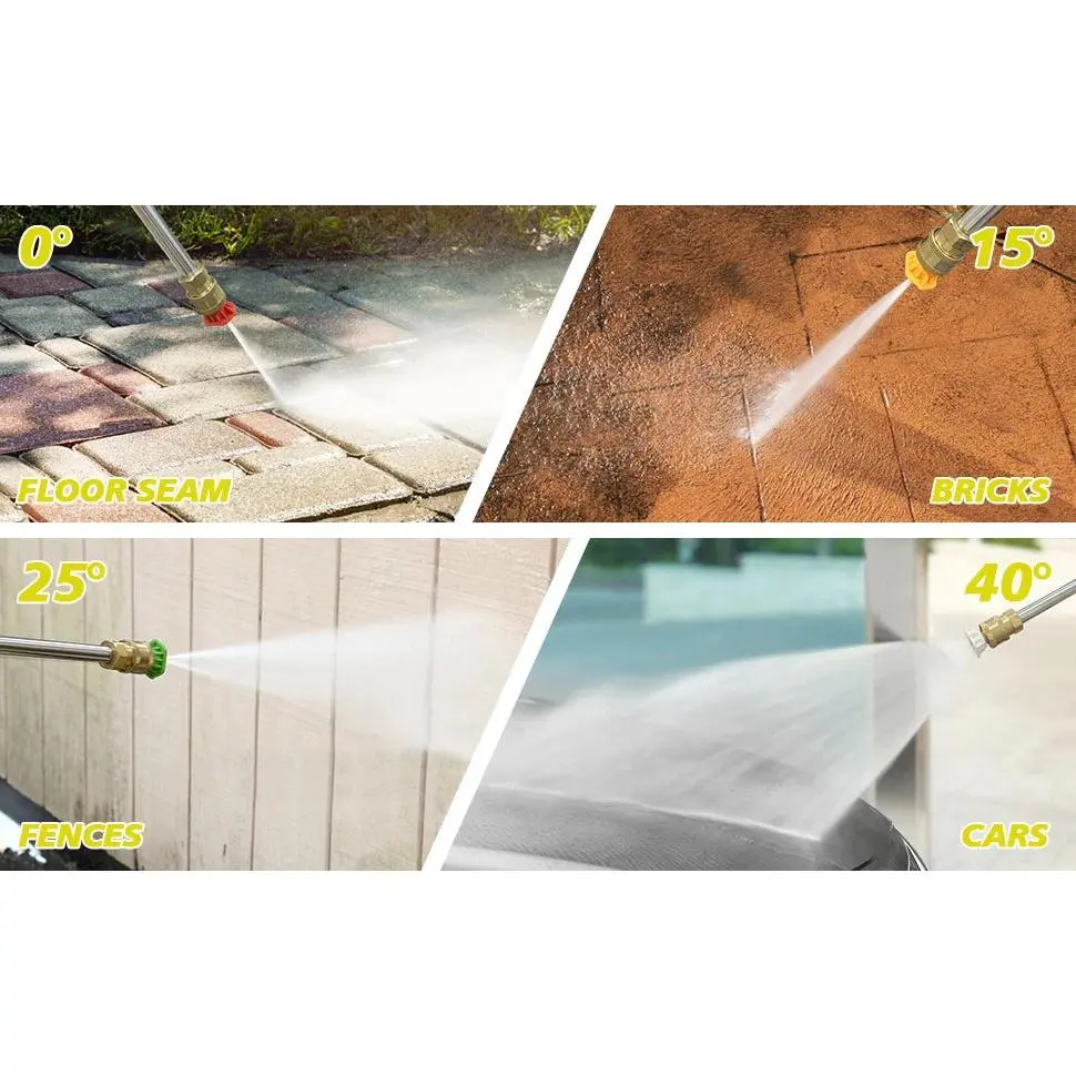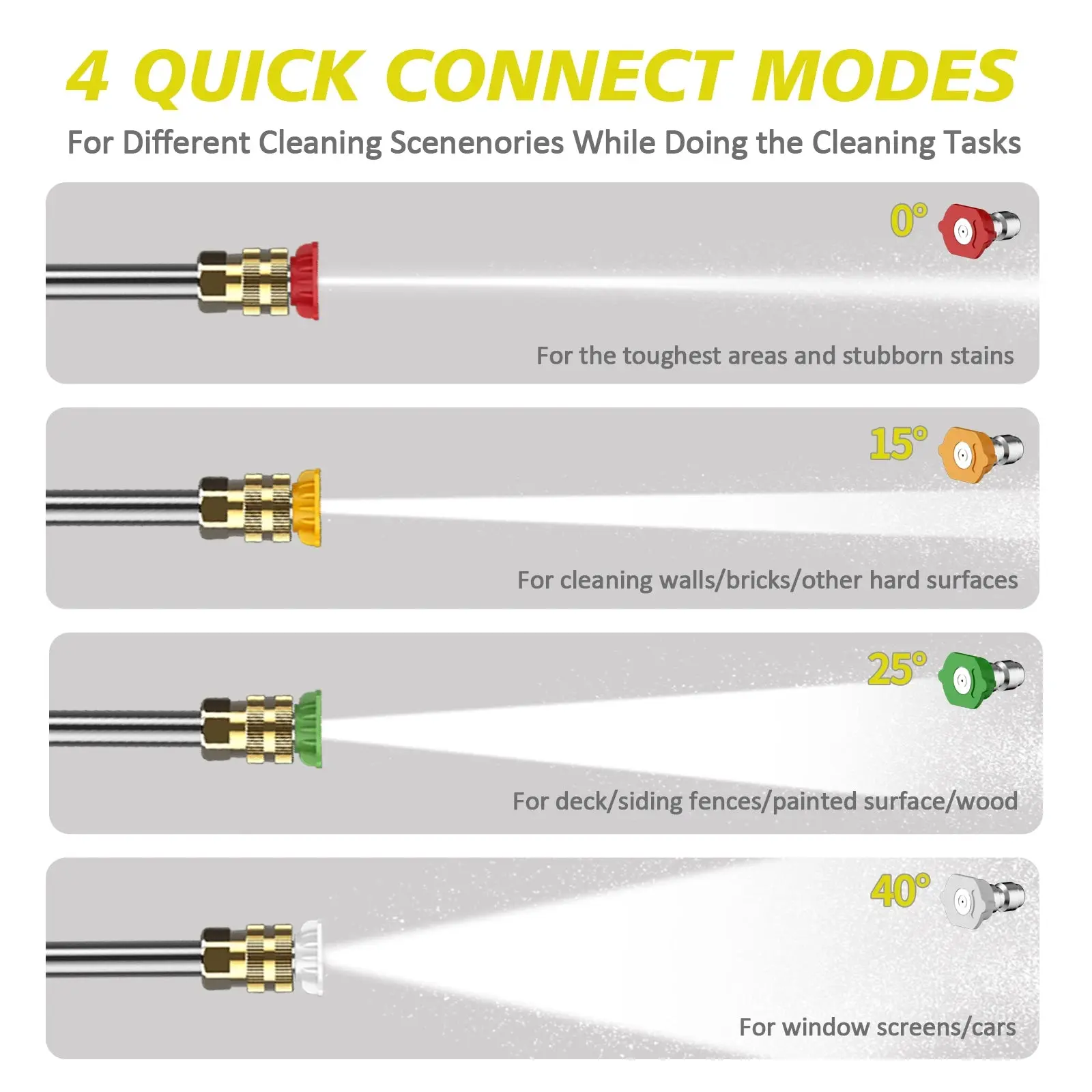 4 Quick-Connect Nozzles: The 0° tip delivers super high pressure for dissolving stubborn substances on hard surface. The 15° tip delivers high pressure for concrete and brick with hard surface. The 25° tip delivers medium pressure for wood decks and viynl sidings with soft surface. The 40° tip provides low pressure for windows and screens with fragile surfaces. The attached foam cannon produces rich bubbles for washing your car. Select the high-pressure nozzle best suited to your task