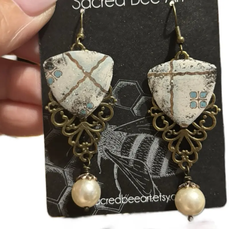 Sacred Bee Reclaimed and Up Cycled Tin Earrings with Unique Leaf Design and pearl beads