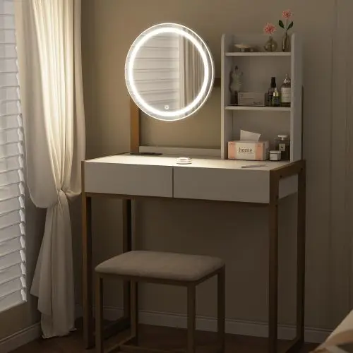 ·【LED Mirror with 3 Lighting Modes】Equipped with a smart LED mirror featuring 3 adjustable lighting modes (warm, natural, and white), this small vanity helps you achieve flawless makeup under any lighting condition. Touch control makes switching light easy and intuitive.